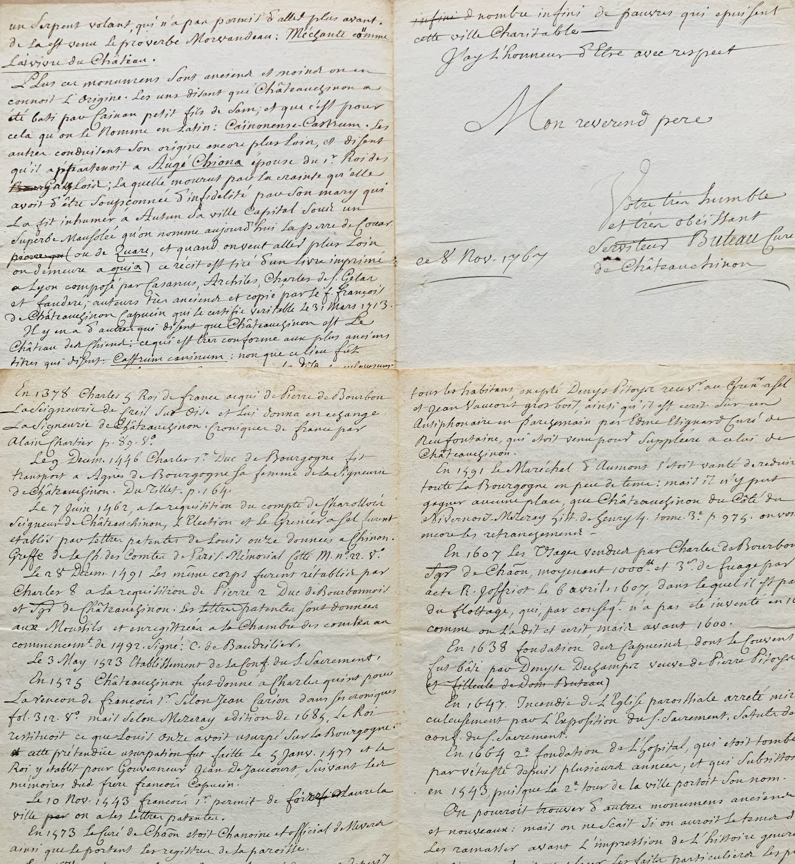 Longue lettre de 1767 du curé de Château-Chinon, faisant un état des lieux de la ville et de ses habitants