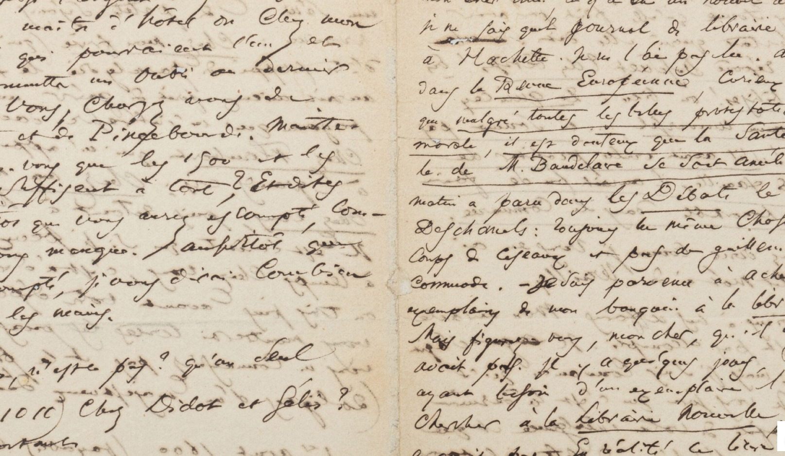 Puis il détaille les billets d’escompte qui devraient pouvoir être payés. "Maintenant, adieu. Je désire bien vivement passer quelques heures avec vous. Le genre humain n’aime plus la conversation. Que je réussisse ou que je ne réussisse pas à vous voir avant votre fuite [à Granville], sans faute, n’est-ce pas ? Nous commencerons les Fleurs, le 15 août, et nous ferons tout en six semaines. C.B." [Il s'agit de la seconde édition des Fleurs du Mal, qui parut en 1861, après que Baudelaire eut cédé tous ses droits de reproduction exclusifs à Poulet-Malassis et son beau-frère Eugène de Broise ; tirée à 1500 exemplaires, tronquée des 6 pièces interdites, mais enrichie de 32 nouveaux poèmes]