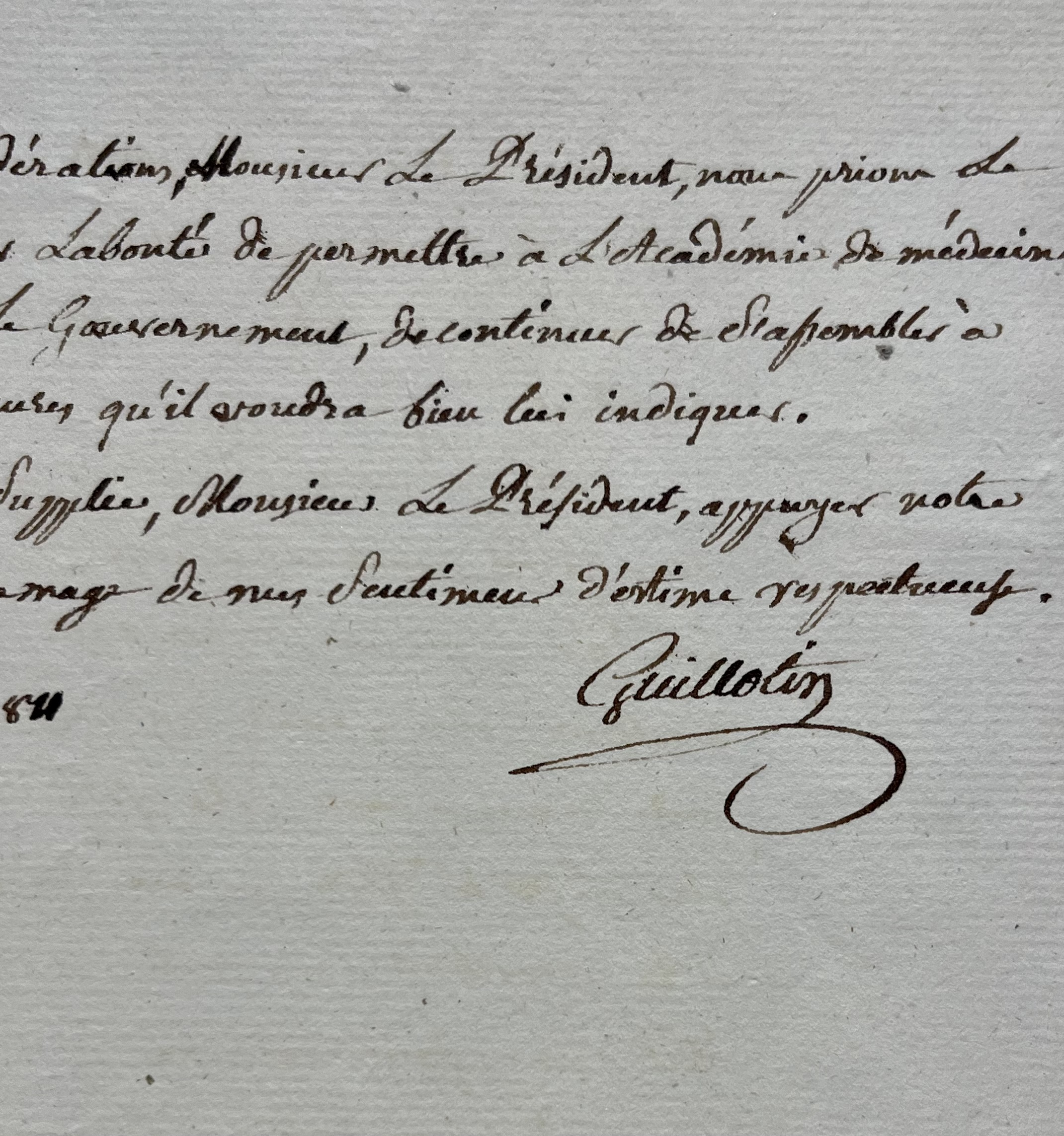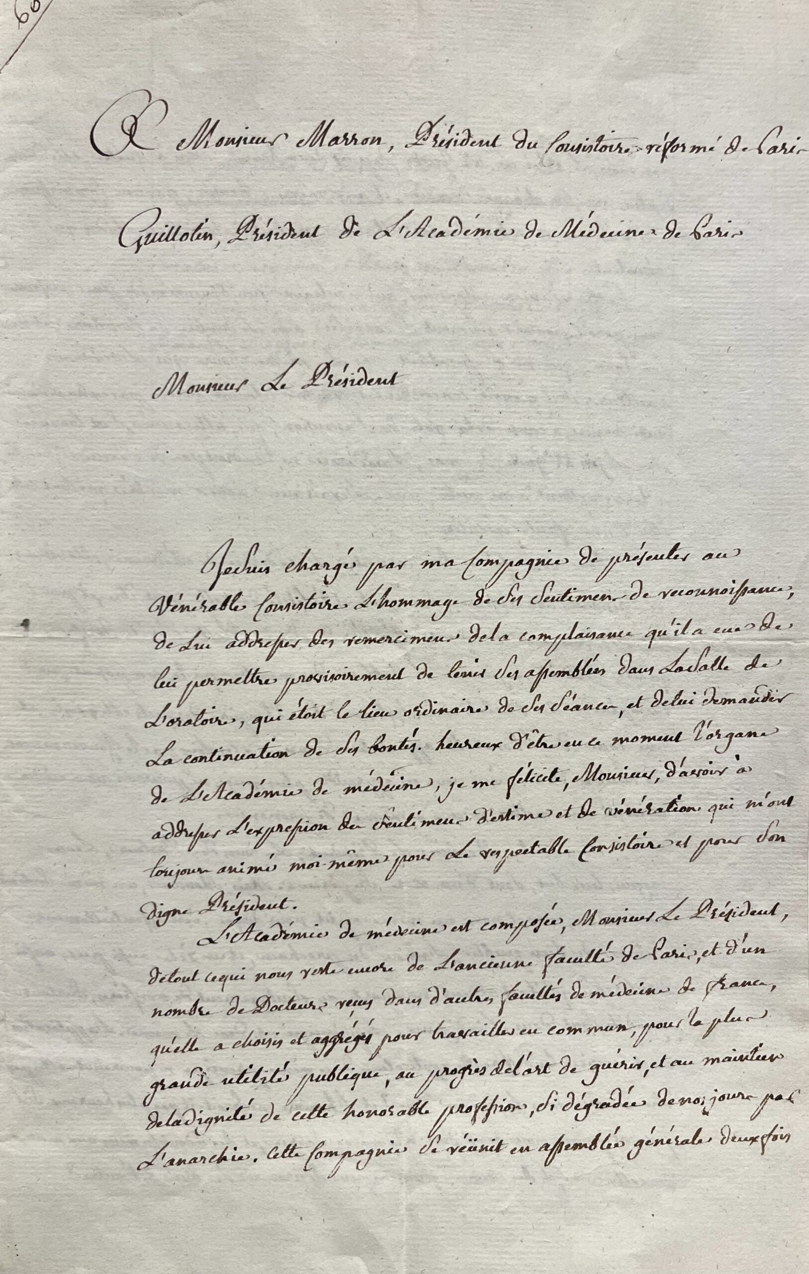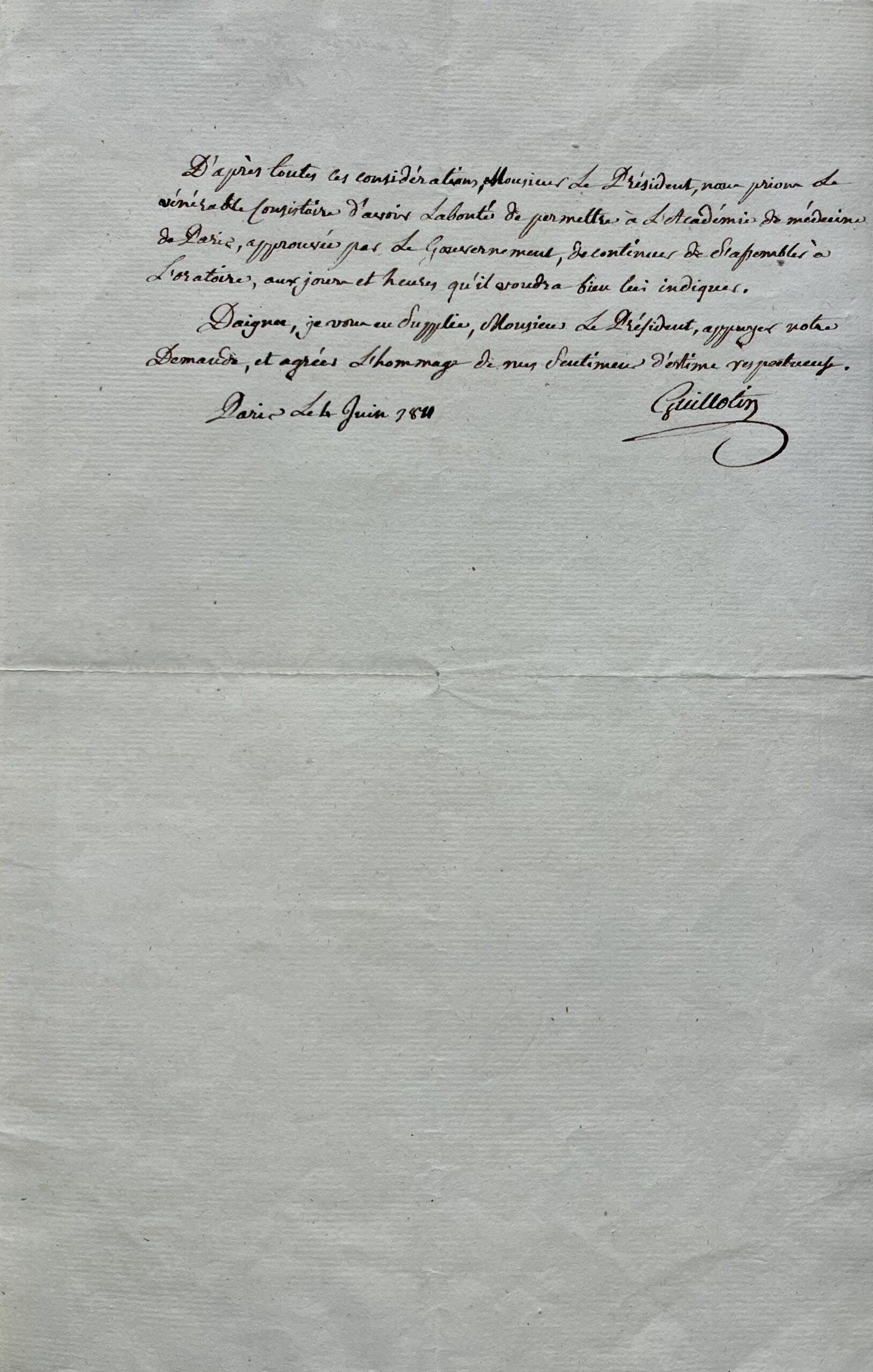 Sans doute, Monsieur le Président, la vue des Pasteurs, leurs moyens, leur but, sont d’un ordre supérieur. Mais, Monsieur, un même sentiment nous anime, vous et nous ; un même esprit nous dirige. C’est essentiellement l’amour du bien public, l’amour du prochain, et un zèle aussi pur, aussi désintéressé qu’il est ardent, nous porte au soulagement de nos frères, surtout quand ils sont dans l’indigence. Le principe est donc le même. L’application seule varie. Les différentes applications de ce même principe ne pourroient-elles pas être réunies dans le même lieu ? Et l’homme ne seroit-il pas plus heureux s’il pouvait puiser, pour ainsi dire à la même source, et des adoucissemens aux maux de cette vie, et des secours puissans pour se procurer les biens de l’autre ? D’après toutes ces considérations, Monsieur le Président, nous prions le vénérable Consistoire d’avoir la bonté de permettre à l’Académie de Médecine de Paris, approuvée par le Gouvernement, de continuer de s’assembler à l’Oratoire, aux jours et heures qui voudra bien indiqué. Daignez, je vous en supplie, Monsieur Le Président, appuyer notre demande, et agréer l’hommage de mes sentiments d'estime respectueuse. Guillotin".