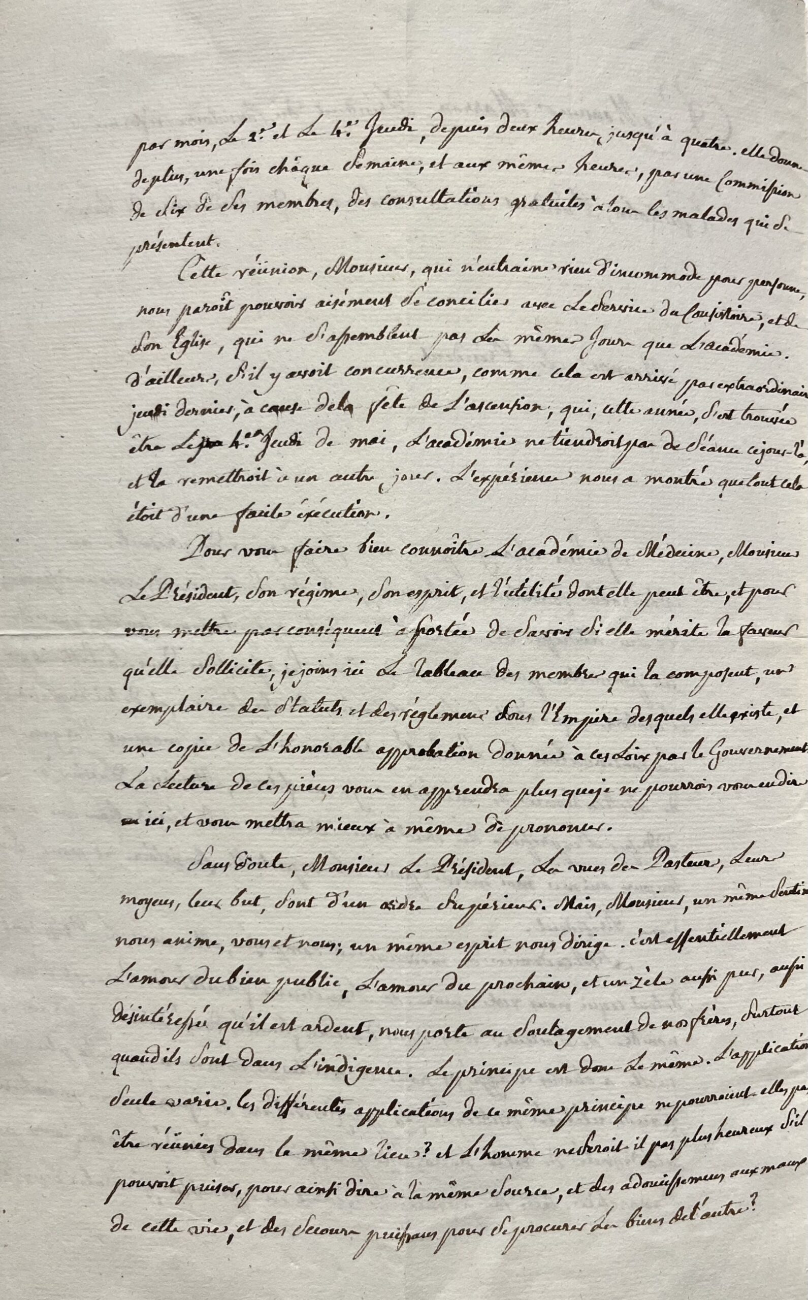 L’Académie de médecine est composée, Monsieur le Président, de tout ce qui nous reste encore de l’ancienne faculté de Paris, et d’un nombre de Docteurs reçus dans d’autres faculté de Médecine de France, qu’elle a choisis et aggrégés pour travailler en commun, pour la plus grande utilité publique, au progrès de l’art de guérir, et au maintien de la dignité de cette honorable profession, si dégradée de nos jours par l’anarchie. Cette compagnie se réunit en assemblée générale, deux fois par mois, le 2e et le 4e jeudi, depuis deux heures, jusqu’à quatre. Elle donne de plus, une fois chaque semaine, et aux mêmes heures, par une commission de six de ses membres, des consultations gratuites à tous les malades qui se présentent. Cette réunion, Monsieur, qui n’entraîne rien d'incommode pour personne, nous paroît pouvoir aisément se concilier avec le service du Consistoire, et de son église, qui ne s’assemblent pas les mêmes jours que l’Académie. D’ailleurs, si il y avoit une concurrence, comme cela est arrivé par extraordinaire, jeudi dernier, à cause de la fête de l’Ascension, qui, cette année, s’est trouvée être le 4e jeudi de mai, l’Académie ne tiendroit pas de séance ce jour là, et la remettroit à un autre jour. L’expérience nous a montré que tout cela était d’une facile exécution.