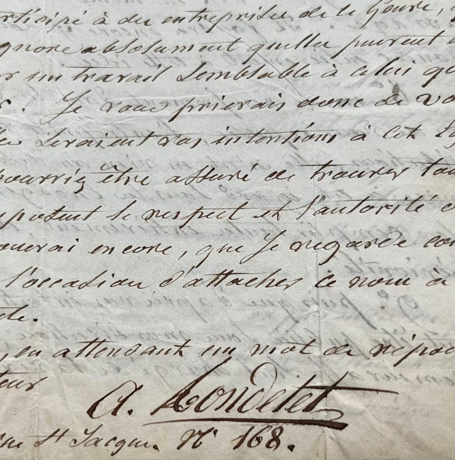 Longue lettre d'Antoine Rondelet (1785-1863) consacrée à l’étude critique du Traité de l’art de la charpente, de Jean-Charles Krafft, paru la première fois en 1821 et dont son correspondant prépare une nouvelle édition. « Conformément aux ouvertures que vous avez bien voulu me faire au sujet de la nouvelle édition de la charpente de Krafft, que vous vous proposez de publier, j’ai jeté un nouveau coup d’œil sur cet ouvrage, et j’ai l’honneur de vous soumettre les réflexions que cet examen m’a suggéré ». Il développe longuement, en 12 points, les fruits de son analyse.