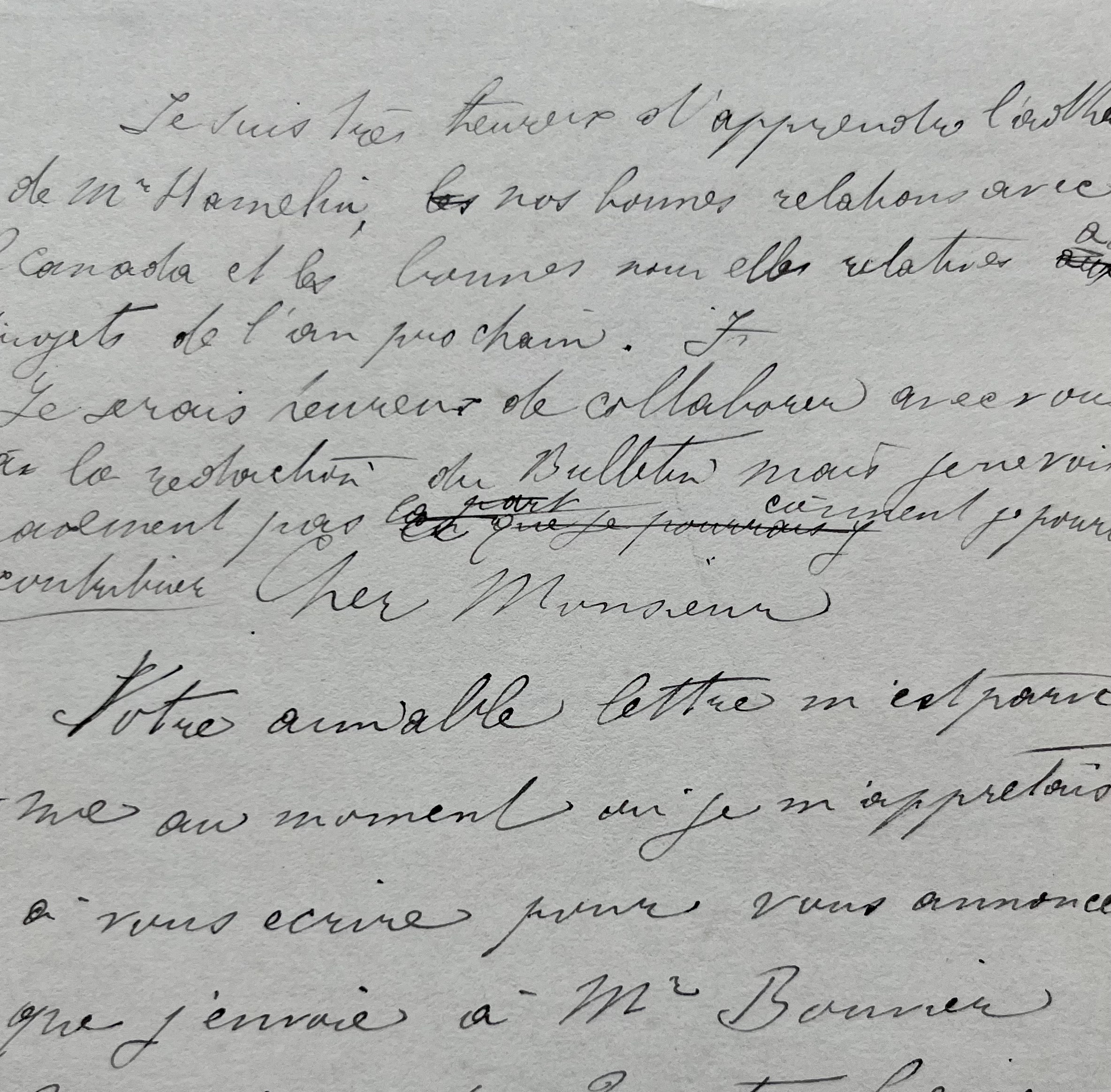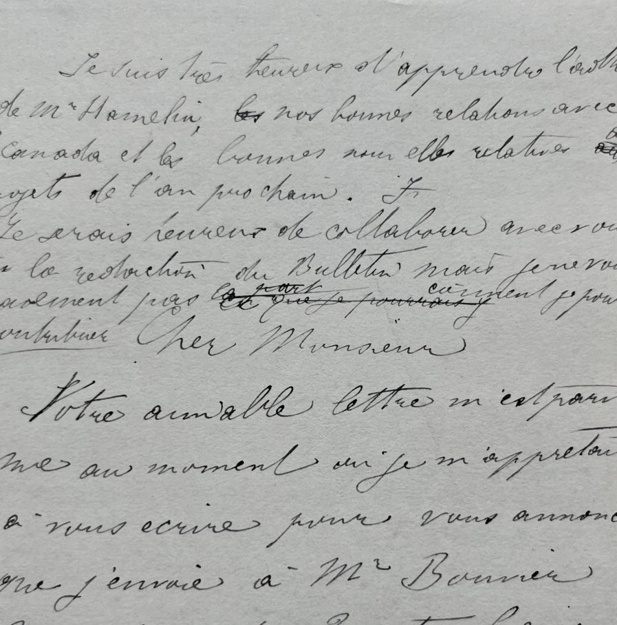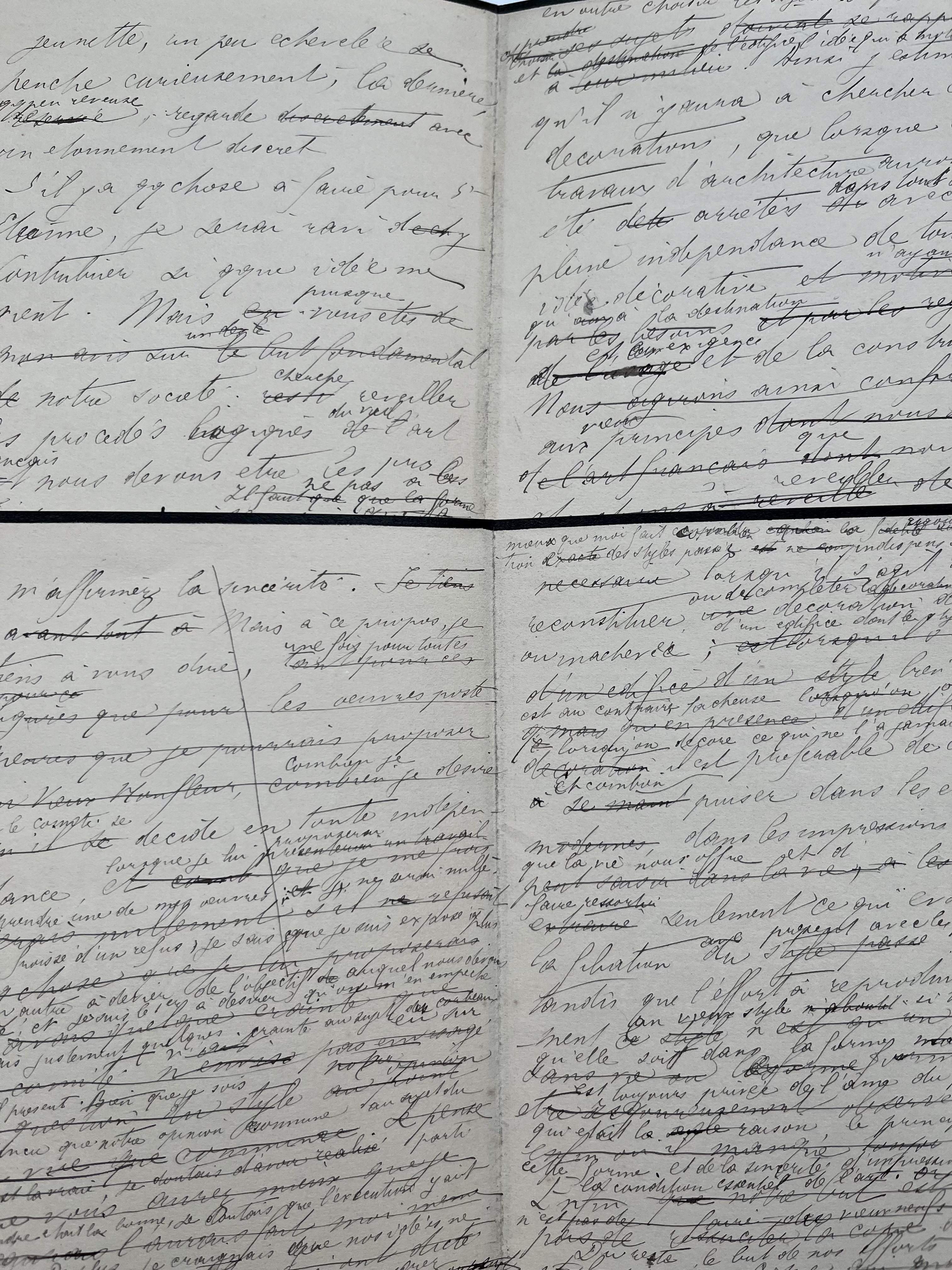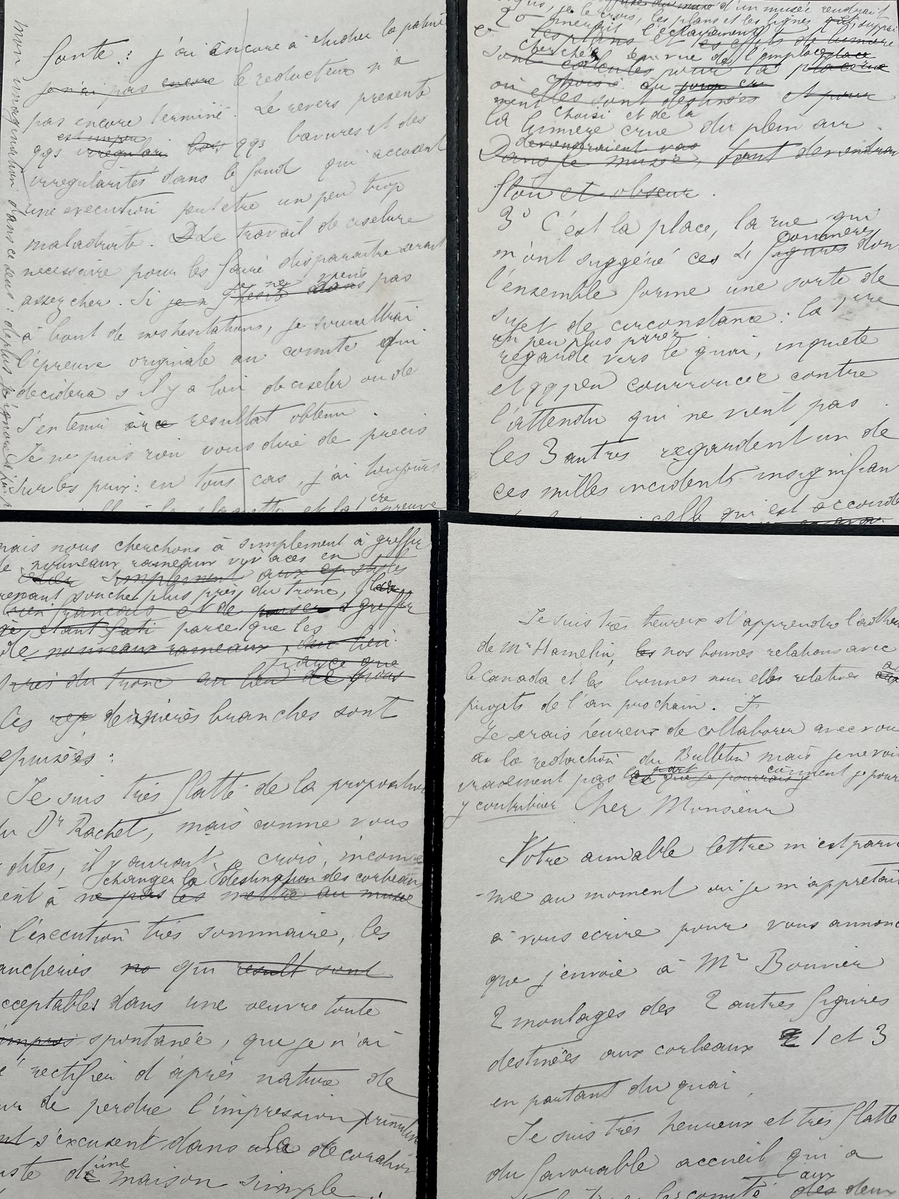 Long brouillon de lettre d'un sculpteur et médailleur non identifié, sur la restauration de l'église Saint-Etienne de Honfleur pour y accueillir un musée. «[…] j'envoie à M. Bouvier 2 moulages des 2 autres figures destinées aux corbeaux 1 et 3 en partant du quai. Je suis très heureux et très flatté du favorable accueil qui a été fait par le comité aux deux premières figures […]. Je tiens à vous dire, une fois pour toutes, que pour les oeuvres postérieures que je pourrais proposer au Vieux Honfleur, combien je désire que le comité se décide en toute indépendance […]». L'auteur de la lettre détaille longuement la manière dont il envisage la décoration de l'édifice, entre modernité, respect de l'histoire et contraintes d'un musée. «[…] 3° C'est la place, la rue qui m'ont suggéré ces 4 figures commères dont l'ensemble forme une sorte de sujet de circonstance: la 1ère un peu plus parée regarde vers le quai, inquiète et qq. peu courroucée contre l'attendu qui ne vient pas. Les 3 autres regardent un de ces mille incidents insignifiants de la rue; celle qui est accoudée (2ème) observe avec une indifférence apparente: elle doit être mauvaise langue […]. S'il y a quelque chose à faire pour St Etienne, je serai ravi d'y contribuer […]».