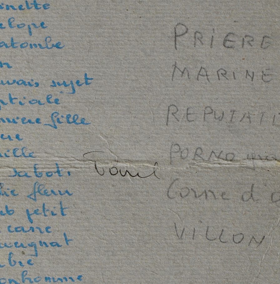 Longue liste de chansons, de la main de Brassens : Gorille, Auvergnat, Pornographe, Mauvais sujet, etc