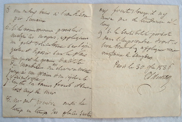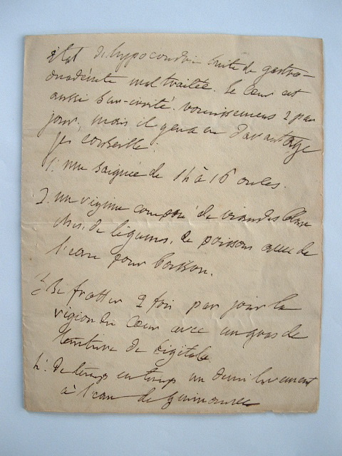 Broussais dresse tout d'abord un diagnostic : «Etat d'hypocondrie suite de gastro- duodénite maltraitée. Le coeur est aussi sous-irrité. Vomissements 2 par jour, mais il y en a eu davantage». Il prescrit ensuite un traitement en 9 points : saignée, régime, frictions, lavements, bains, sangsues, etc.