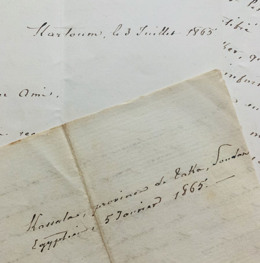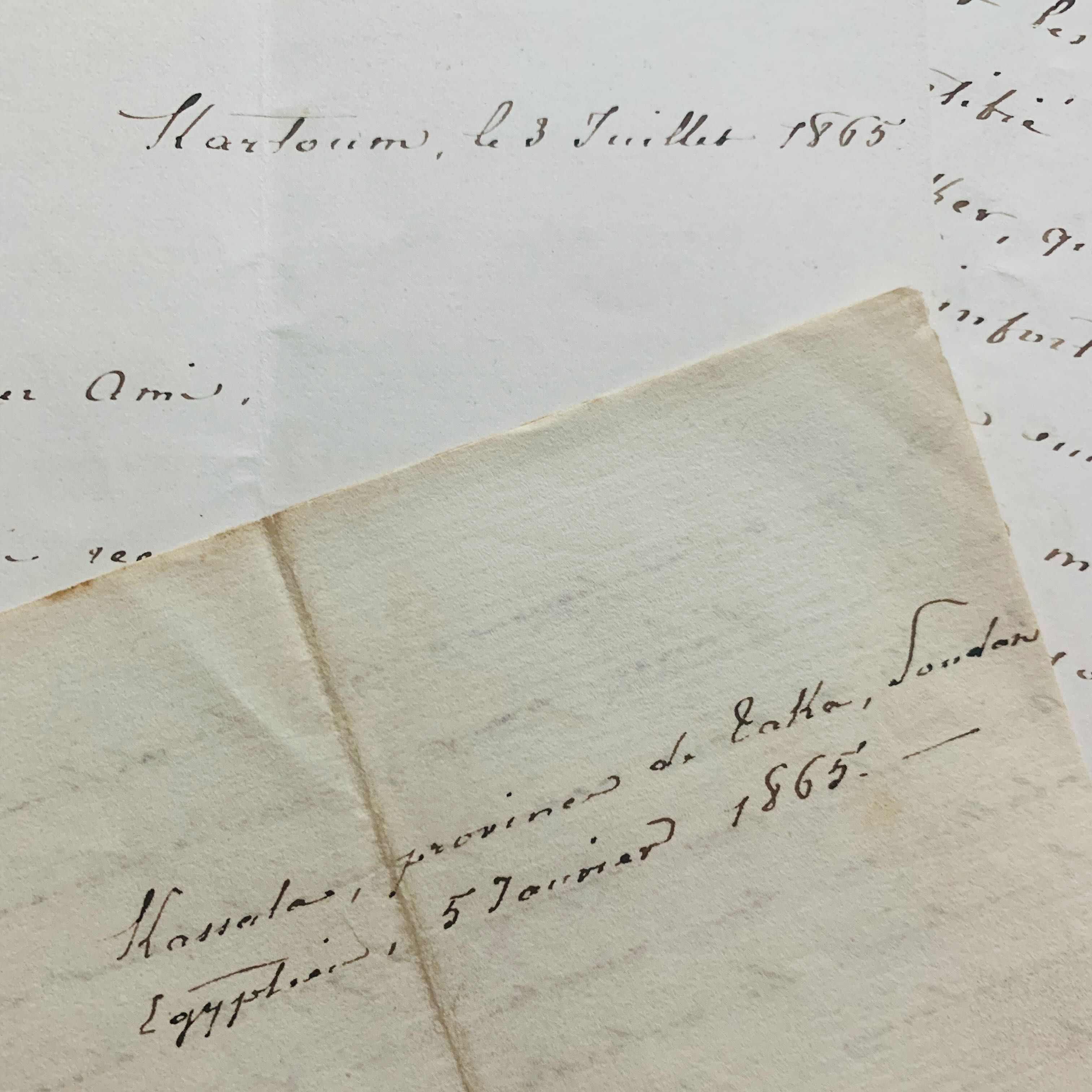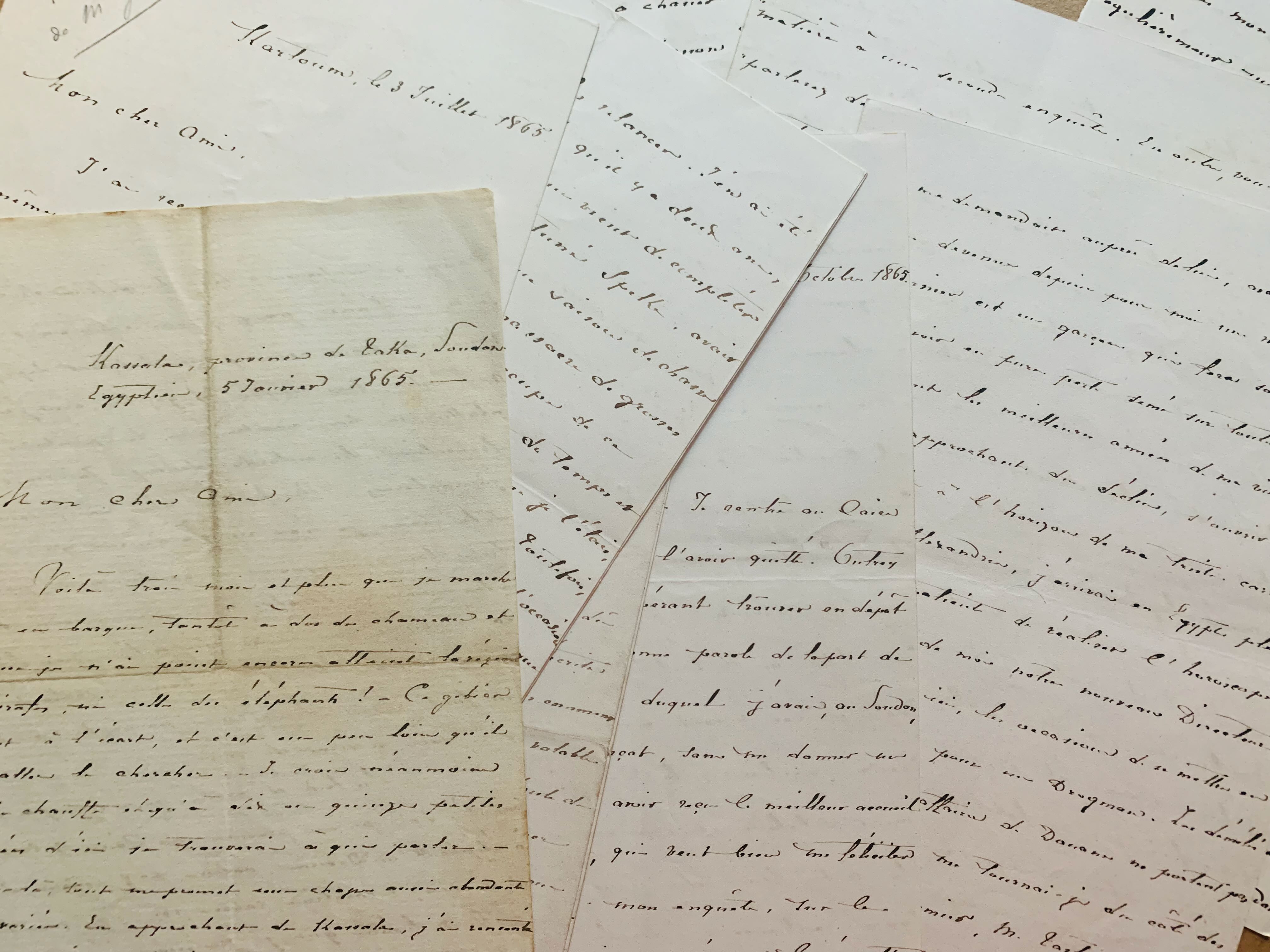 Longue et très intéressante correspondance de Benoit Garnier sur sa mission au Soudan, la chasse aux animaux sauvages, et l'enquête menée sur la traite des Noirs en Afrique de l'est.