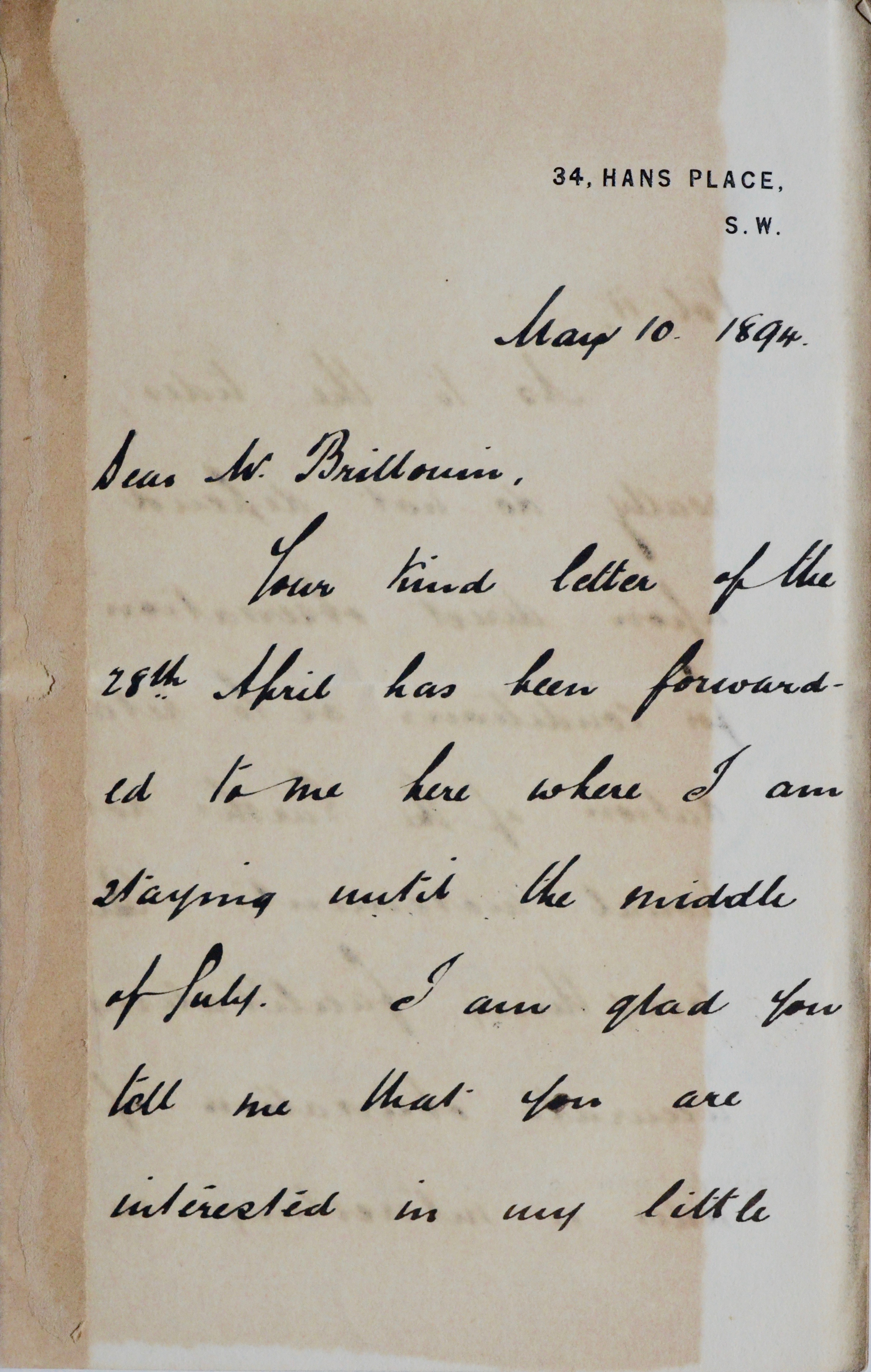Encre noire sur double feuillet de papier vergé filigrané. En-tête imprimé "34,Hans Place, S.W.".
