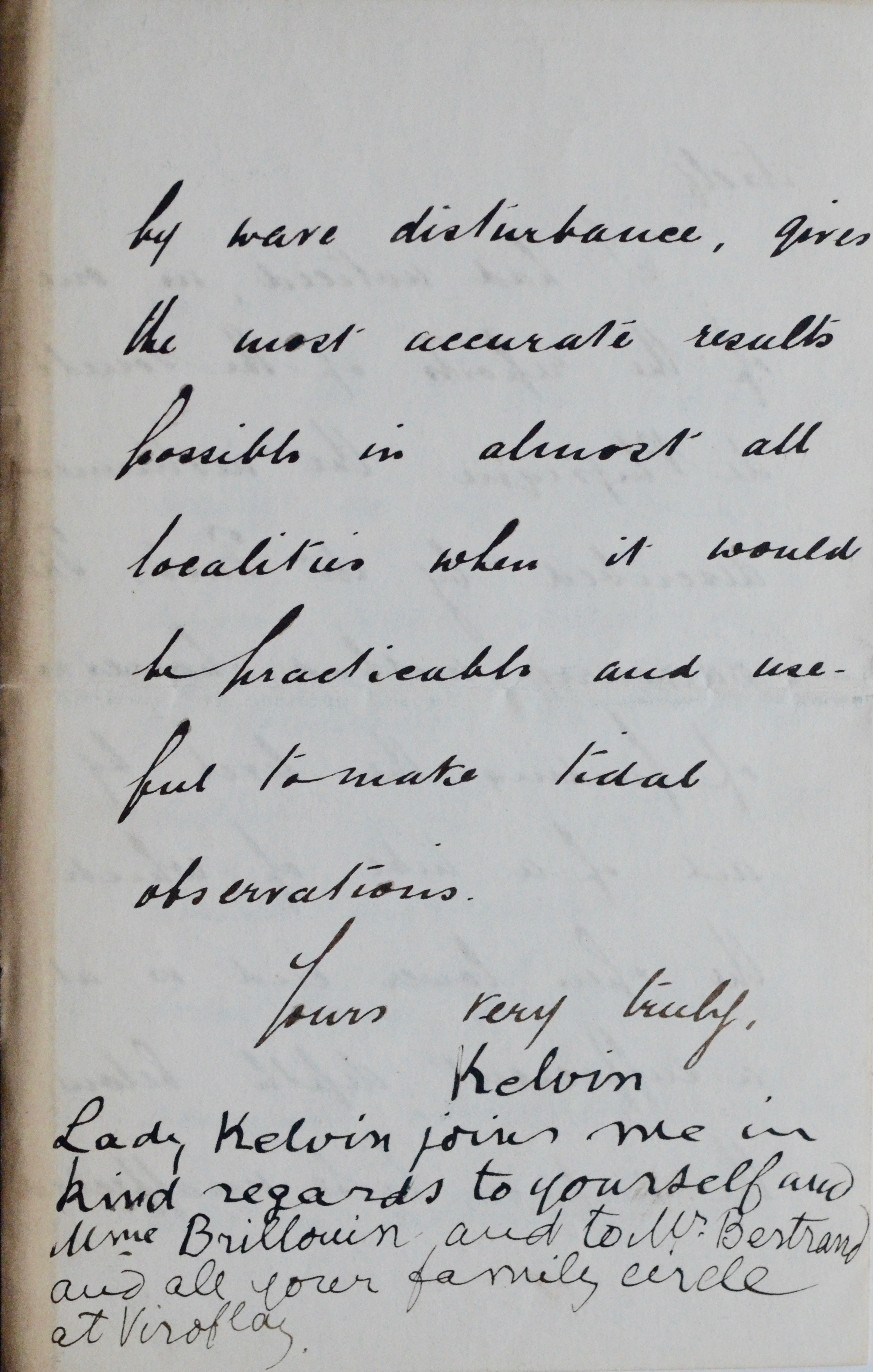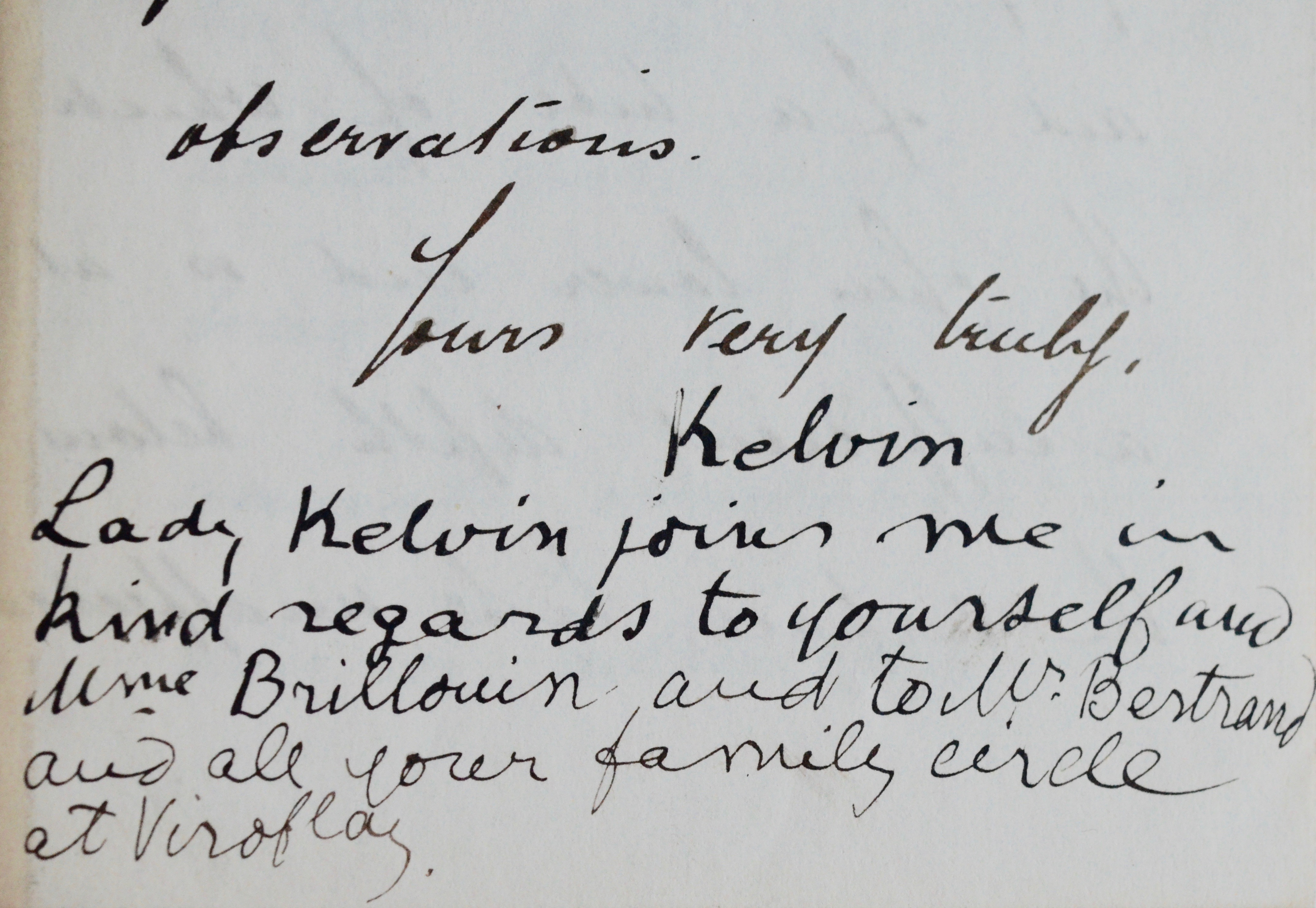 Kevin ajoute de sa main "Lady Kelvin joins me in kind regards to yourself and Mme. Brillouin ans to M. Bertrand and all your family circle at Viroflay".