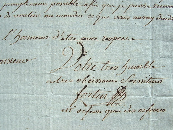 Deux lettres de l'orfèvre-joaillier Jean Alexandre Fortin "M. orfèvre quai des orfèvres," au sujet du paiement d'une commande.