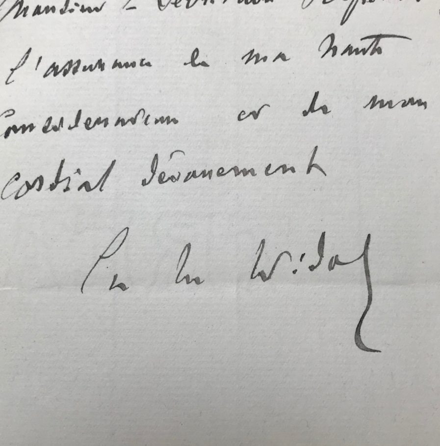 "Rien ne saurait plus me toucher que la proposition de succéder au très réputé M. Daumet [l'architecte Honoré Daumet (1826-1911)] dans la commission Clément Juglar [(1819-1905), économiste] : commémoration des membres défunts à St Germ. des Près. J'accepte avec une très vive gratitude. Voulez-vous être mon interprète auprès de vos collègues éminents (dont plusieurs sont mes amis) [...]".