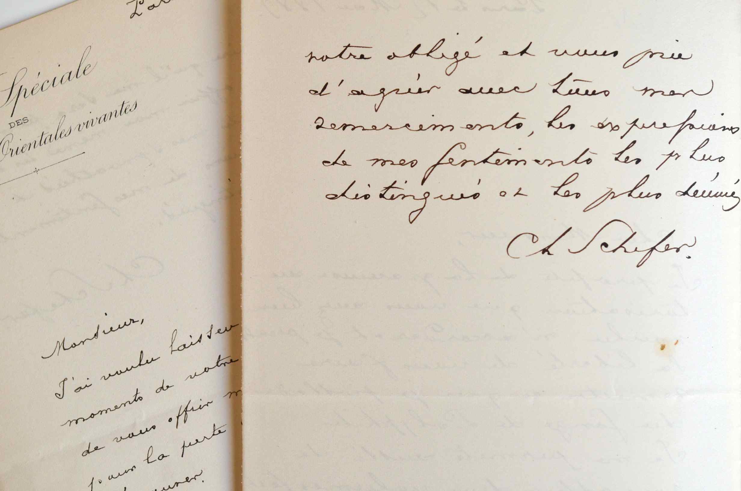 Charles Schefer (Paris, 1820/1898)Charles Schefer adresse à Popelin tout ce que qu'il possède du Songe de Poliphile [Popelin fit une luxueuse traduction de ce roman médiéval de Francesco Colonna en 1883]. "Je me permets aussi de vous offrir deux volumes fort modestes dont je vous prie d'agréer l'hommage. Ce sont les seuls que je possède en ce moment et je sollicite pour eux et pour leur éditeur toute votre bienveillance". Dans une seconde lettre, il adresse ses condoléances à Gustave Popelin après la mort de Claudius. "Personne ne prend part plus que moi aux regrets qu'excite la perte que vous venez de faire. J'avais voué à monsieur votre père les plus vifs sentiments d'estime et de dévouement et je suis désolé de ne plus pouvoir les lui témoigner [...]".