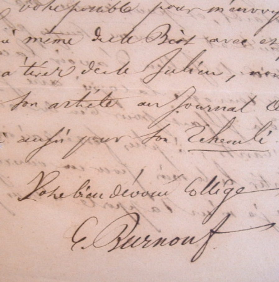 Eugène Burnouf (Paris, 1801/1852)Une erreur s'est glissée dans le mémoire de Biot, qui doit être publié dans le Journal asiatique. Burnouf demande à Rousseau qu'il se mette en relation avec l'orientaliste Stanislas Julien. «Je m'en rapporte à vous pour lui faire cette demande de façon qu'il lui soit impossible de supposer qu'on a la prétention de réviser le fonds, c. à d. le chinois, après lui. Ma révision doit être ici plus attentive que de coutume, à cause de cette circonstance que l'auteur était un confrère qui nous a été enlevé avant le temps». Il demande qu'on lui adresse également les épreuves de son Tcheou Li. (Edouard Constant Biot (1803/1850), sinologue, fils de l'astronome).