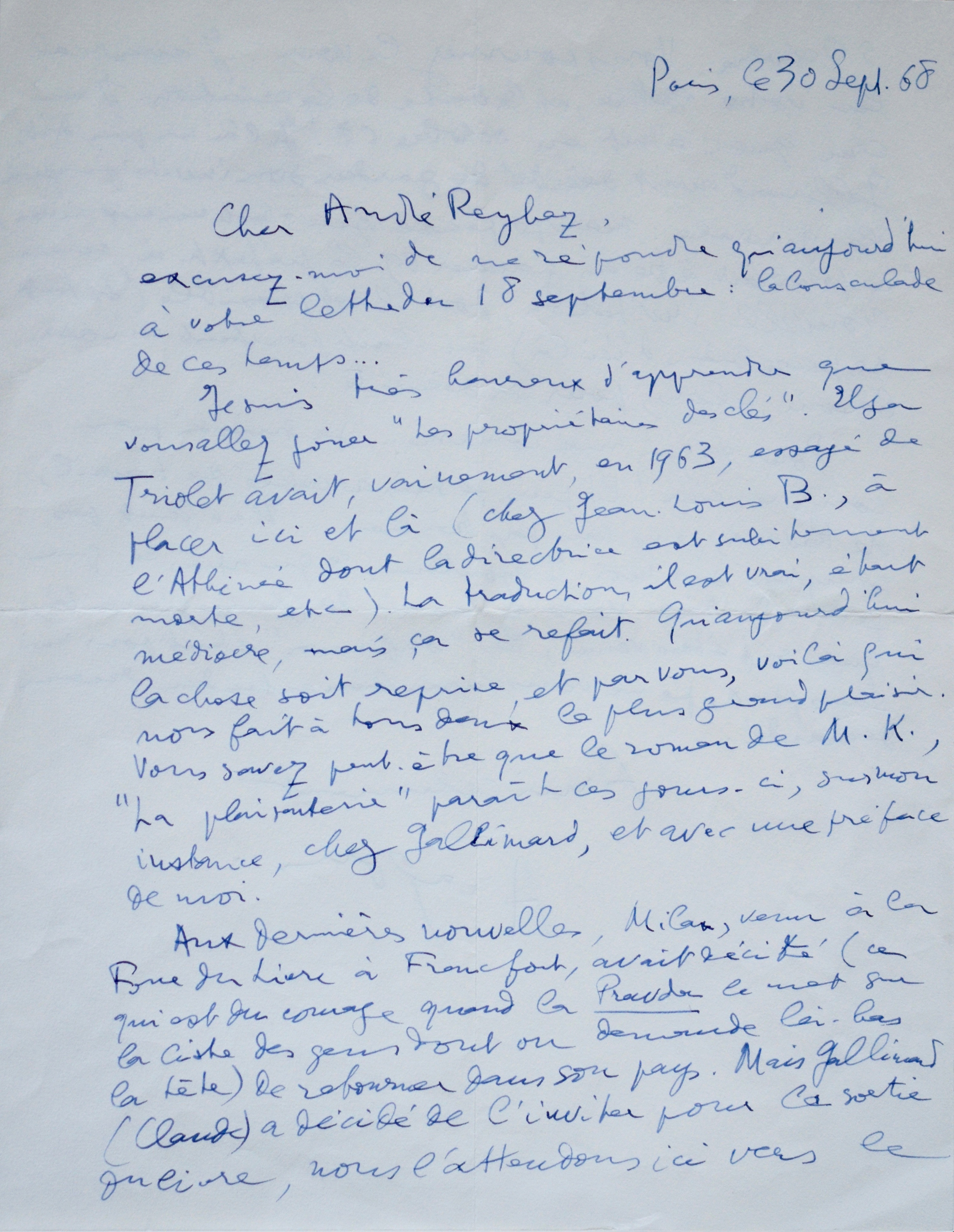 "[...] Elsa Triolet avait, vainement, en 1963, essayé de placer ici et là (chez Jean Louis B.[Barreau], à l’Athénée dont la directrice est subitement morte, etc). La traduction, il est vrai, était médiocre, mais ça se refait. Qu’aujourd’hui la chose soit reprise, et par vous, voilà qui nous fait à tous deux le plus grand plaisir. Vous savez peut-être que le roman de M. K. "La Plaisanterie" paraît ces jours-ci, sur mon instance, chez Gallimard, et avec une préface de moi. Aux dernières nouvelles, Milan, venu à la Foire du livre à Franckfort, avait décidé (ce qui est du courage quand la Pravda le met sur la liste des gens dont on demande là-bas la tête) de retourner dans son pays". Pour sa sécurité et pour le maintenir en France, Gallimard a prétexté la nécessité de plusieurs invitations pour la sortie du livre. "Pour ce qui me concerne... Je suis si peu conférencier ! Et puis je suis accablé de travail, de travaux, je ne vais pas très bien... Il ne faut pas compter sur moi. J'ajouterai, ce qui après ce que je viens de dire vous a un air de fausse générosité, que si j'étais venu, les "conférences" étant pour moi sans prix, je ne vous aurais bien entendu rien demandé [...]".