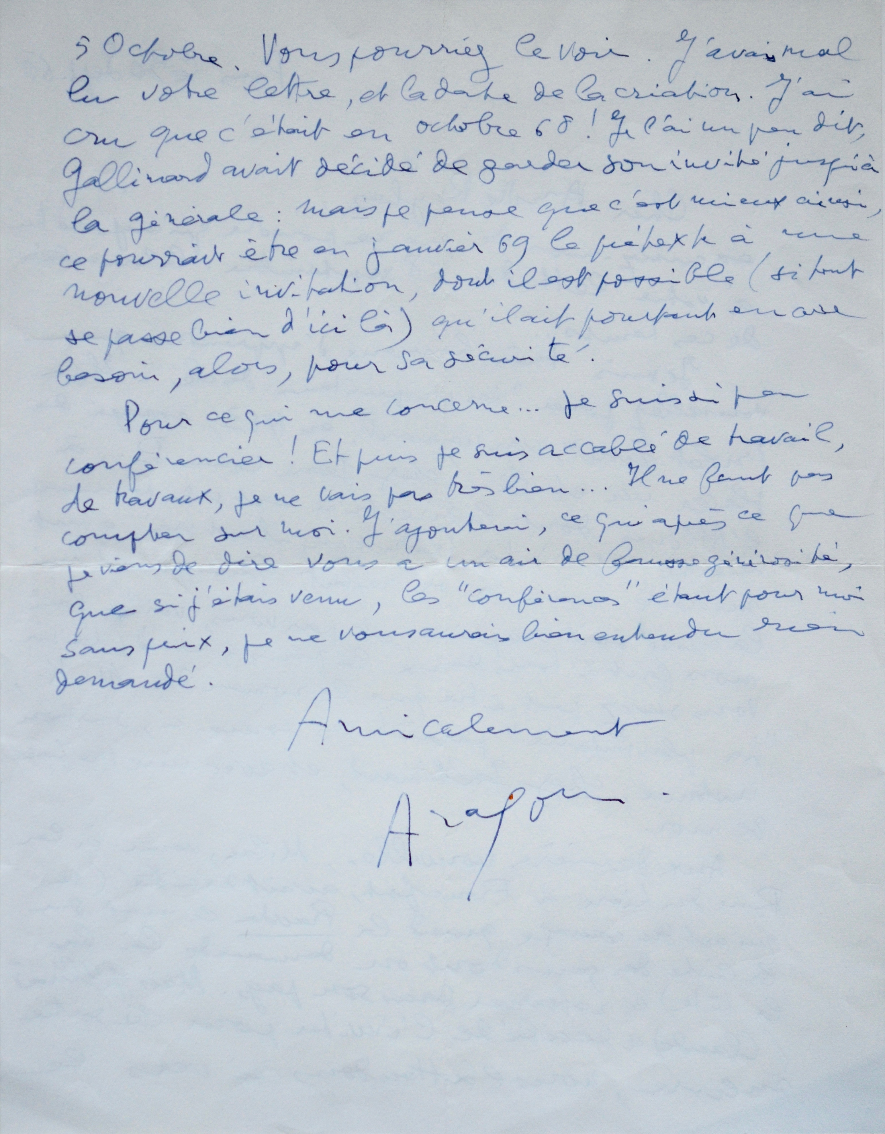 Louis Aragon (Paris, 1897/1982)Type de document : lettre autographe signée