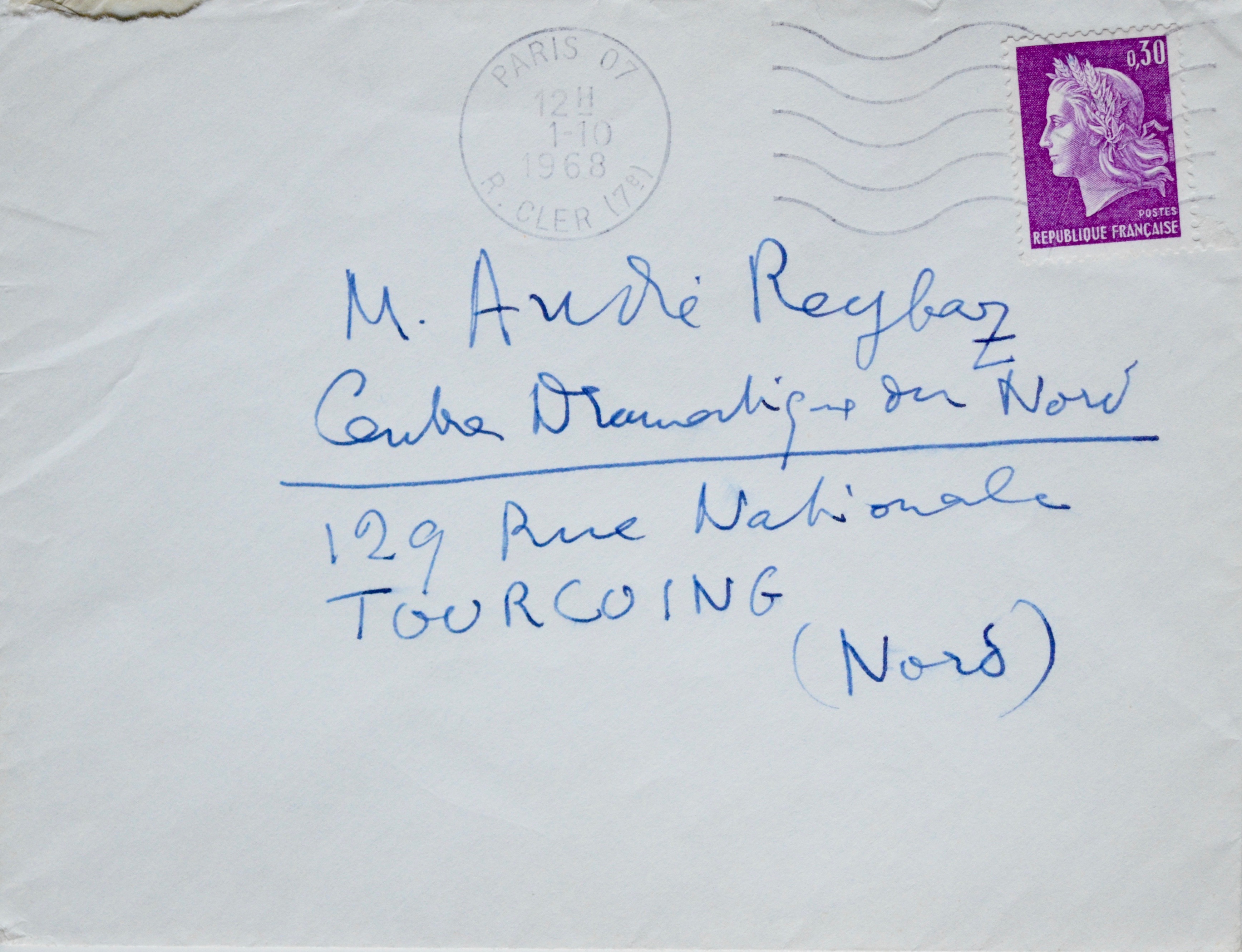 Très belle lettre de Louis Aragon, adressée à l’artiste et metteur en scène André Reybaz.
