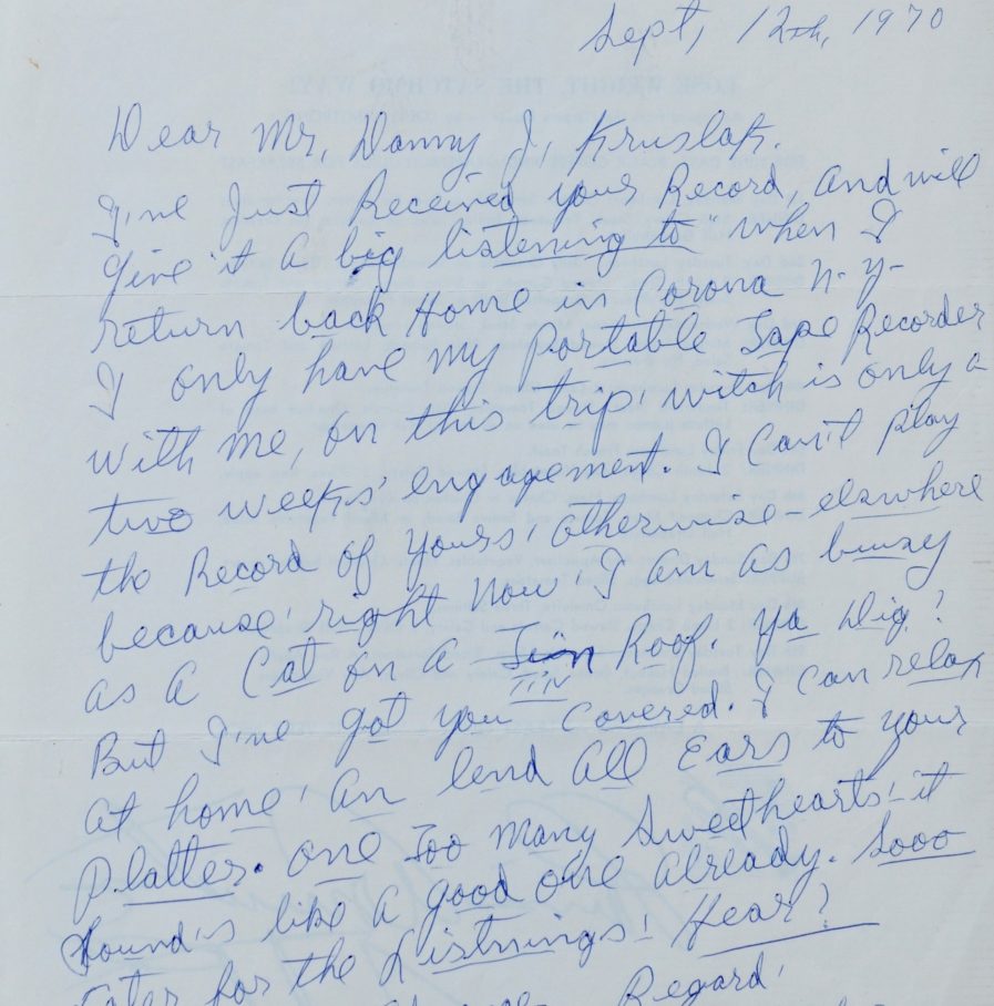 "I've received your record and will give it a big listening to when I return back home in Corona N.Y. I only have my portable Tape Recorder with me, on this trip, witch is only a two weeks' engagement. I can't play the Record of yours' otherwise - elsewhere because, right now, I am as busy (?) as a Cat on a Tin Roof [...]. I can relax at home an lend all ears to your platter. One too many sweet hearts' it sounds like a good one already [...]".