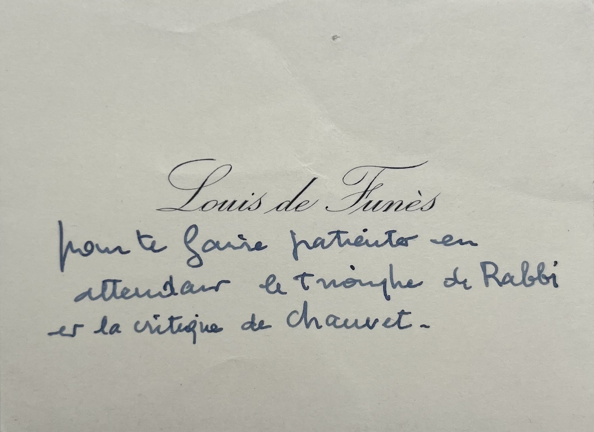 Sur sa carte de visite, Louis de Funès a écrit ces quelques mots, au moment de la sortie de Rabbi Jacob :