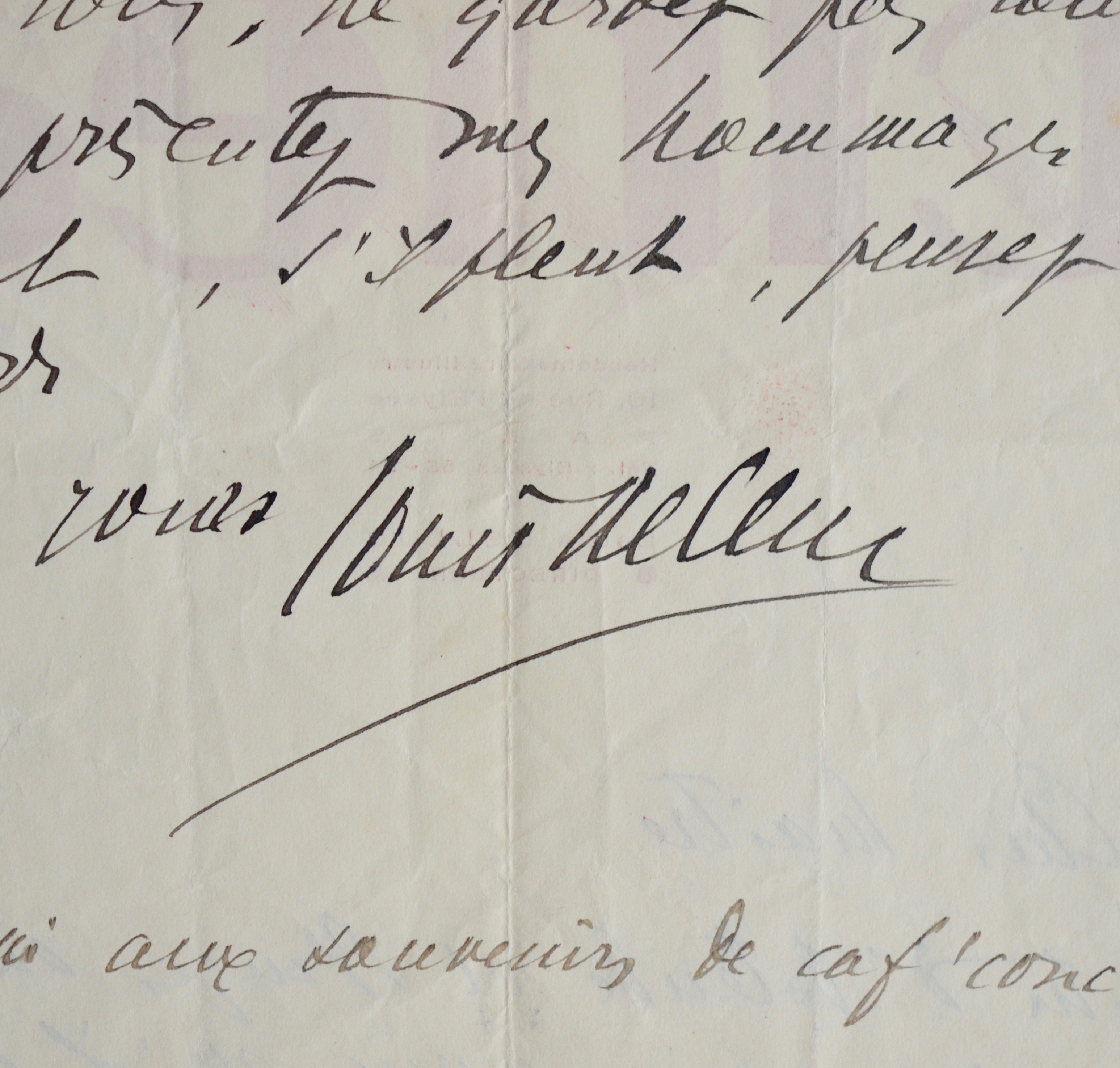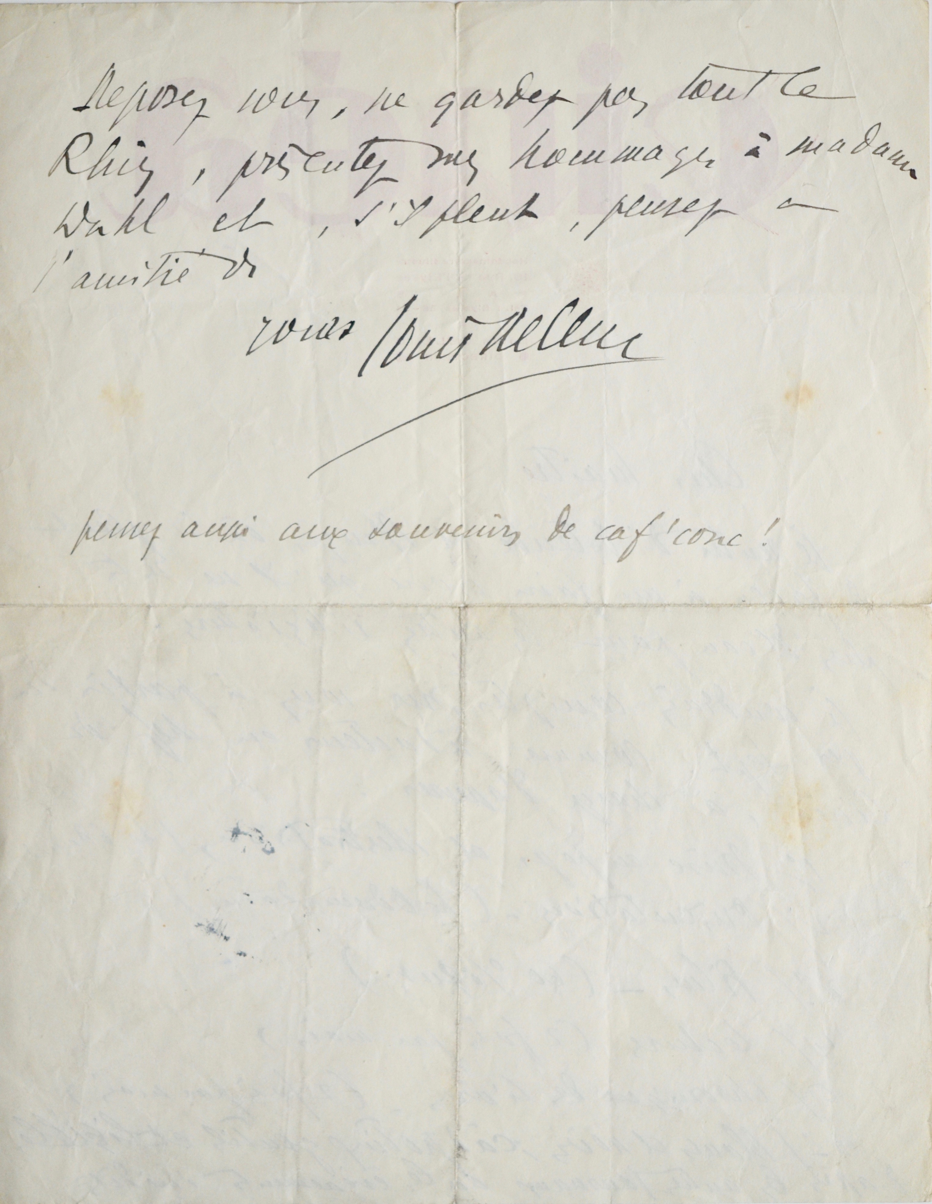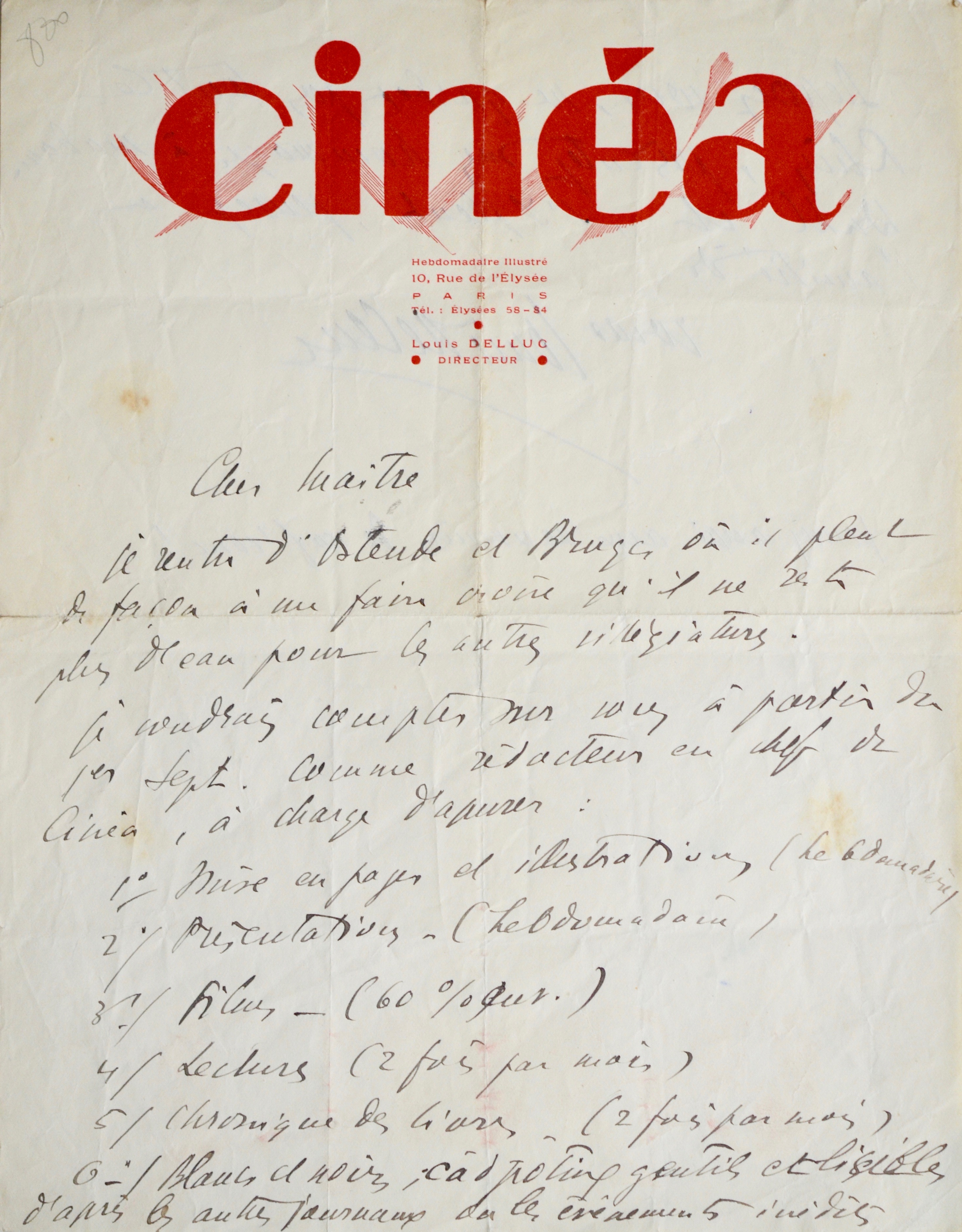 "Cher Maître. Je rentre d'Ostende et Bruges où il pleut de façon à me faire croire qu'il ne reste plus d'eau pour les autres villégiatures. Je voudrais compter sur vous à partir du 1er sept. comme rédacteur en chef de Cinéa, à charge d'apurer [...]". Il liste ensuite tous les points importants relatifs à cette fonction (mise en page et illustrations, présentations, lectures, etc.) et ajoute : "Reposez-vous, ne gardez pas tout le Rhin, présentez mes hommages à Madame Wahl et s'il pleut, pensez à l'amitié [...] pensez aussi aux souvenirs de caf'conc".