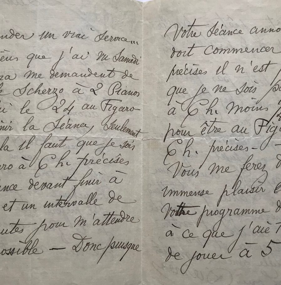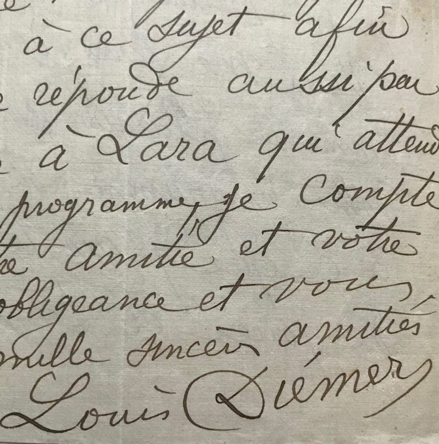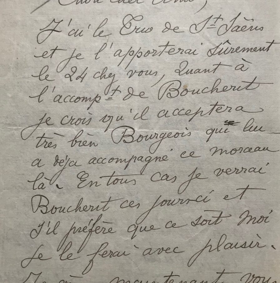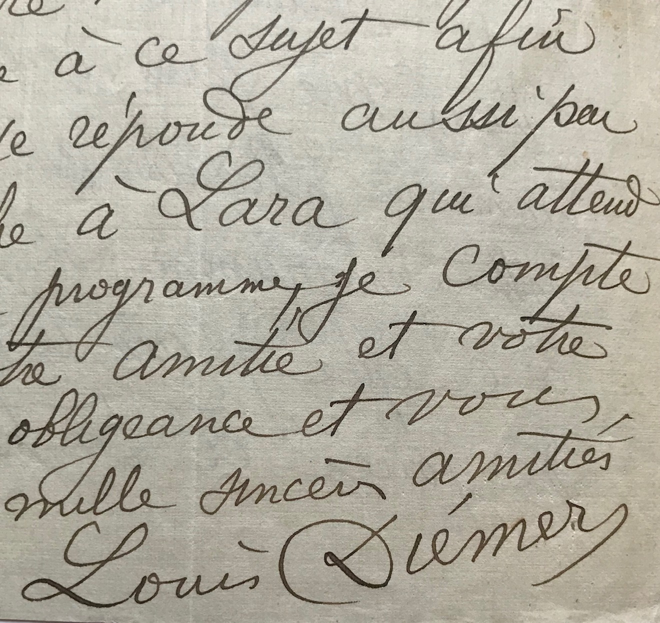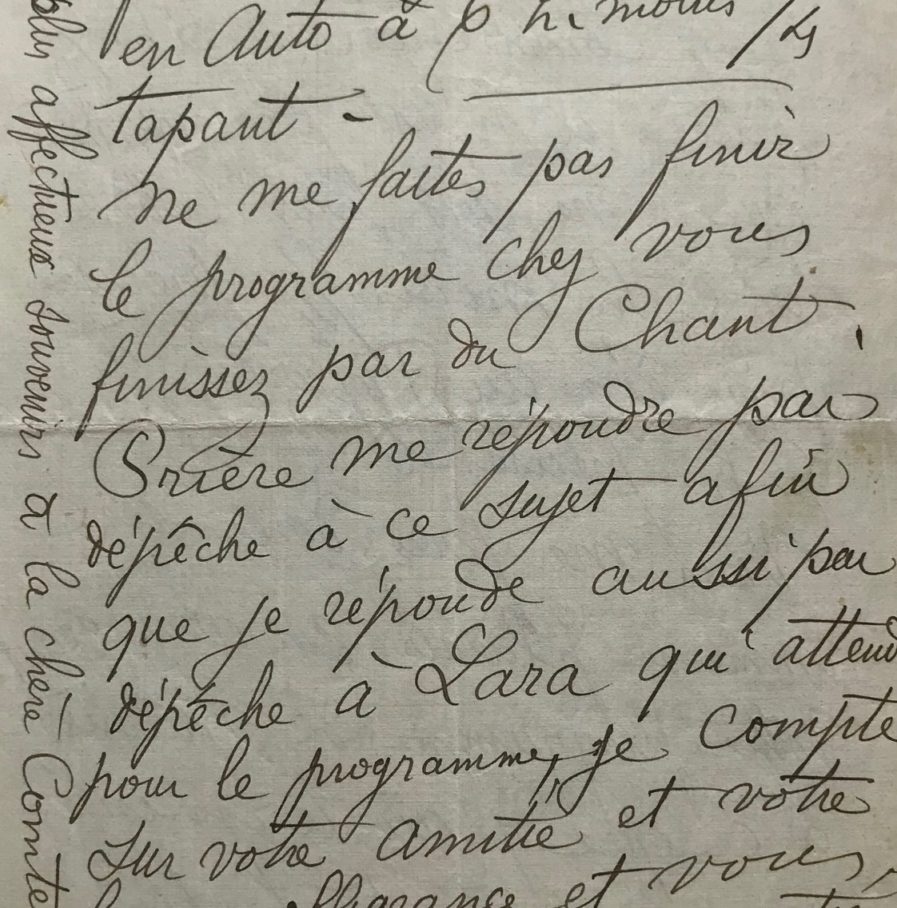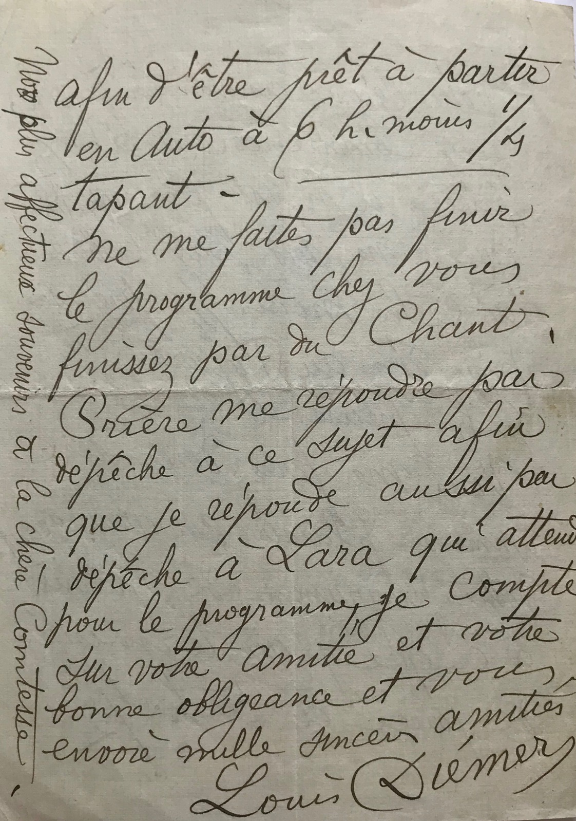 "J'ai le Trio de St Saëns et je l'apporterai sûrement le 24 chez vous, quant à l'accompagnement de Boucherit [le violoniste Jules Etienne Boucherit], je crois qu'il acceptera très bien Bourgeois qui lui a déjà accompagné ce morceau là". Il demande ensuite "un vrai service" : "St Saëns que j'ai vu samedi et Lara me demandent de jouer Scherzo à 2 pianos avec lui le 24 au Figaro". Il prie son correspondant de modifier son programme pour faire gagner dix minutes à Diémer "de manière à ce que j'aie terminé de jouer à 5h. 1/2 afin d'être prêt à partir en Auto à 6h. moins 1/4 tapant" et de pouvoir honorer la proposition de Saint-Saëns. Diémer termine son courrier par ces mots "Nos plus affectueux souvenirs à la chère Comtesse". [René Lara, journaliste au Figaro puis directeur du Gaulois]