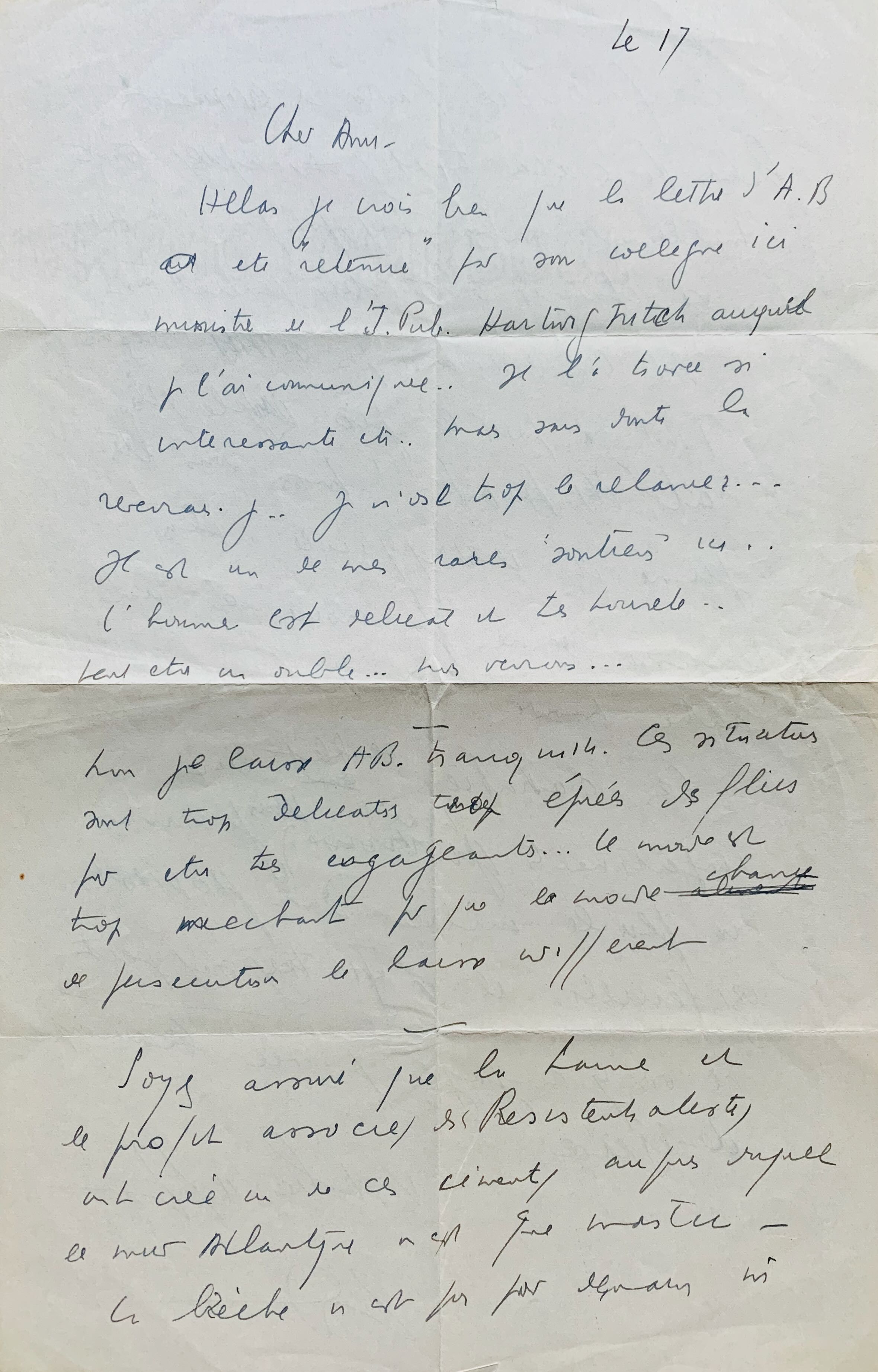 Il craint que la lettre d’A.B. n’ait été retenue par le ministre de l’Instruction publique. « Il la trouve si intéressante… mais sans doute la reverrai-je… je n’ose trop le relancer… Il est un de mes rares soutiens ici… l’homme est délicat et très honnête… peut-être un oubli… nous verrons… Non je laisse AB tranquille. Ces situations sont trop délicates trop épiées des flics pour être très engageantes… le monde est trop méchant pour que la moindre chance de persécution le laisse indifférent. Soyez assuré que la lame et le profit associés des Résistentialistes ont créé un de ces ciments auprès duquel le mur Atlantique n’est que mastic. La brèche n’est pas pour demain ni la fonte ! Il faudra des événements hélas des catastrophes […]. Ah Candide n’est pas de mes confrères ! Tout va pour le pire dans le plus raté des mondes ! Mais vous êtes jeune et il est difficile. La jeunesse ne peut pas croire en un autre monde sur terre […] ».