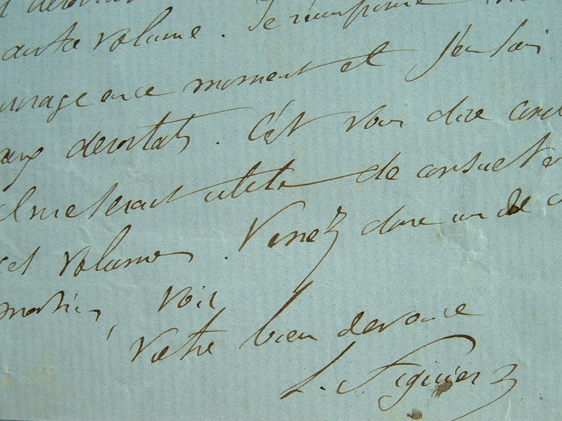 Louis Figuier rappelle la promesse de son correspondant de lui rapporter la brochure qu'il lui avait prêtée sur l'aérostation militaire. «Je recompose mon ouvrage en ce moment et j'en suis aux aérostats. C'est vous dire combien il me serait utile de consulter ces volumes [...]».