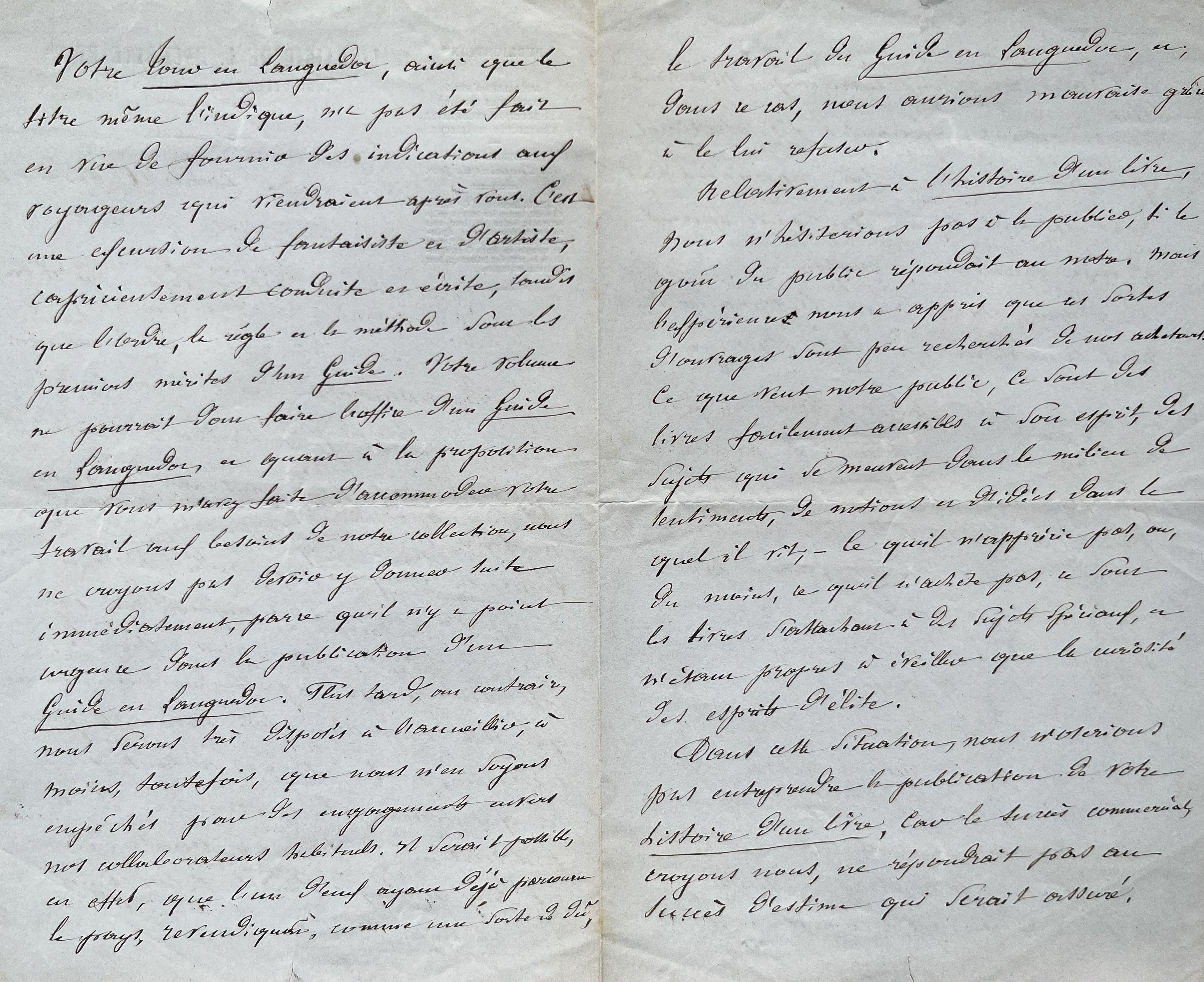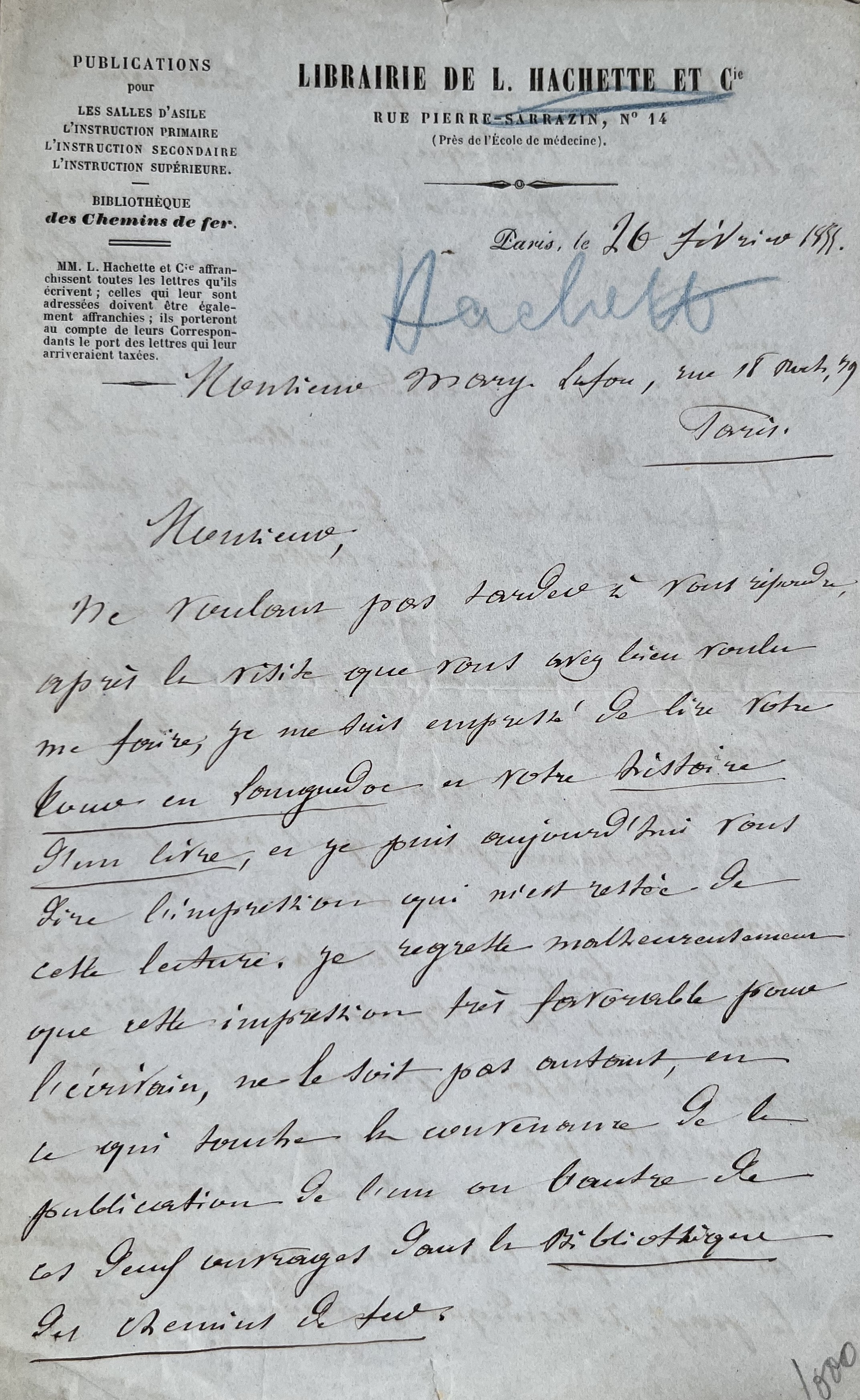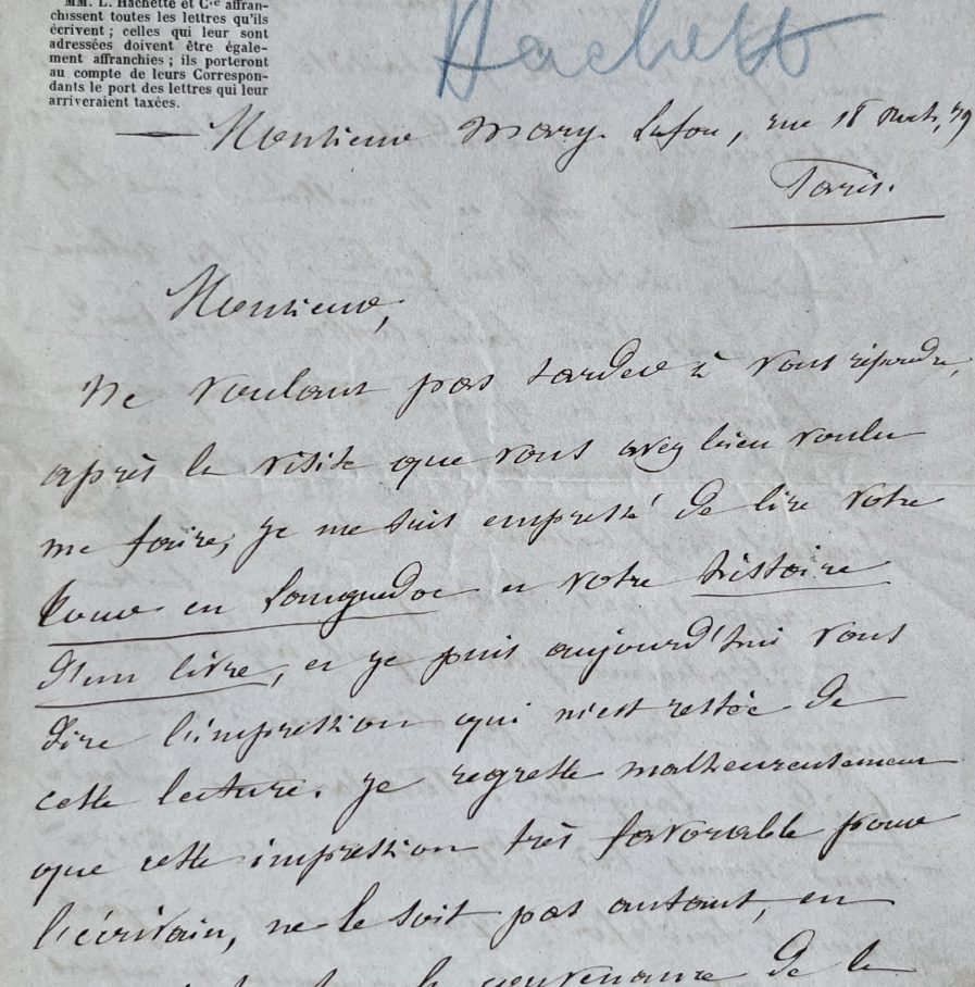 Louis Hachette (Rethel (Ardennes), 1800/1864)Louis hachette a lu Tour en Languedoc et Histoire d'un livre de Mary-Lafon. Mais pour lui, le premier ouvrage n'est pas compatible avec une édition de la Bibliothèque des chemins de fer. Sa trop grande fantaisie ne pourra pas en faire un guide du Languedoc, même en y apportant des remaniements. Il pourrait revenir sur cette décision à l'avenir mais sans lui en donner toutefois la certitude.