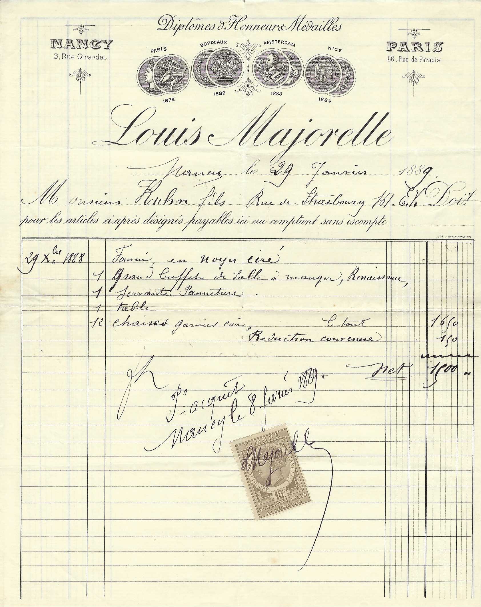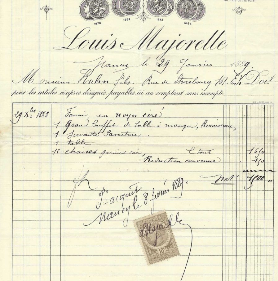 Facture de vente dressée par Louis Majorelle (sur feuille à son en-tête) d'une ensemble de meubles de salon : "Fourni en noyé ciré : 1 grand buffet de salle à manger, Renaissance / 1 servante Panneture / 1 table / 12 chaises garnies cuir. Le tout 1650 [...]". Rare.