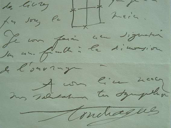 Répondant à une sollicitation de son correspondant pour une dédicace sur un livre, Louis Touchagues demande les dimensions de l'ouvrage en question, avec un petit croquis. «Je vous ferai une signature sur une feuille à la dimension de l'ouvrage».