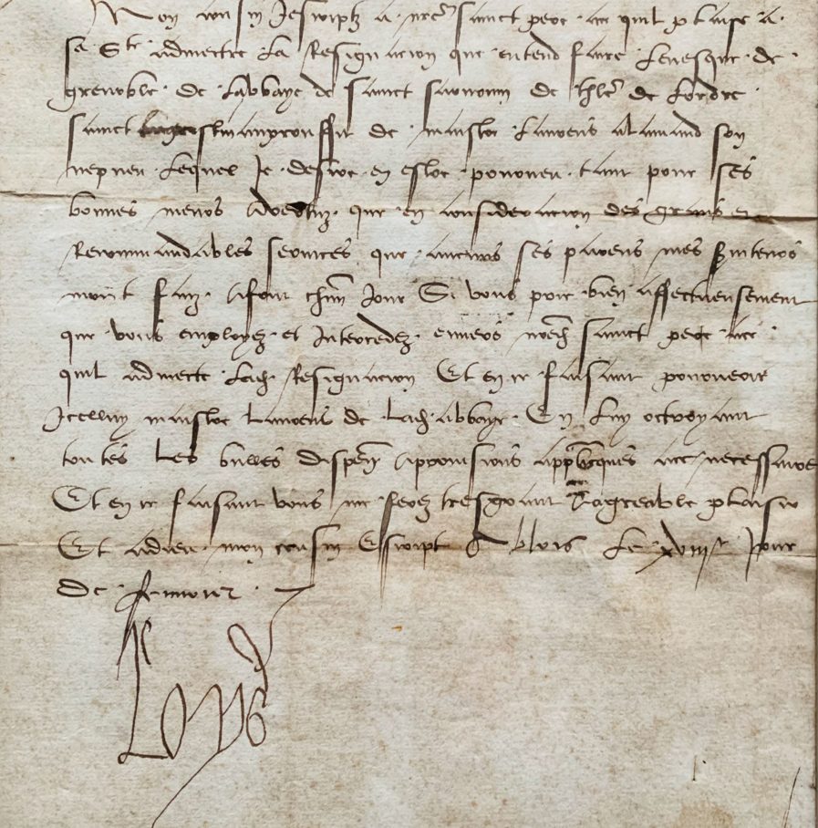 “Mon cousin j’escriptz a nostre sainct pere a ce qu’il plaise a sa saincteté admectre la resignacion que entend faire l’evesque de Grenoble de l’abbaye de sainct Sarnnin [Sernin] de Thle [Toulouse] de l’ordre sainct Augustin au prouffit de maistre Laurens Alamand son nepveu lequel je desire en estre pourveu tant pour ses bonnes meurs et vertuz que en consideracion des grans et recommandables services que aucuns ses parens mes serviteurs m’ont faiz et font chascun jour. Si vous prie bien affectueusement que vous employez et intercedez envers nostre sainct pere a ce qu’il admecte ladicte resignacion. Et en ce faisant pourveoir iceluy maistre Laurens de ladicte abbaye en luy octroyant toutes les bulles, dispenses, aprovisions, appliques a ce necessaires. Et en ce faisant vous me ferez tres grant et agreable plaisir. Et adieu mon cousin. Escript a Blois le XVIIIe jour de février. LOYS ”