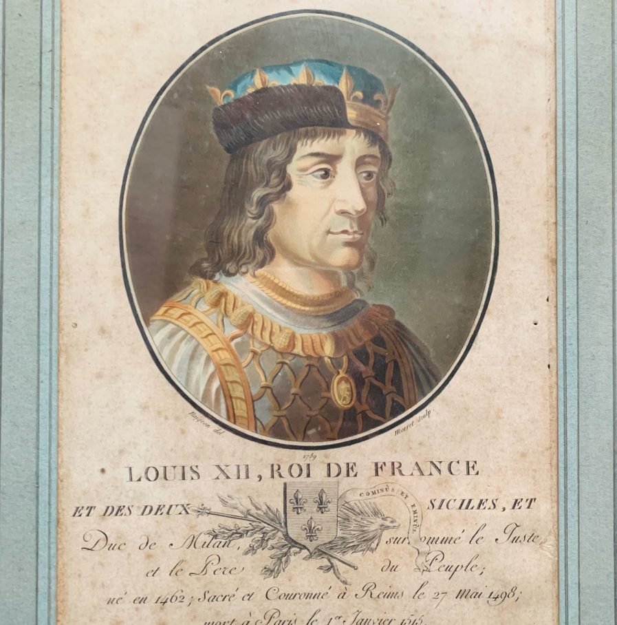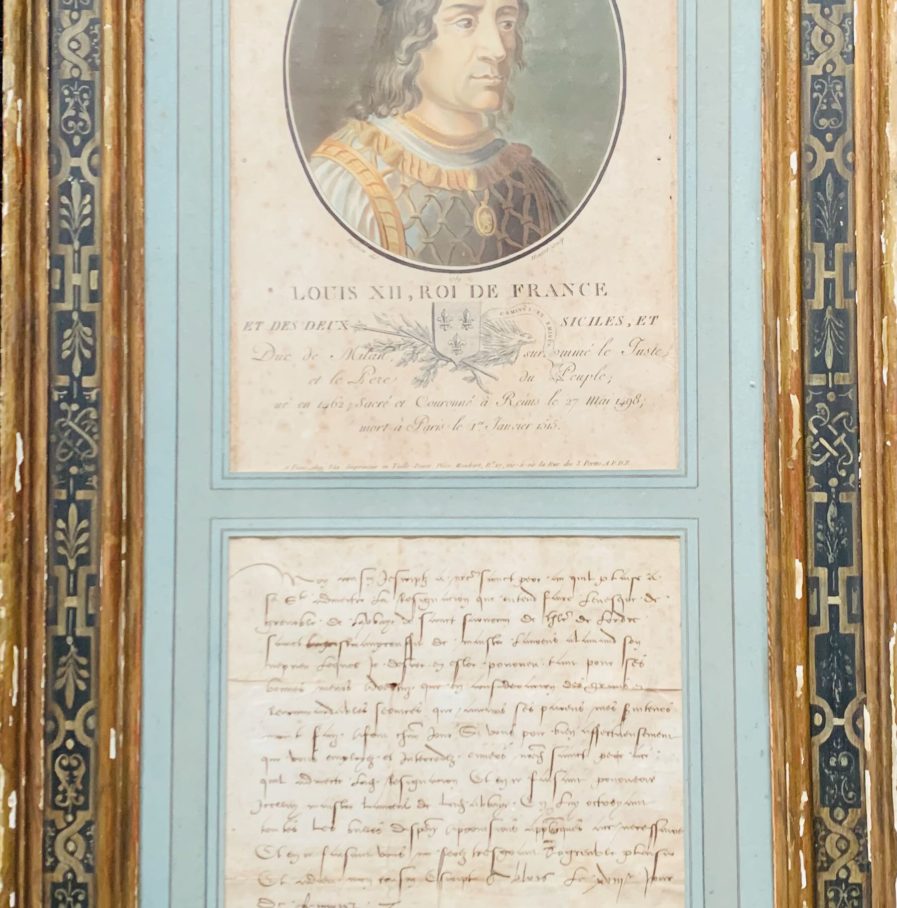 Document encadré avec un portrait gravé de Louis XII par Morret d’après un dessin de Naigeon, daté 1789 dans la planche, avec légende gravée, mis en couleurs à l’époque (232 x 168 mm). Cadre en bois stuqué "a cassetta" peint, milieu du XIXe, sous double passe-partout (625 x 331 mm).
