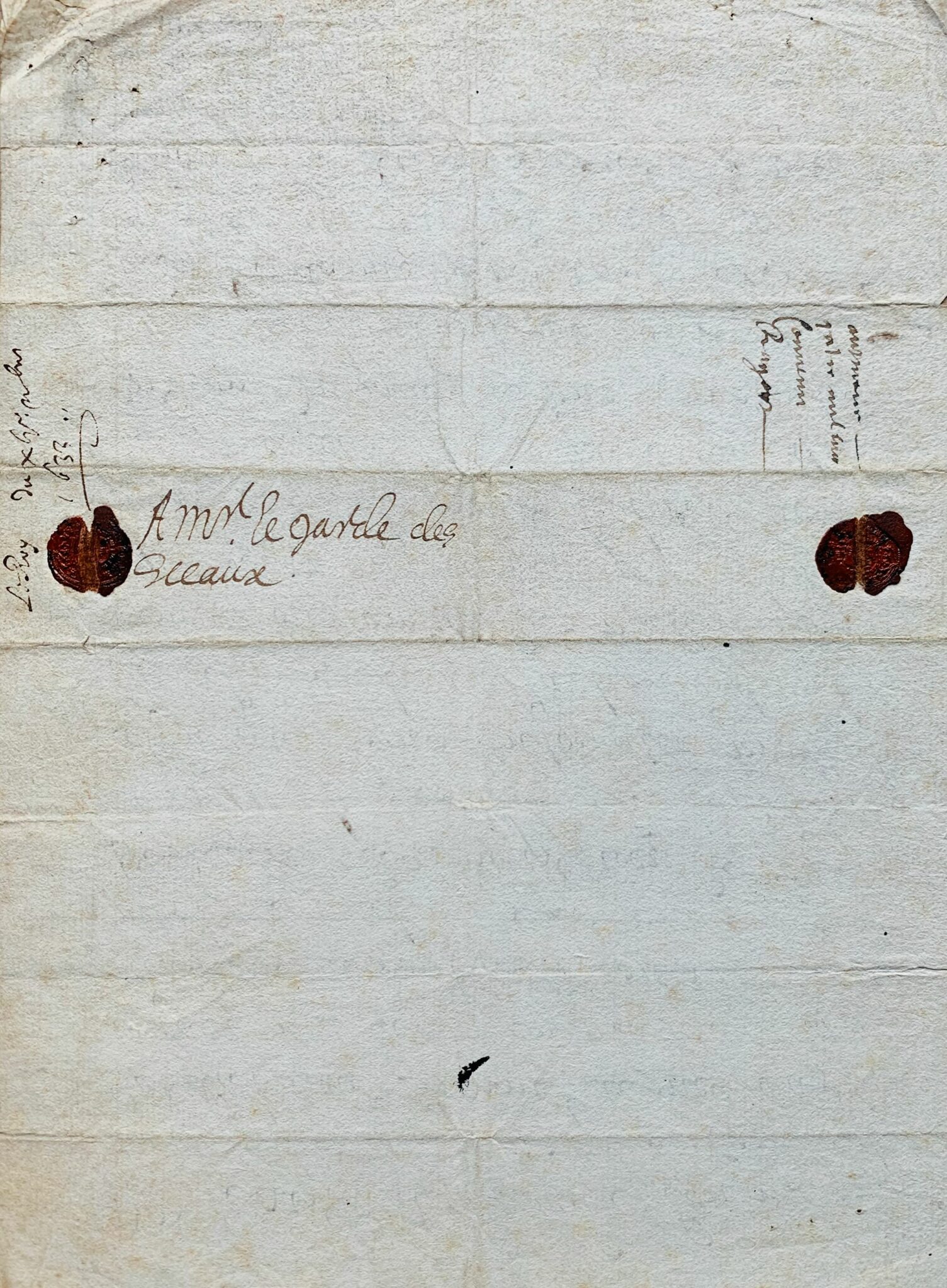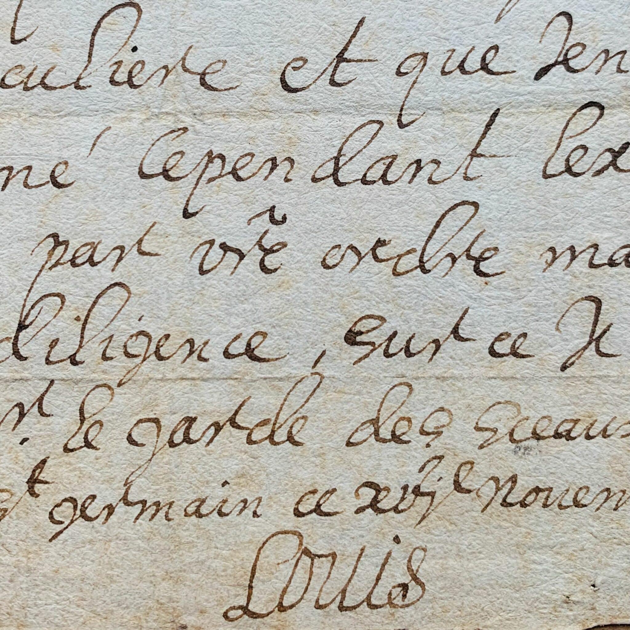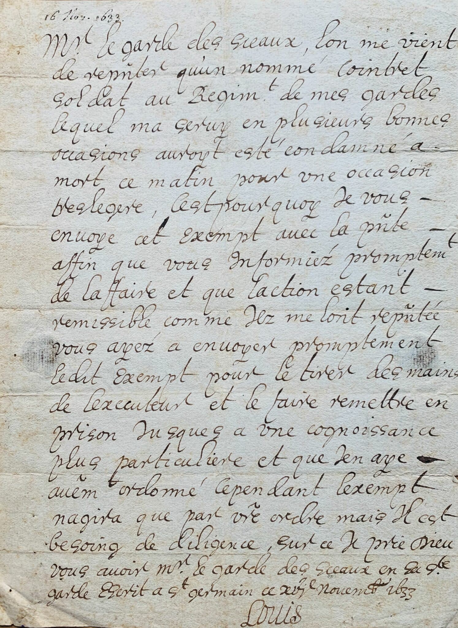 "Mr le garde des sceaux, l'on me vient de rep[rése]nter qu'un nommé Cointret soldat au régiment de mes gardes lequel ma servy en plusieurs bonnes occasions auroyt esté condamné a mort ce matin pour une occasion tres legere. Cest pourquoy je vous envoye cet exempt avec la présente affin que vous vous informiez promptement de laffaire et que l'action estant rémissible comme ils me lont rep[rése]ntée vous ayez a envoyer proprement ledit exempt pour le tirer des mains de lexecuteur et le faire remettre en prison jusques a une cognoissance plus particuliere et que jen aye au[tr]em[ent] ordonné. Cependant l'exempt nagira que par v[ost]re ordre mais il est besoing de diligence, sur ce je prie Dieu vous avoir Mr le garde des sceaux en sa Ste garde. Ecrit a St Germain ce XVIe novembre 1633"