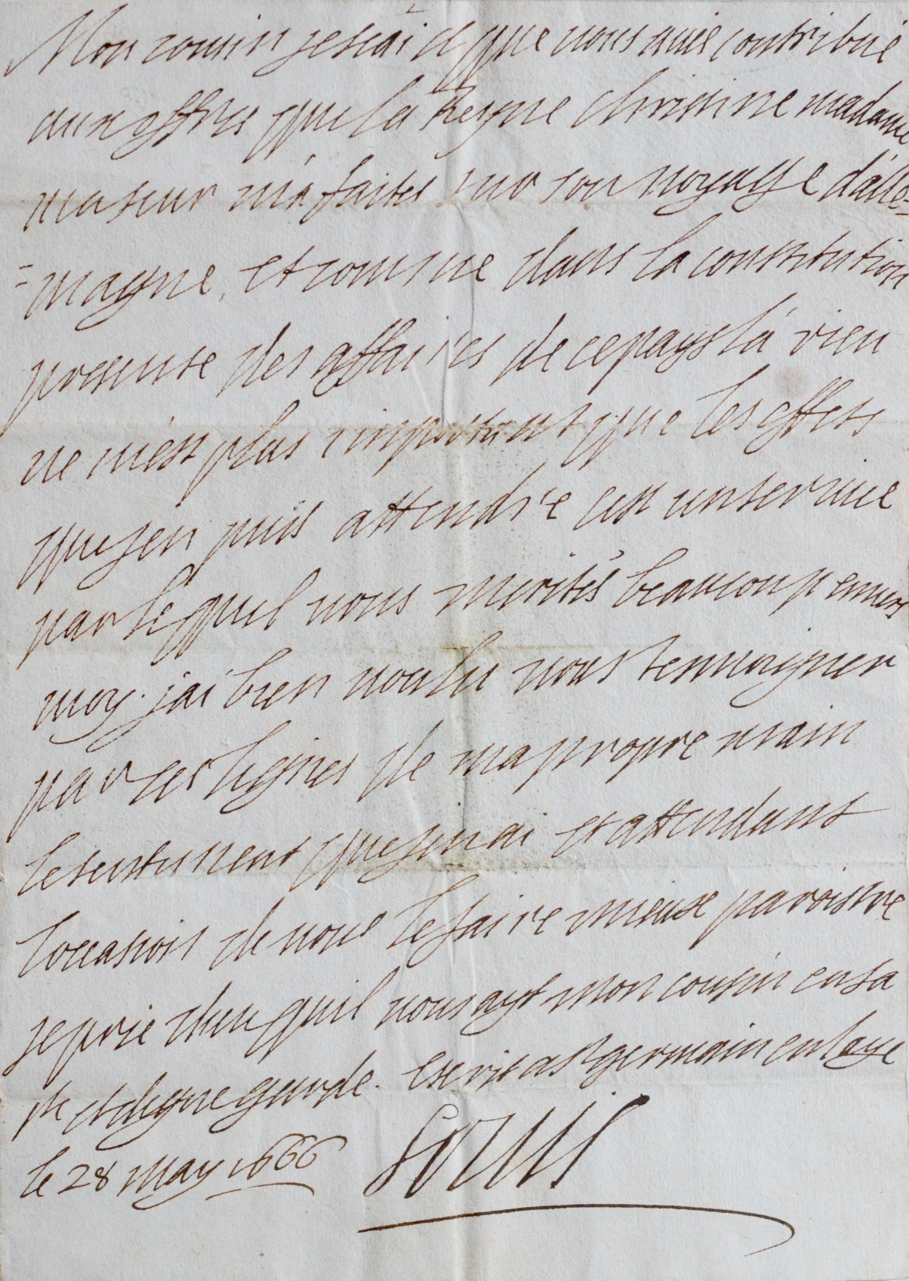 "Mon cousin je scai ce que vous avés contribué aux offres que la Reyne Christine Madame ma seur m'a faites sur son voyage d'Allemagne, et comme dans la constitution présente des affaires de ce pays là rien ne m'est plus important que les effets que j'en puis attendre cest un service par lequel vous mérités beaucoup envers moy. Jai bien voulu vous tesmoigner par ces lignes de ma propre main le sentiment que j'en ai et attendant l'occasion de vous le faire mieux paroistre, je prie dieu qu'il vous ayt mon cousin en sa Ste et digne garde. Ecrit à St Germain en Laye le 28 May 1666.