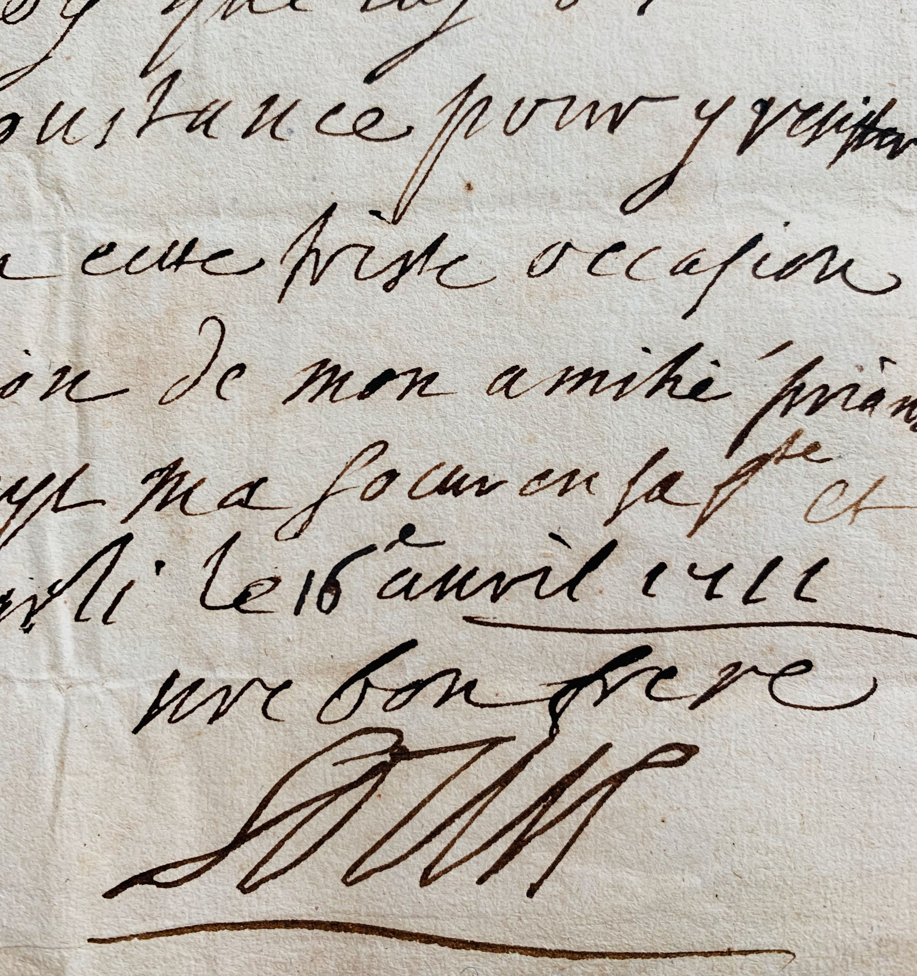 "Ma soeur, comme vous mavés touiours tesmoigné prendre beaucoup de part à ce qui touche ie ne doute point que vous ne soyés fort sensible à la grande perte que ie viens de faire de mon fils le dauphin que la mort ma ravi le 14e de ce mois après cinq jours de maladie, cest une perte si sensible pour moy que iay besoin de tout ma constance pour y résister. Ie vous assure en ceste triste occasion de la continuation de mon amitié priant dieu qu'il vous ayt ma soeur en sa Ste et digne garde".