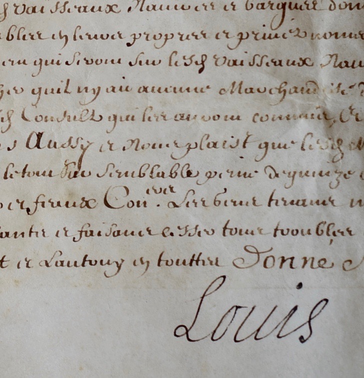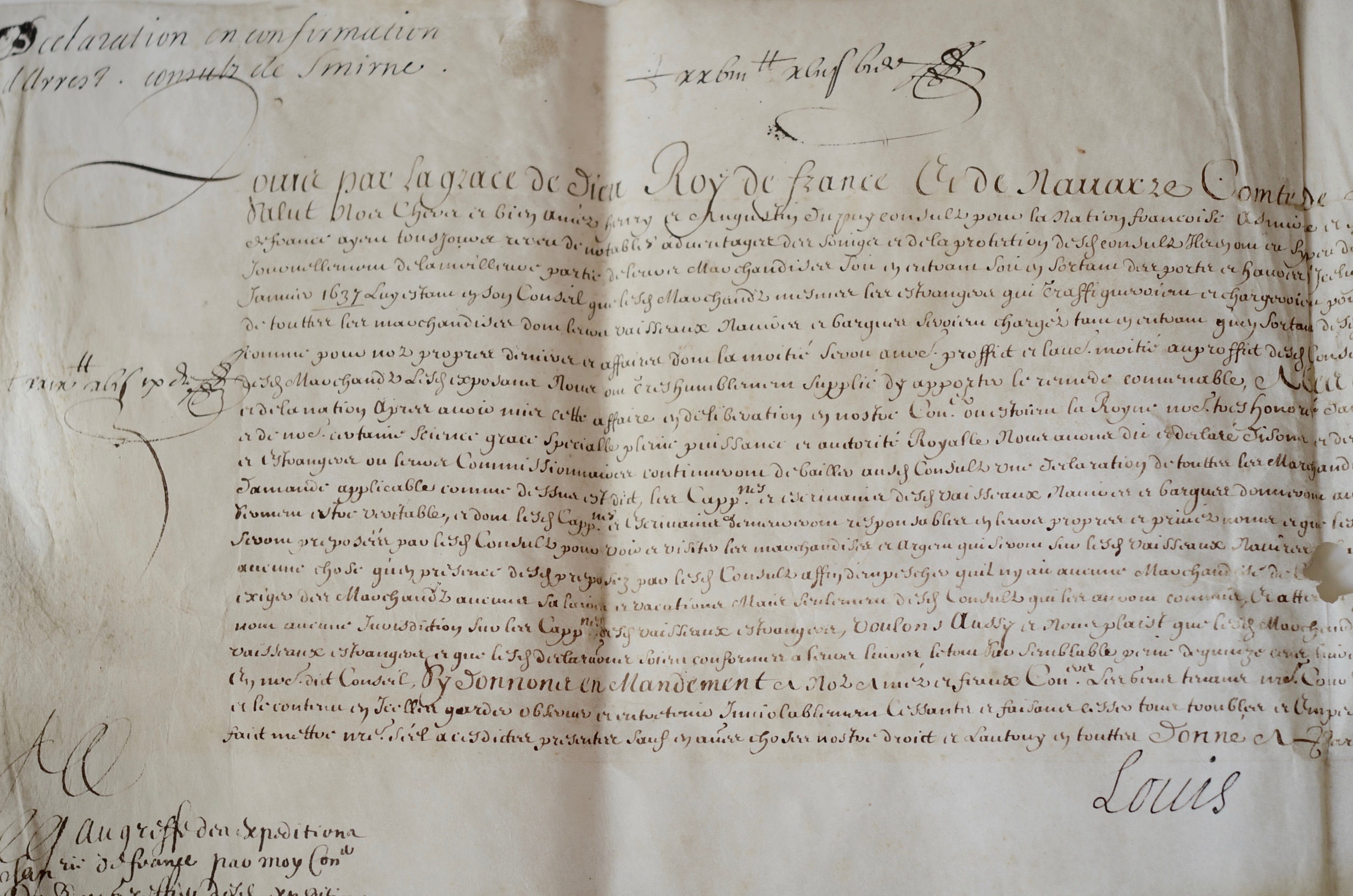 Lettres de confirmation de mesures de contrôle des marchandises pour les consuls de Smyrne, Henry et Augustin Dupuy. Les marchands français et autres négociants sous la bannière de France "ayant tousjours receu de notables advantages des soings et de la protection desd. Consuls" ont cependant "perpetuellement fraudé les droicts attribuez audict consulat par le recellement quils ont faict et font journellement de la meilleure partie de leurs marchandises soit en entrant soit en sortant des ports et havres d’iceluy", ce qui avait amené à ordonner "que lesd. marchands mesmes les estrangers qui traffiqueroient et chargeroient pour lesd. marchands exiberoient et mettroient entre les mains desd. consuls ou autres ayants charge d’eux l’inventaire general de touttes les marchandises dont leurs vaisseaux navires et bargues seroient chargés". Mais cette précaution n’ayant pas été suffisante pour empêcher les fraudes, il est arrêté "qu’outre l’inventaire general que lesd. marchands françois et estrangers ou leurs commissionnaires continueront de bailler auxd. consuls une declaration de touttes les marchandises dont leurs vaisseaux navires et bargues seront chargés" sous peine de 1500 livres d’amende, et "donneront aussy auxd. consulz une declaration de largent et marchandises qui seront dans leurs vaisseaux navires et bargues quils affirmeront par serment estre veritable, et dont lesd. cappnes et escrivains demeureront responsables en leurs propres et privés noms". Rare document.