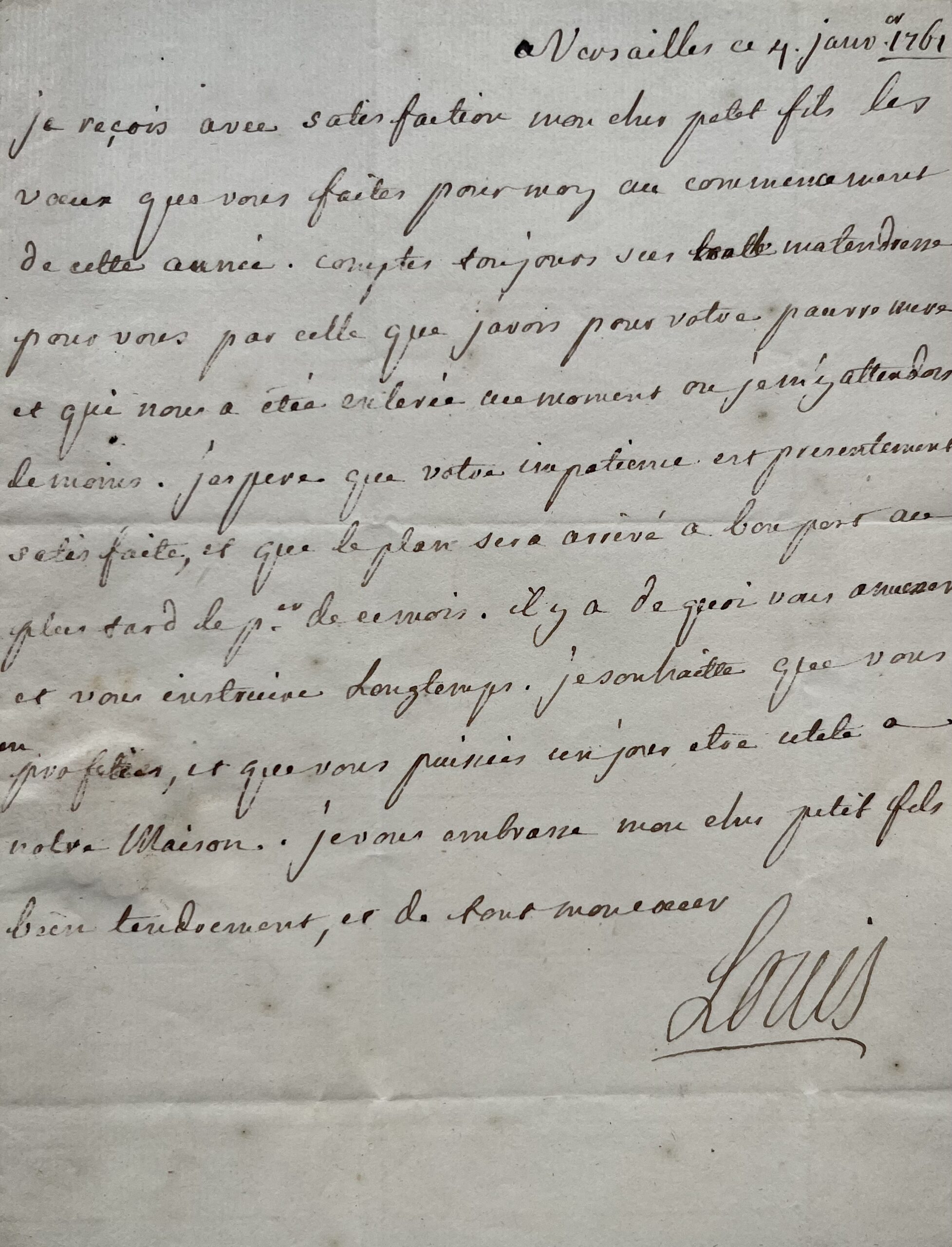 "Je reçois avec satisfaction mon cher petit fils les voeux que vous faites pour moy au commencement de cette année. Comptes toujours sur toute ma tendresse pour vous par celle que j'avois pour votre pauvre mère et qui nous a été enlevée au moment ou je m'y attendois le moins. J'espère que votre impatience est presentement satisfaite, et que le plan sera arrivé à bon port au plus tard le p[remi]er de ce mois. Il y a de quoi vous amuser et vous instruire longtemps. Je souhaite que vous en profitiés, et que vous puissiés un jour être utile à notre Maison. Je vous embrasse mon cher petit fils bien tendrement, et de tout mon coeur. Louis".