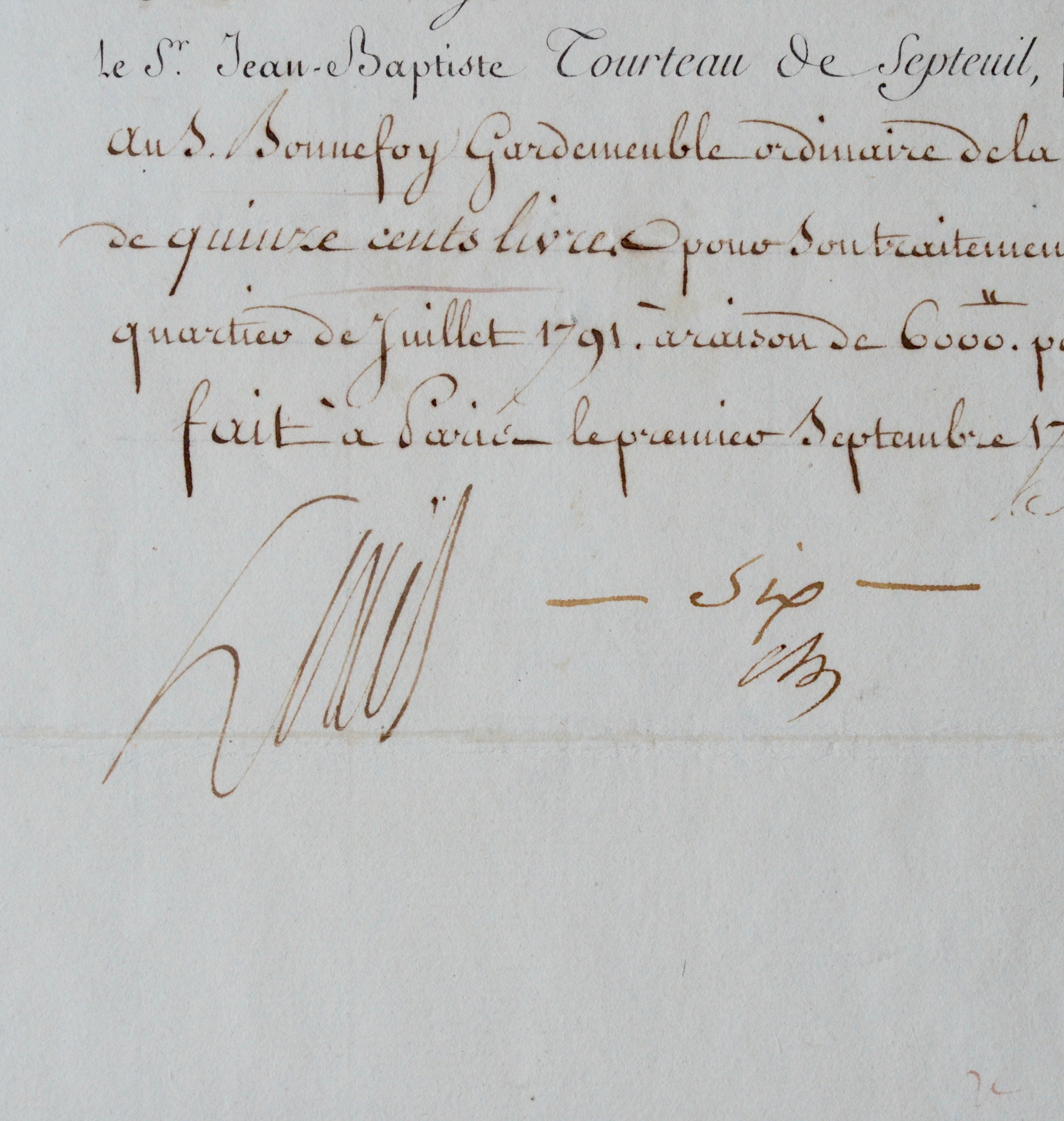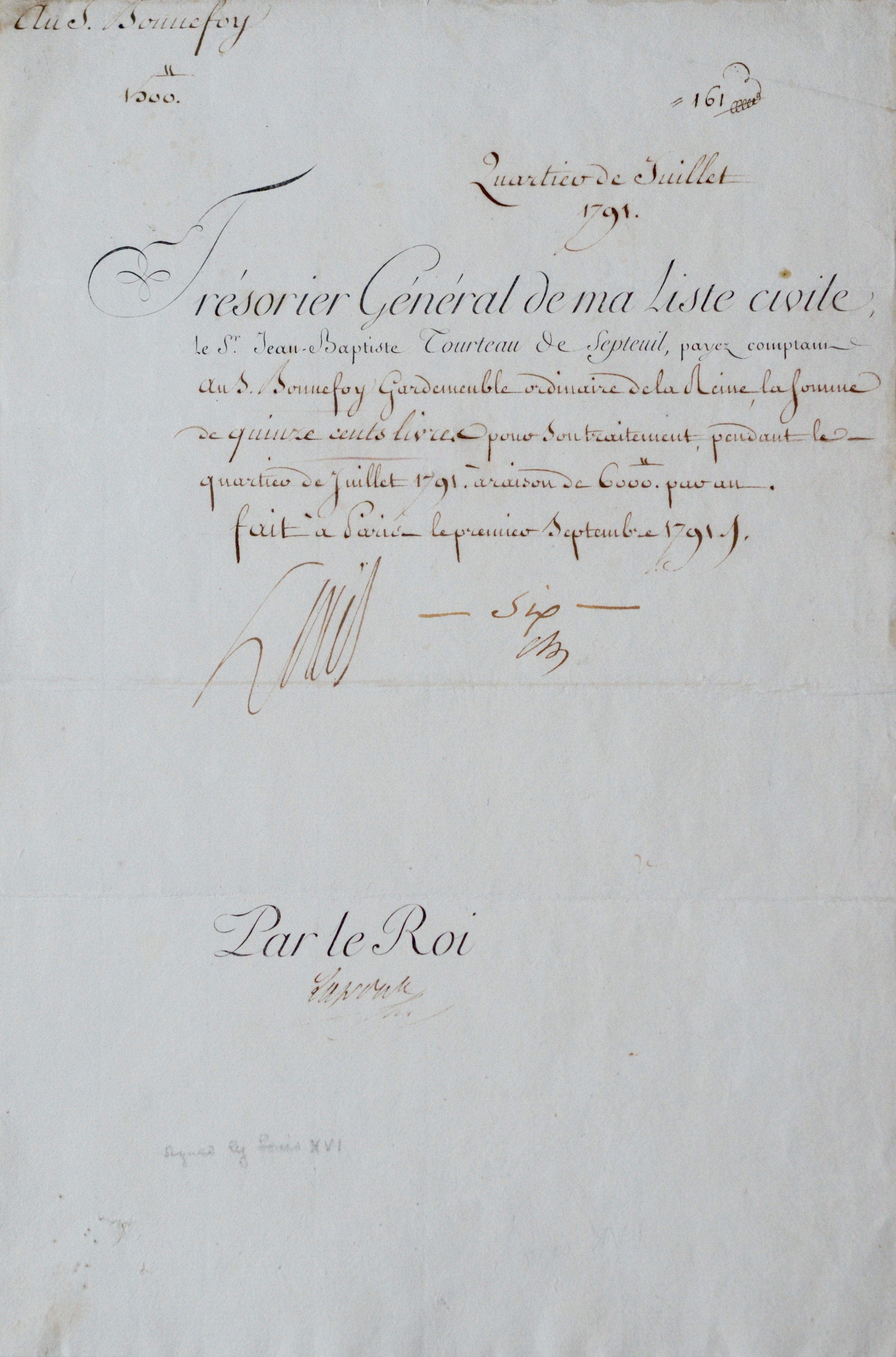 Ordre de paiement signé de Louis XVI, pour le sieur Bonnefoy "garde-meuble ordinaire de la Reine". 1500 livres "pour son traitement pendant le quartier de juillet 1791, à raison de 6000 par an".
