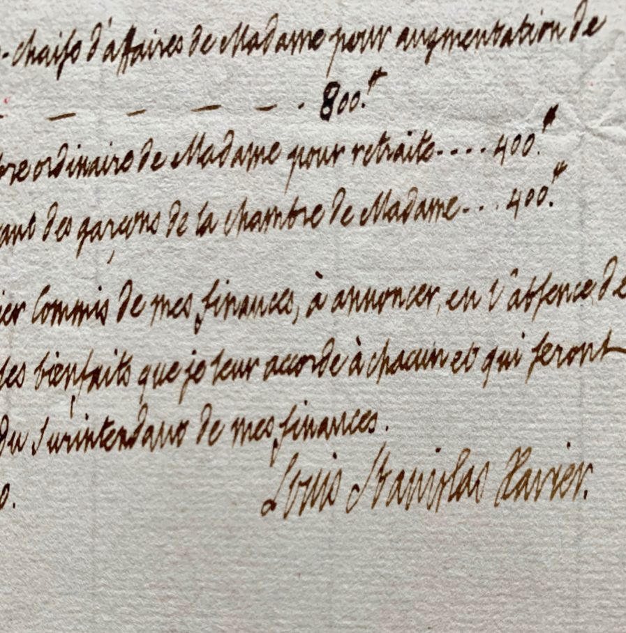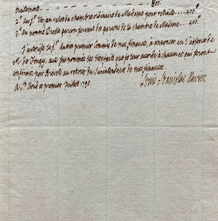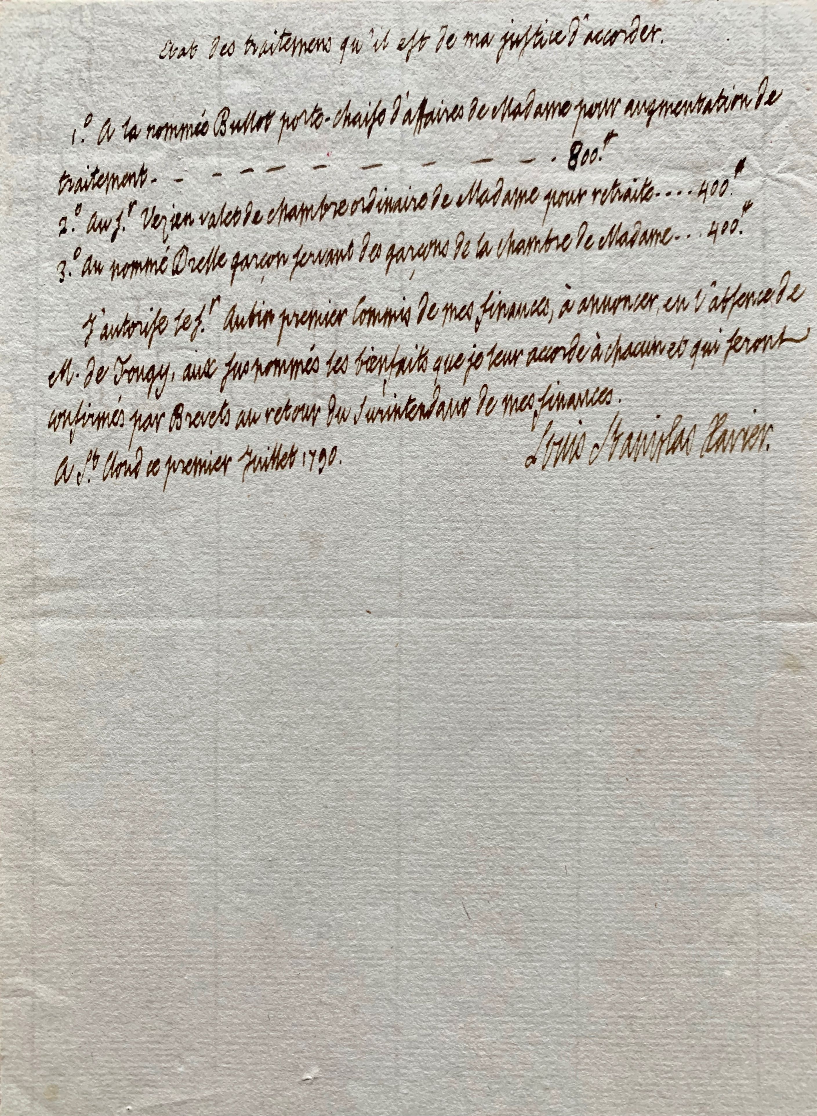 Pièce autographe signée "Louis Stanislas Xavier" [le futur Louis XVIII était alors comte de Provence], contenant un "Etat des traitemens qu'il est de ma justice d'accorder". Louis XVIII dresse la liste des gratifications qu'il accorde, avec la somme, pour un valet de chambre, un porte-chaise et un « garçon de la chambre de Madame".
