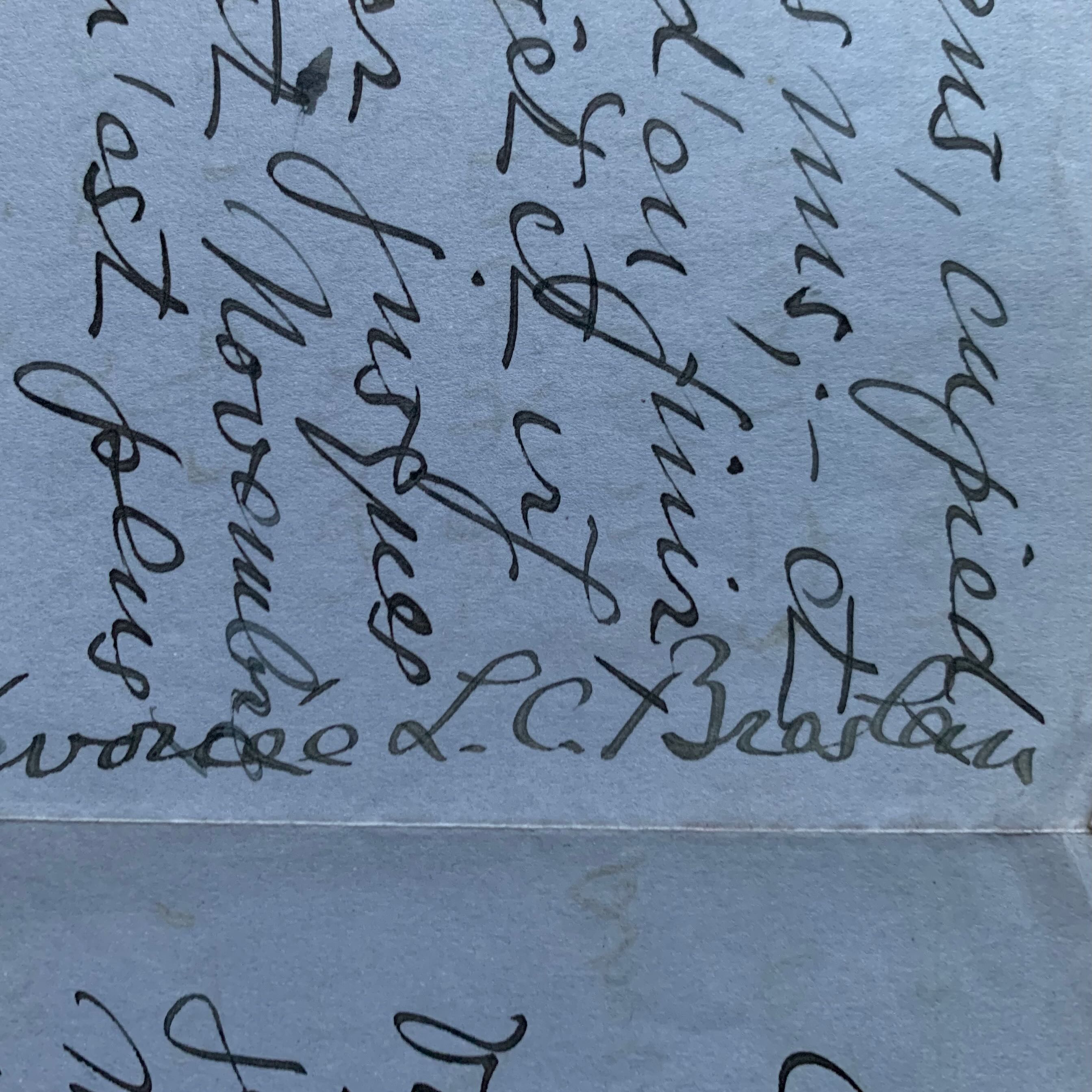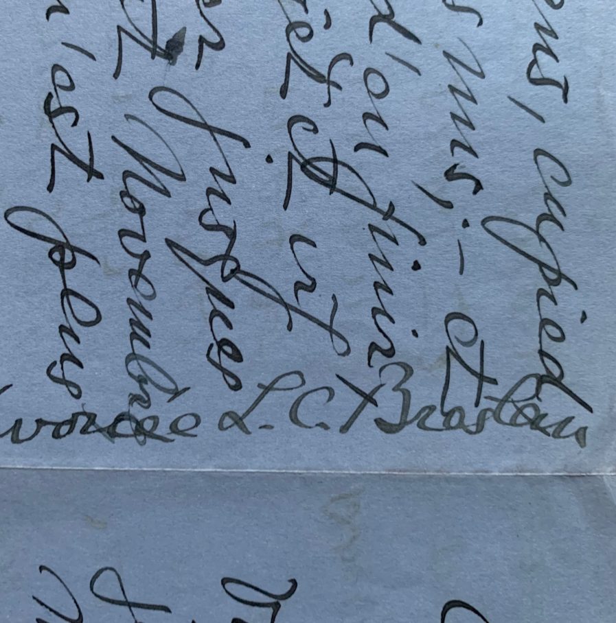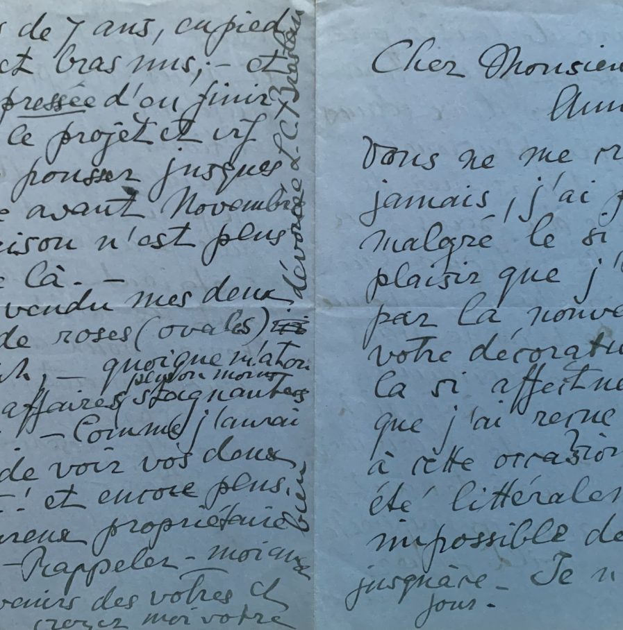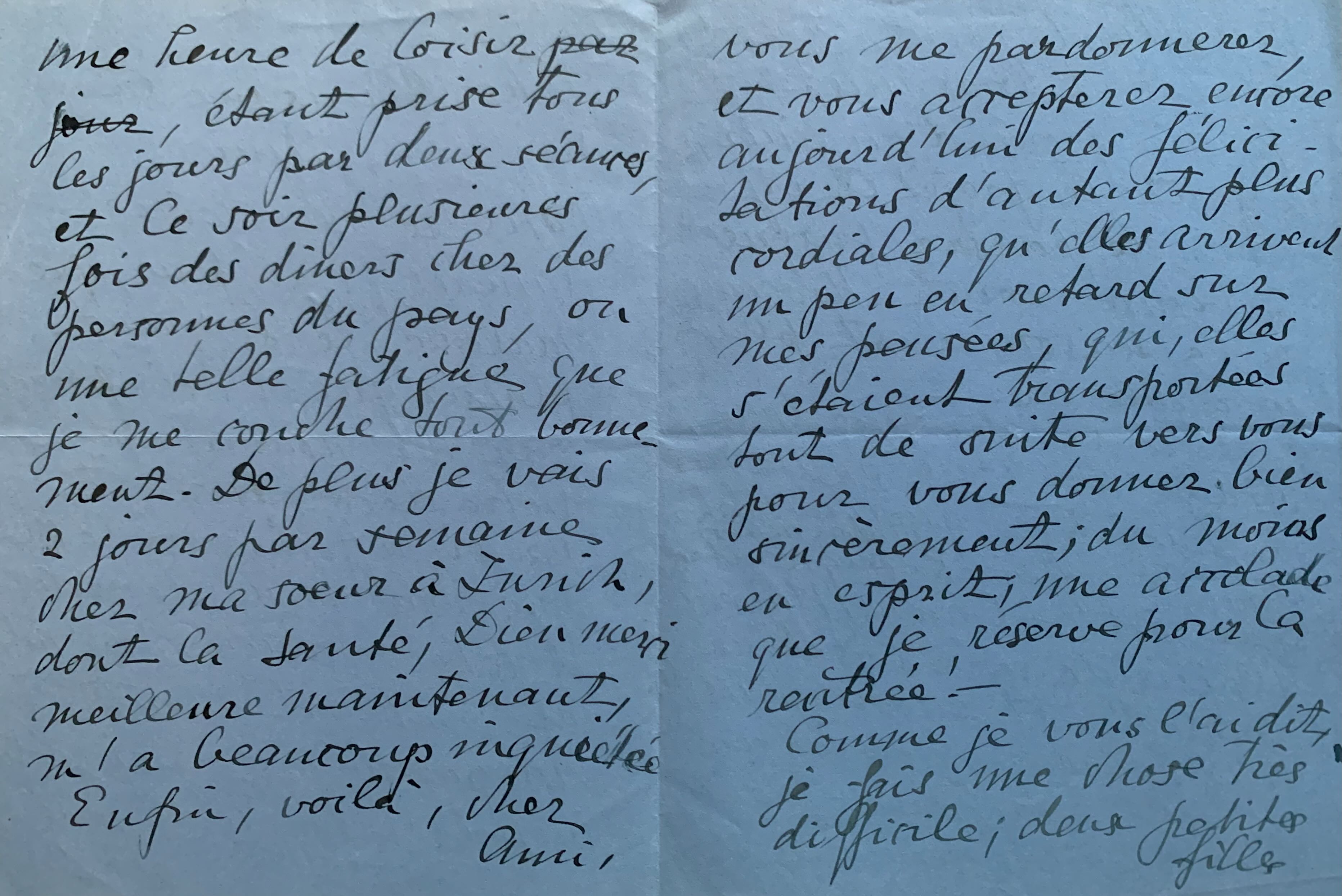 Louise Catherine Breslau (Munich, 1856/1927)Elle félicite chaudement Hector Brame pour la décoration qui vient de lui être remise. "Il m'a été littéralement impossible de vous écrire jusqu'à ce jour. Je n'ai pas une heure de loisir, étant prise tous les jours par deux séances, et le soir plusieurs fois des diners chez des personnes du pays [...]. De plus je vais 2 jours par semaine chez ma soeur à Zurich dont la santé, Dieu merci, meilleure maintenant, m'a beaucoup inquiétée. Enfin, voilà, cher ami, vous me pardonnerez, et vous accepterez encore aujourd'hui des félicitations d'autant plus cordiales, qu'elles arrivent un peu en retard sur mes pensées [...]".