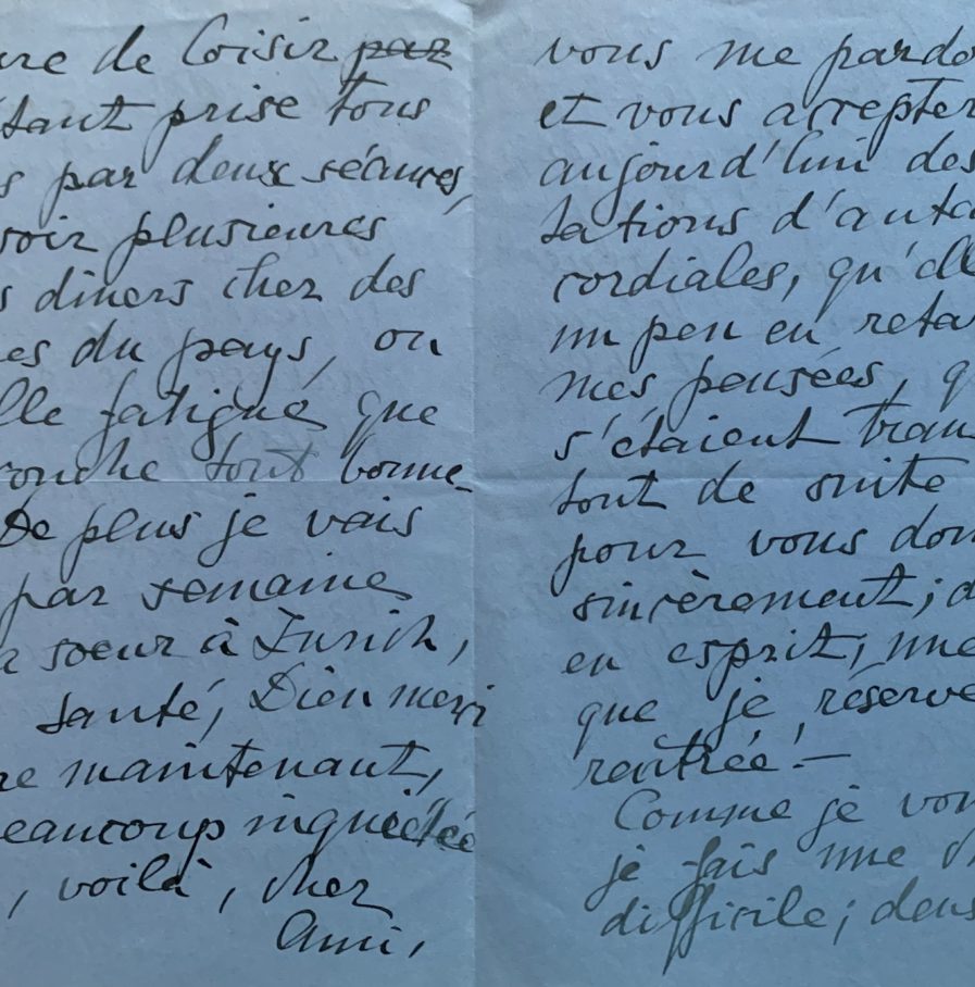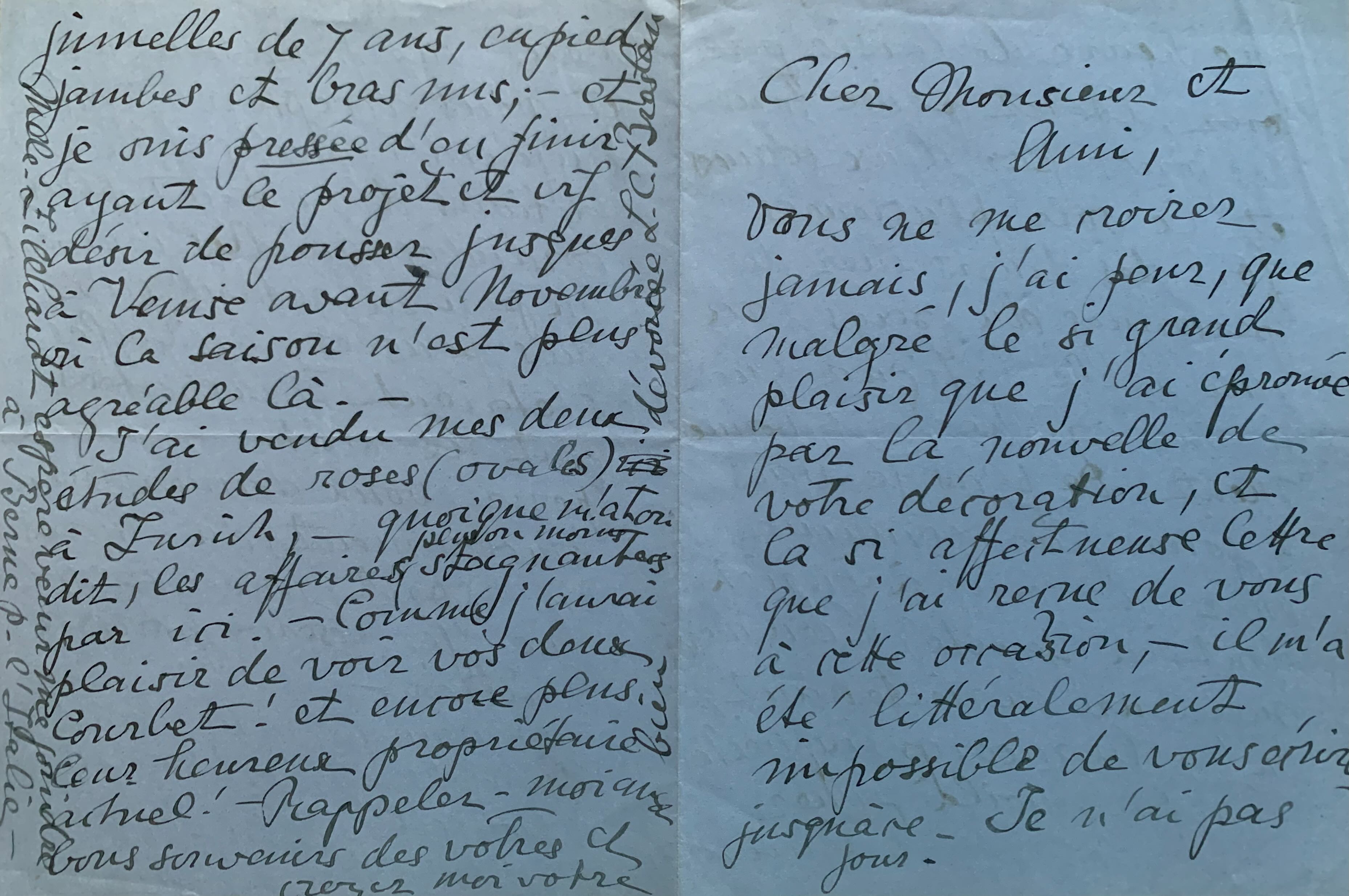 Elle évoque ensuite son travail de peintre. « Comme je vous l'ai dit, je fais une chose très difficile, deux petites filles jumelles de 7 ans aux pieds, jambes et bras nus. Et je suis pressée d'en finir, ayant le projet et vif désir de pousser jusqu'à Venise avant novembre où la saison n'est plus agréable là. J'ai vendu mes 2 études de roses (ovales) à Zurich - quoique m'a-t-on dit, les affaires sont plus ou moins stagnantes par ici. Comme j'aurais plaisir de voir vos deux Courbet et encore plus, l'heureux propriétaire actuel! [...] Mlle Zillhardt [Madeleine Zillhardt, sa compagne] espère venir me joindre à Berne pour l'Italie ».