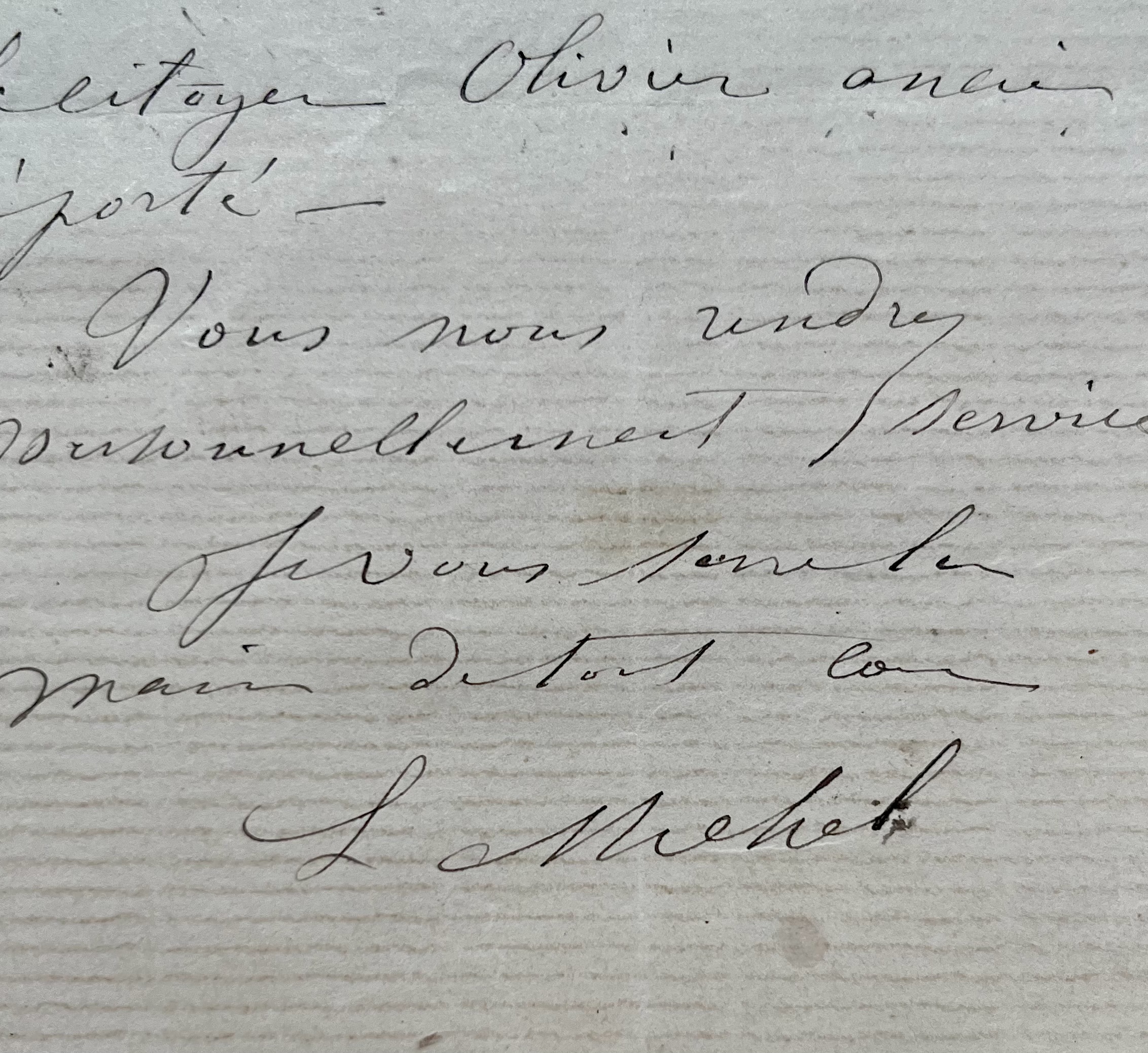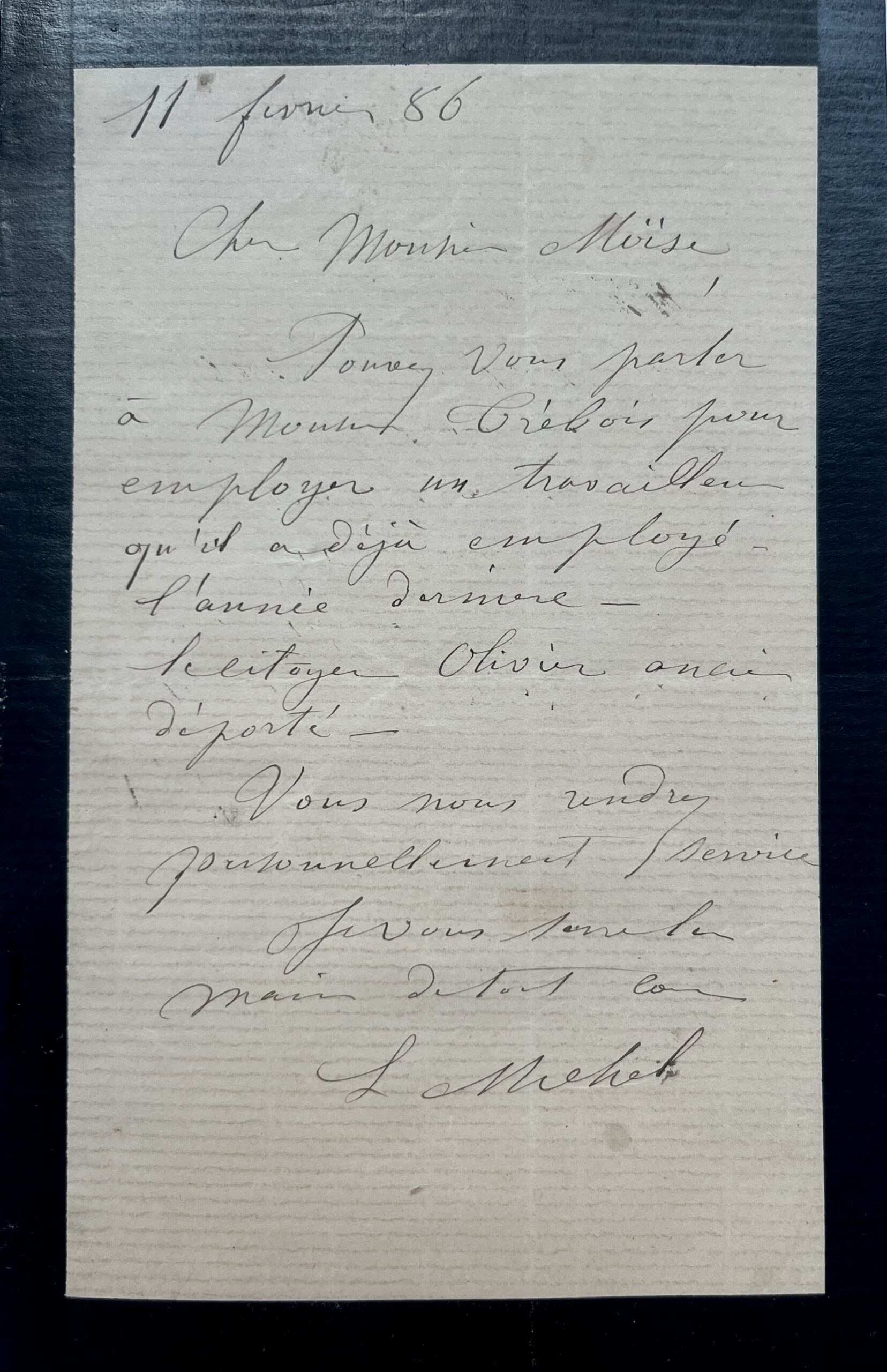 "Pouvez-vous parler à Monsieur Trébois [probablement Jean-Baptiste Trébois] pour employer un travailleur qu'il a déjà employé - l'année dernière - le citoyen Olivier ancien déporté. Vous nous rendrez personnellement service. Je vous serre la main de tout coeur. L Michel".