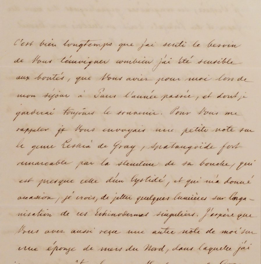 "[...] j'ai été très sensible aux bontés, que vous aviez pour moi lors de mon séjour à Paris l'année passée, et dont je garderai toujours le souvenir. Pour vous me rappeler je vous envoyais une petite note sur le genre Lesuia de Gray, spatangoïde fort remarquable par la structure de sa bouche, qui est presque celle d'un lystidé, et qui m'a donné occasion, je crois, de jetter quelques lumières sur l'organisation de ces échinodermes singuliers. J'espère que vous avez reçu aussi une autre note de moi sur une éponge de mers du Nord, dans laquelle j'ai cru reconnaître le genre hyalonema de Gray. Les opinions ont été si diverses sur cet être singulier, et on a été si unanimement d'accord de l'interpréter en sens inverse, comme je le crois, à la nature, que j'ai voulu profiter de l'occasion d'étudier avec un peu de soin cette éponge, qui fera mieux comprendre, je l'espère, ses congénères gigantesques des mers du Japon et du Portugal. Écrit en suédois mon travail restera peut être inconnu à vous, et c'est pourquoi vous en trouverez ci joint un extrait [...]".