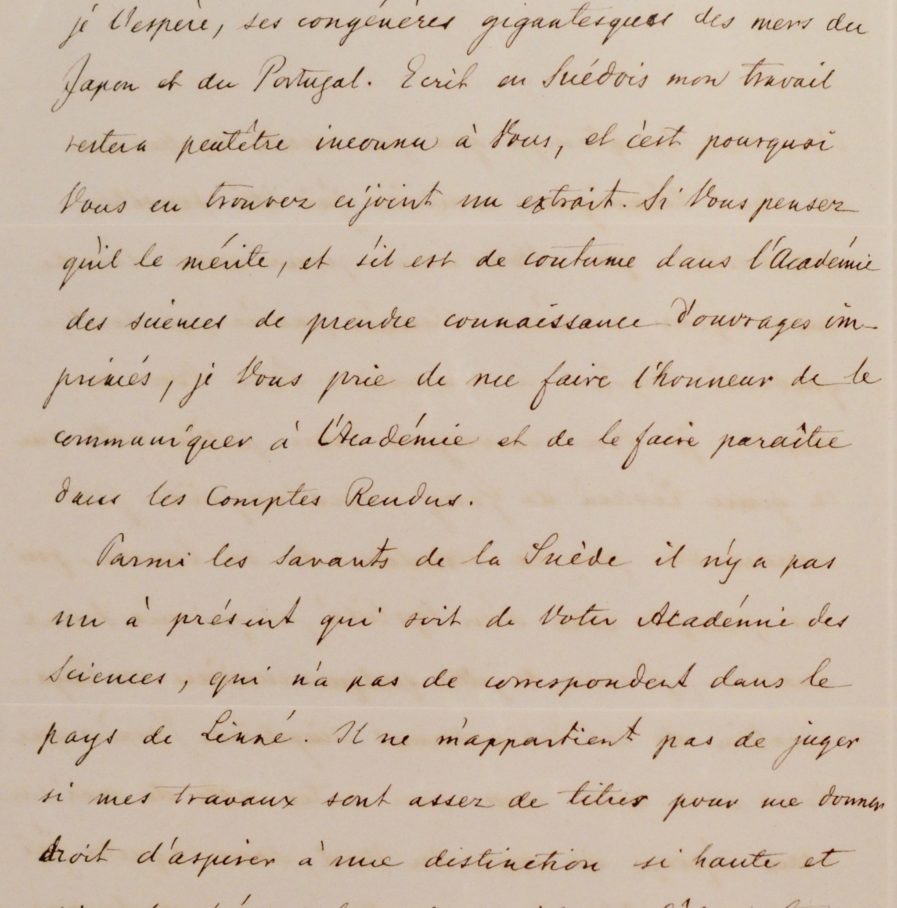 Il souhaite que son correspondant fasse connaitre ce travail à l'Académie des sciences, et ajoute qu'il serait honoré de devenir le correspondant suédois de l'Académie des sciences française :"Paris les savants de la Suède il n'y a pas un à présent qui soit de votre Académie des sciences, qui n'a pas de correspondant dans le pays de Linné. Il ne m'appartient pas de juger si mes travaux sont assez de titres pour me donner droit d'aspirer à une distinction si haute et si recherchée, et qui seroit peut être trop au dessus des faibles services que j'ai pu rendre à la science, mais je dois dire, que si elle me fût conférée, j'en serais profondément reconnaissant, non seulement de ma propre part,mais surtout à cause de l'importance qu'elle donnerait à mes efforts pour les progrès de la zoologie dans ma partie et pour son Musée central, dont je suis un des administrateurs [...]".