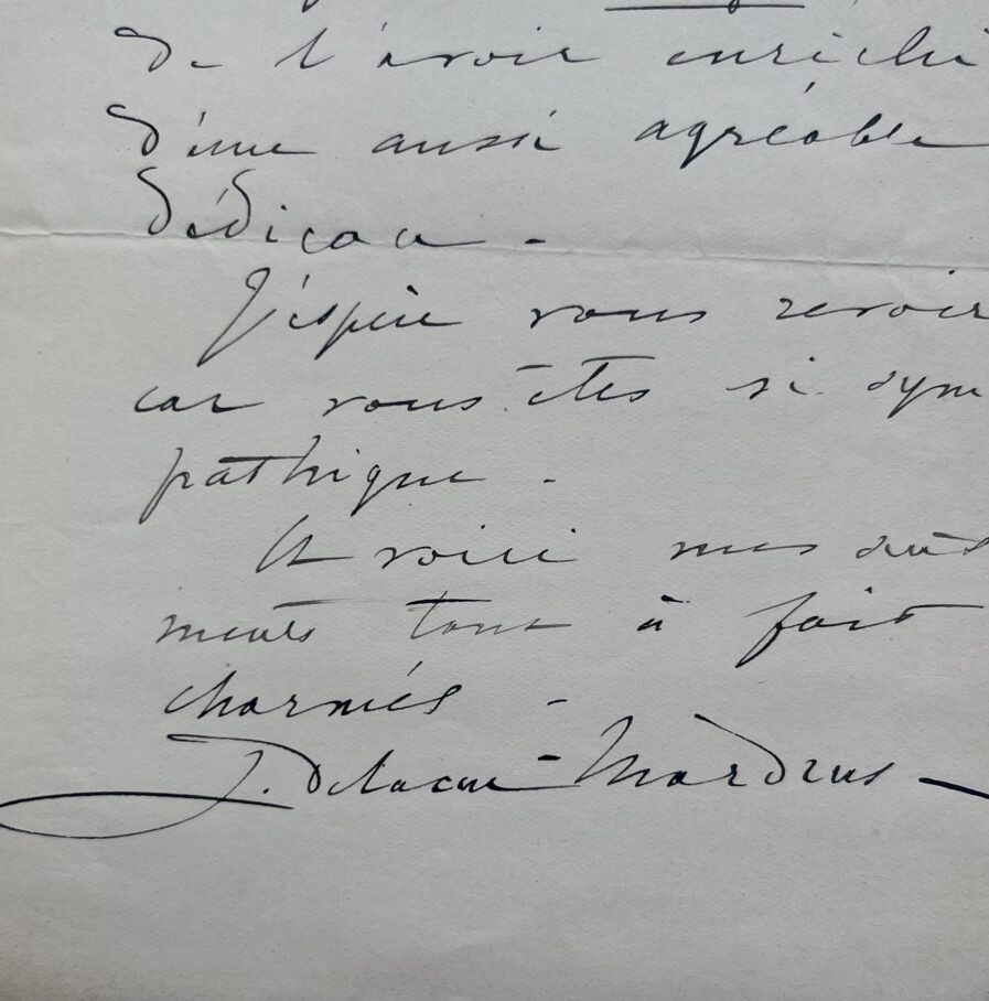 Lucie Delarue-Mardrus (Honfleur, 1874/1945)"Cher Docteur. Votre ouvrage sur Littré m’a bien émue. J’aime qu’il ait travaillé avec des enfants jouant sous sa table. Votre polémique à propos de ses derniers moments est un document bien classique ; et ce baptême in extremis donné par sa femme est une scène bien émouvante. Le mourant, en effet, n'est-il pas pareil au nouveau-né ? Ni l’un ni l’autre ne sont responsables des gestes magiques accomplis sur leur tête. Merci de m’avoir envoyé cet Eloge, et de l’avoir enrichi d’une aussi agréable dédicace. J’espère vous revoir, car vous êtes si sympathique. Et voici mes sentiments tout à fait charmés. L. Delarue-Mardrus".