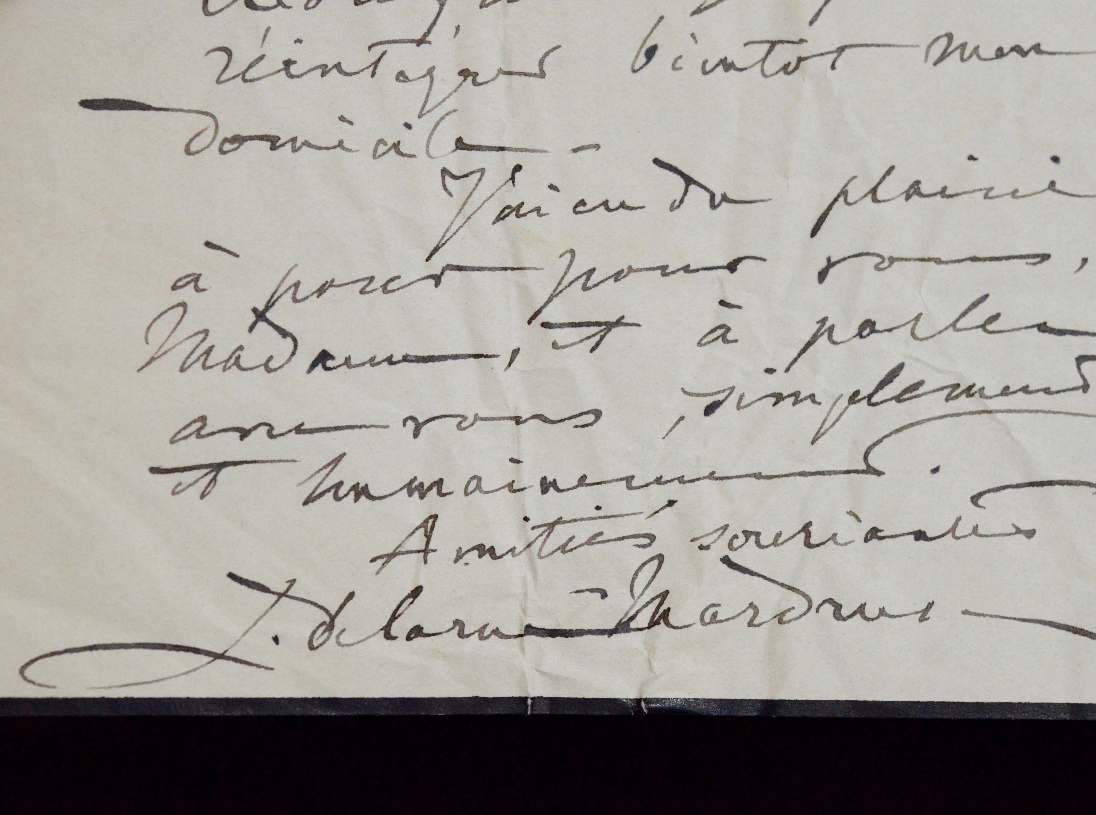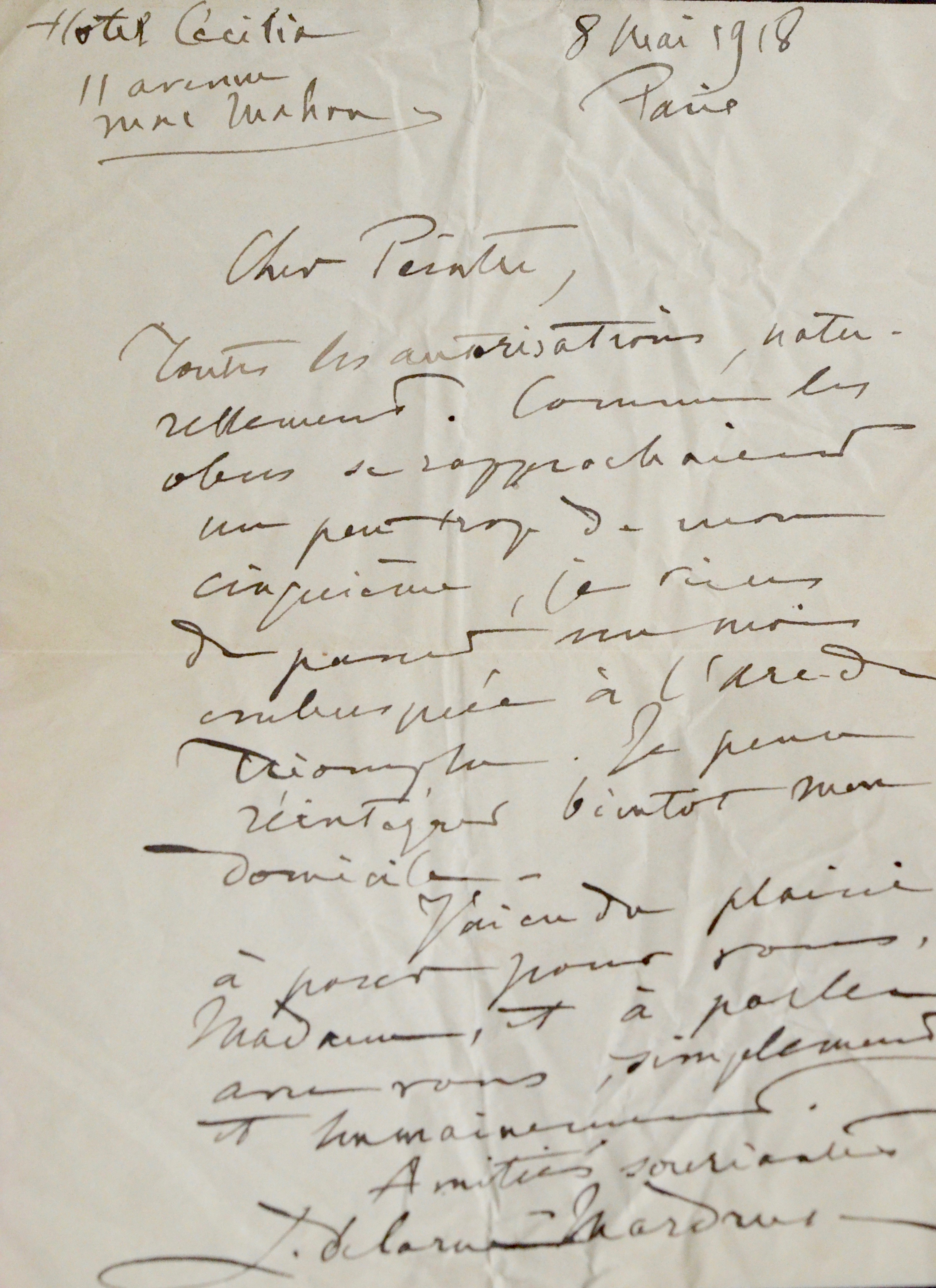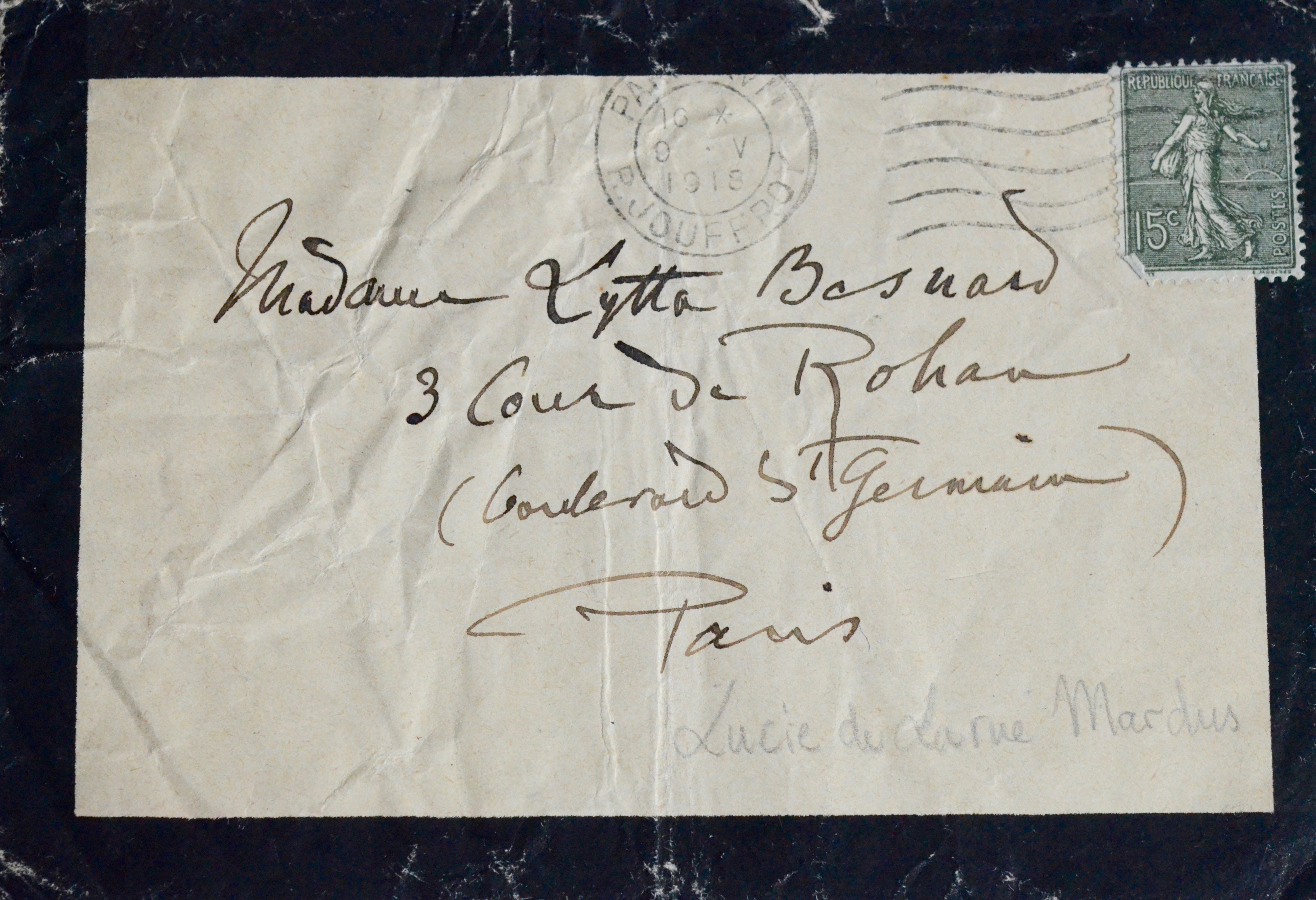 Lucie Delarue-Mardrus (Honfleur, 1874/1945)"Cher peintre. Toutes les autorisations, naturellement. Comme les obus se rapprochaient un peu trop de mon cinquième, je viens de passer un mois embusqué à l'Arc-de-triomphe. Je pense réintégrer bientôt mon domicile. J'ai eu du plaisir à poser pour vous Madame, et à parler avec vous, simplement et humainement. Amitiés souriantes [...]".