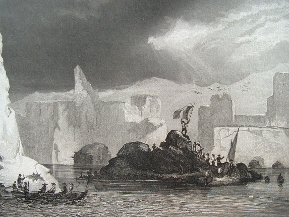 Gravure de Terre Adélie extraite de la France Maritime [il s'agit de l'une des permières vues de cette contrée découverte par Dumont d'Urville en 1840]. Gravure sur acier par Rouargue, d'après le dessin de Le Breton.