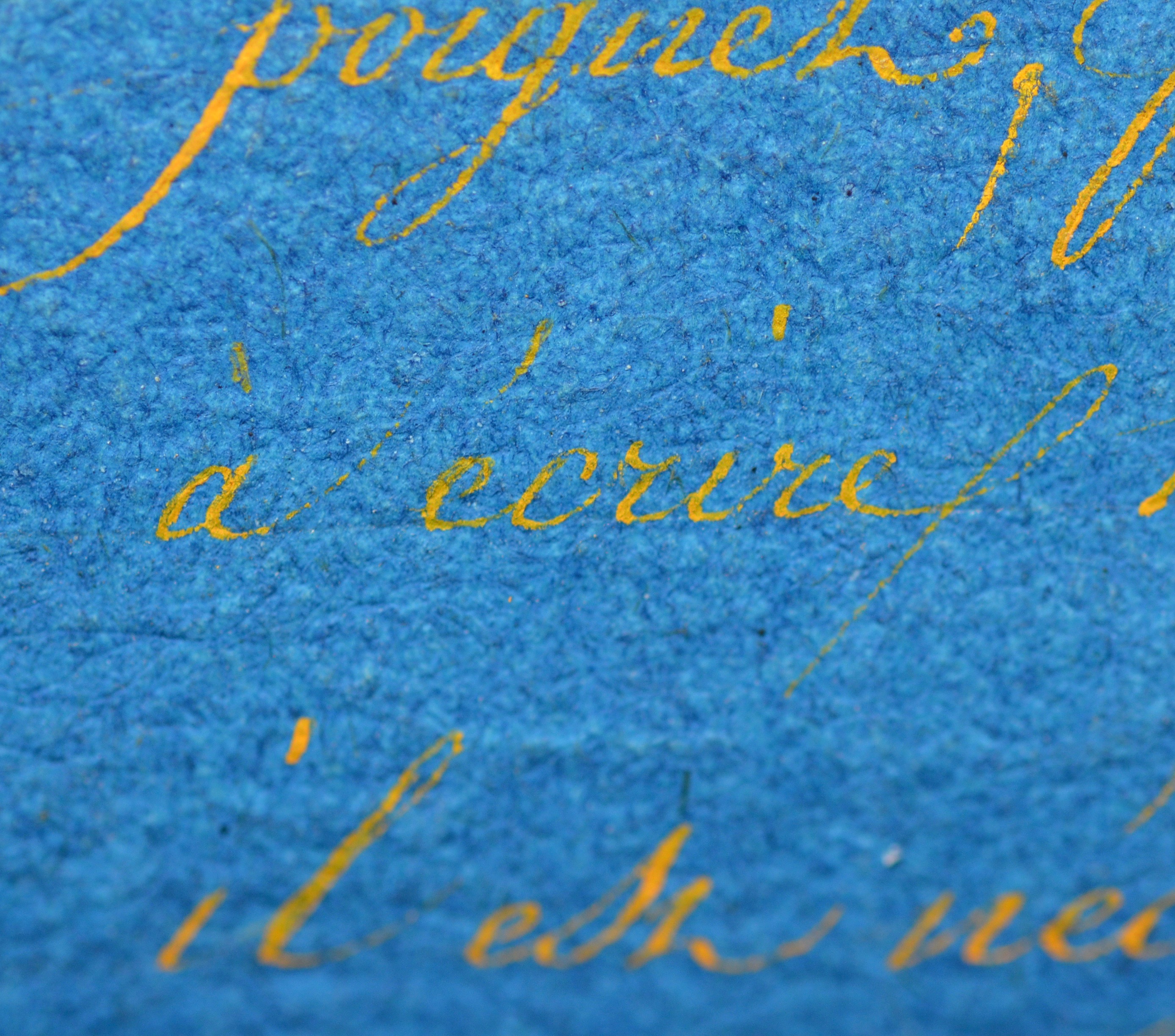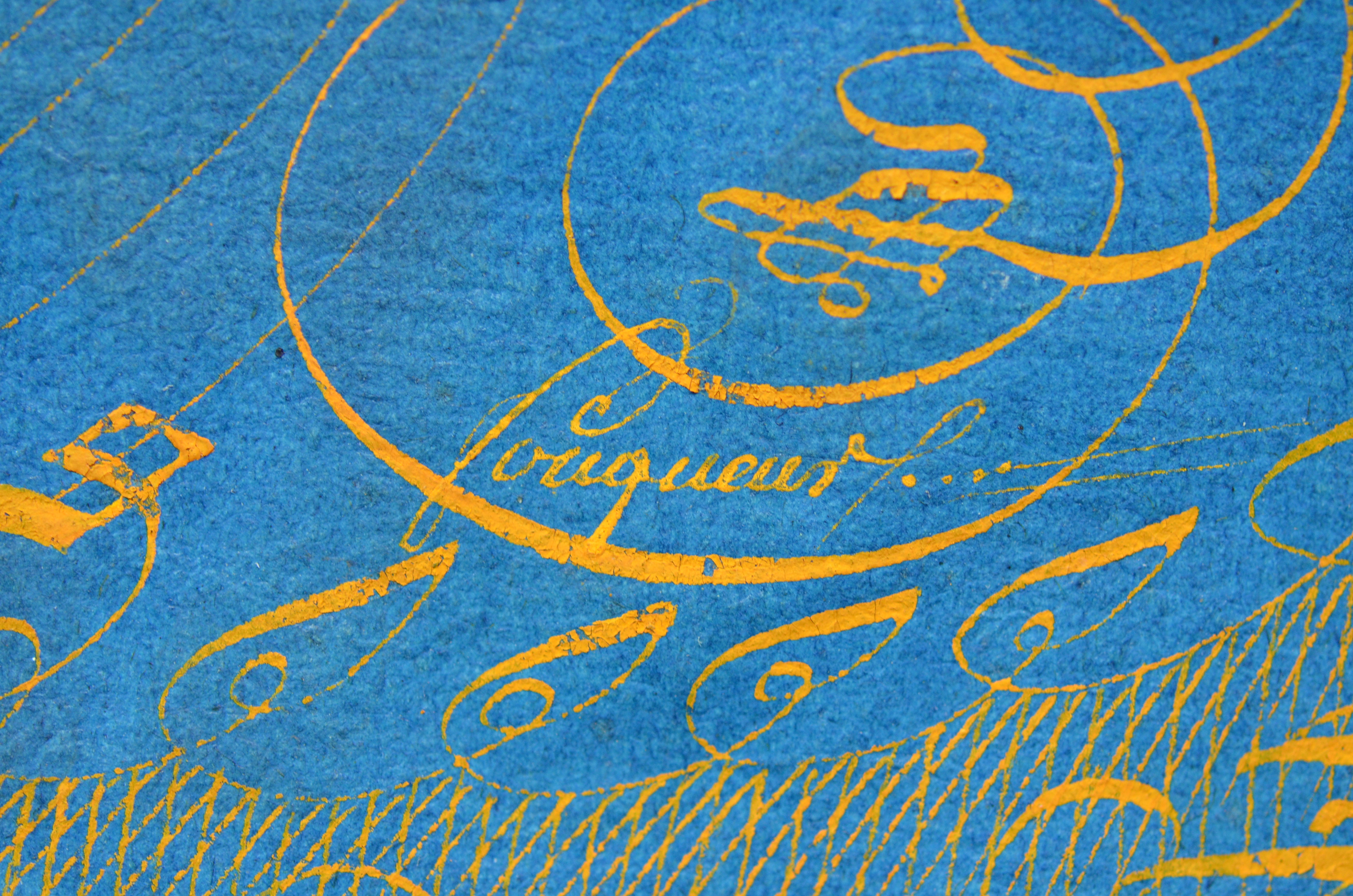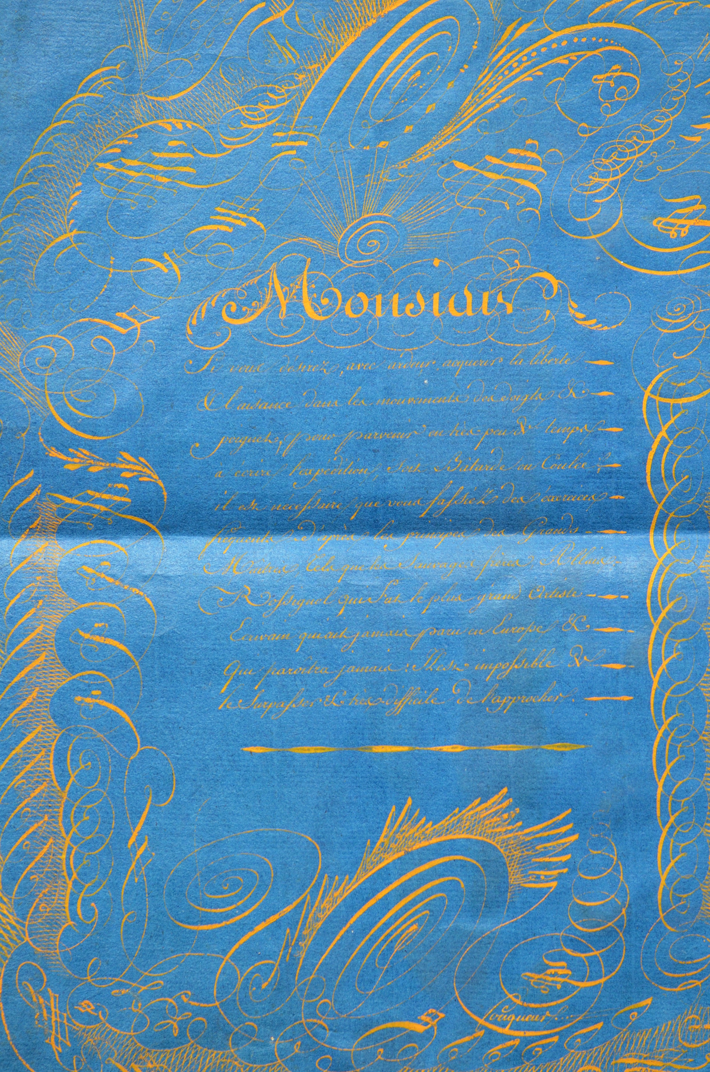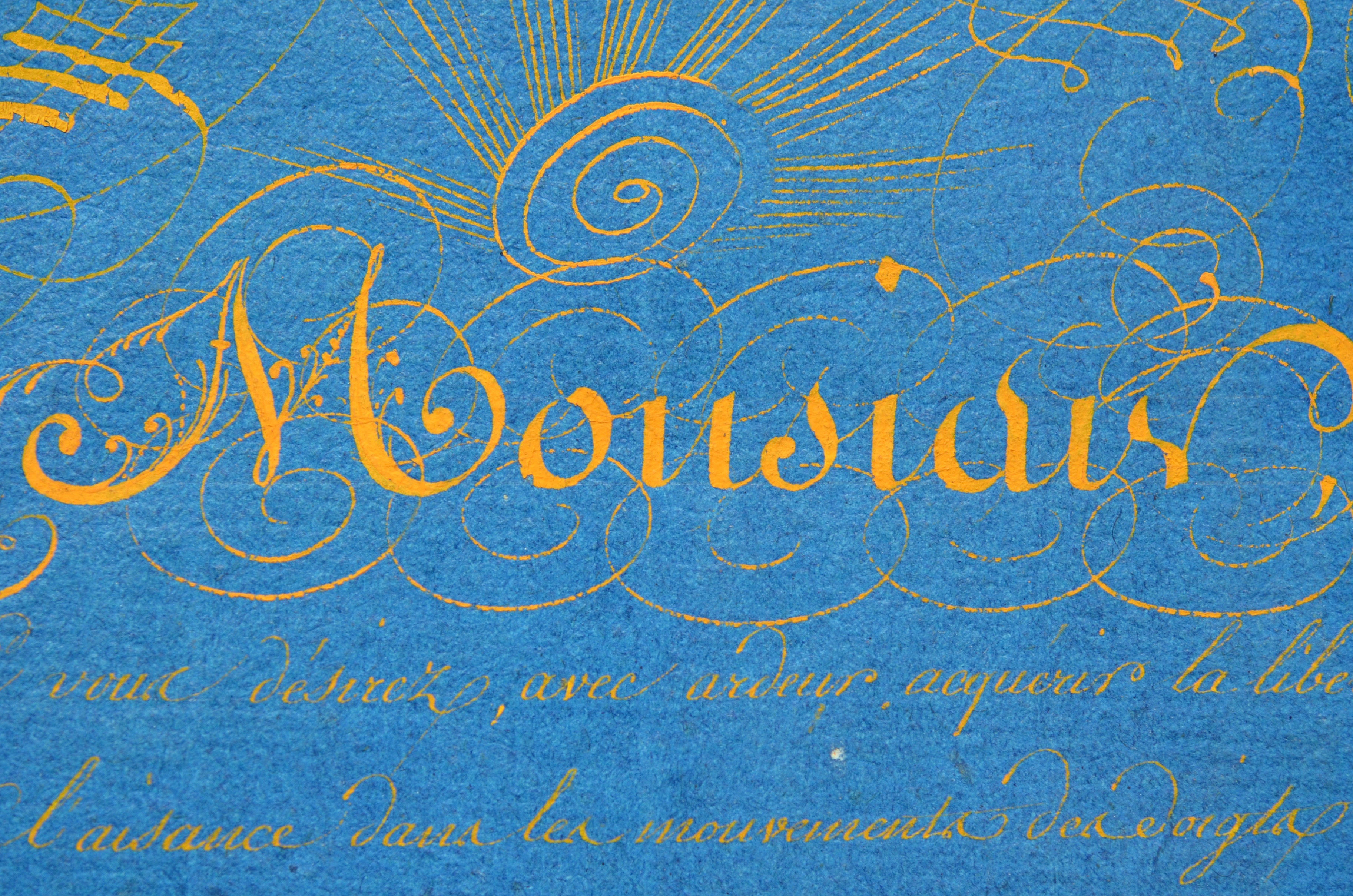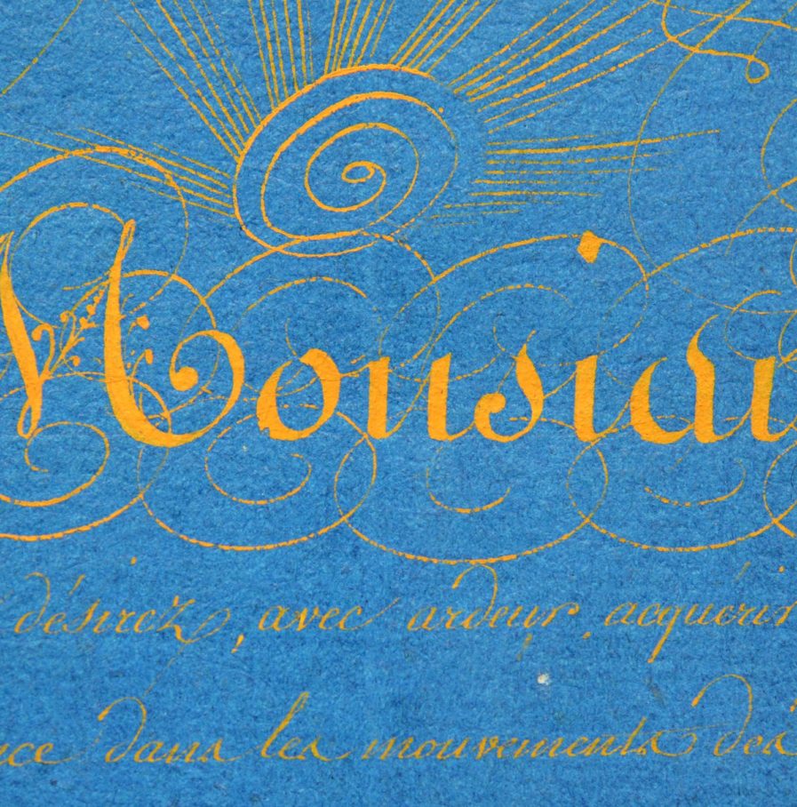 Magnifique calligraphie en couleur de Fouqueur (1786/1841), réalisée sur fond bleu roi, rendant hommage à son maître calligraphe, Louis Rossignol (1694/1739).