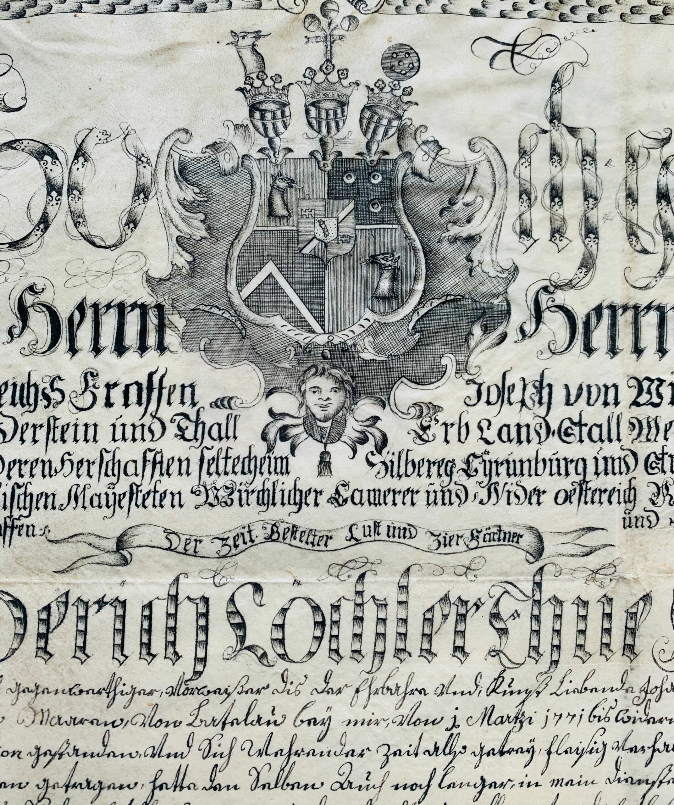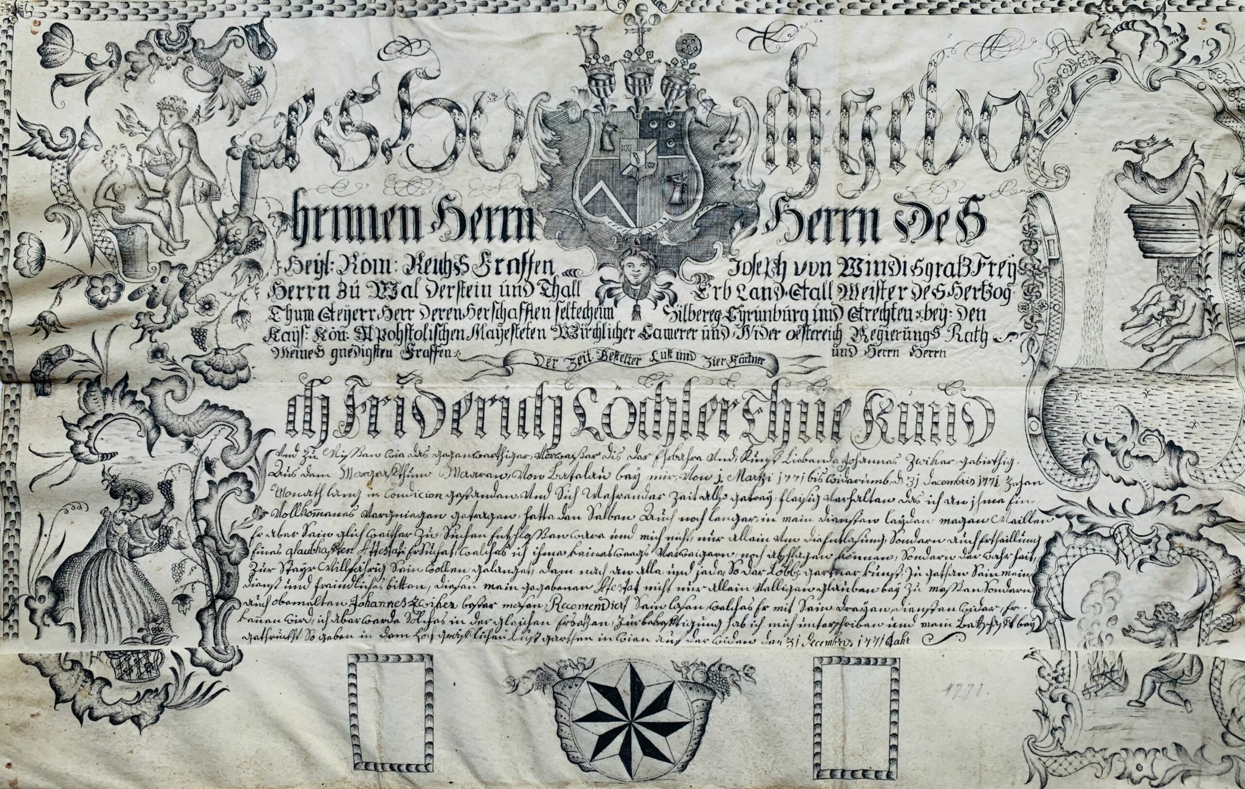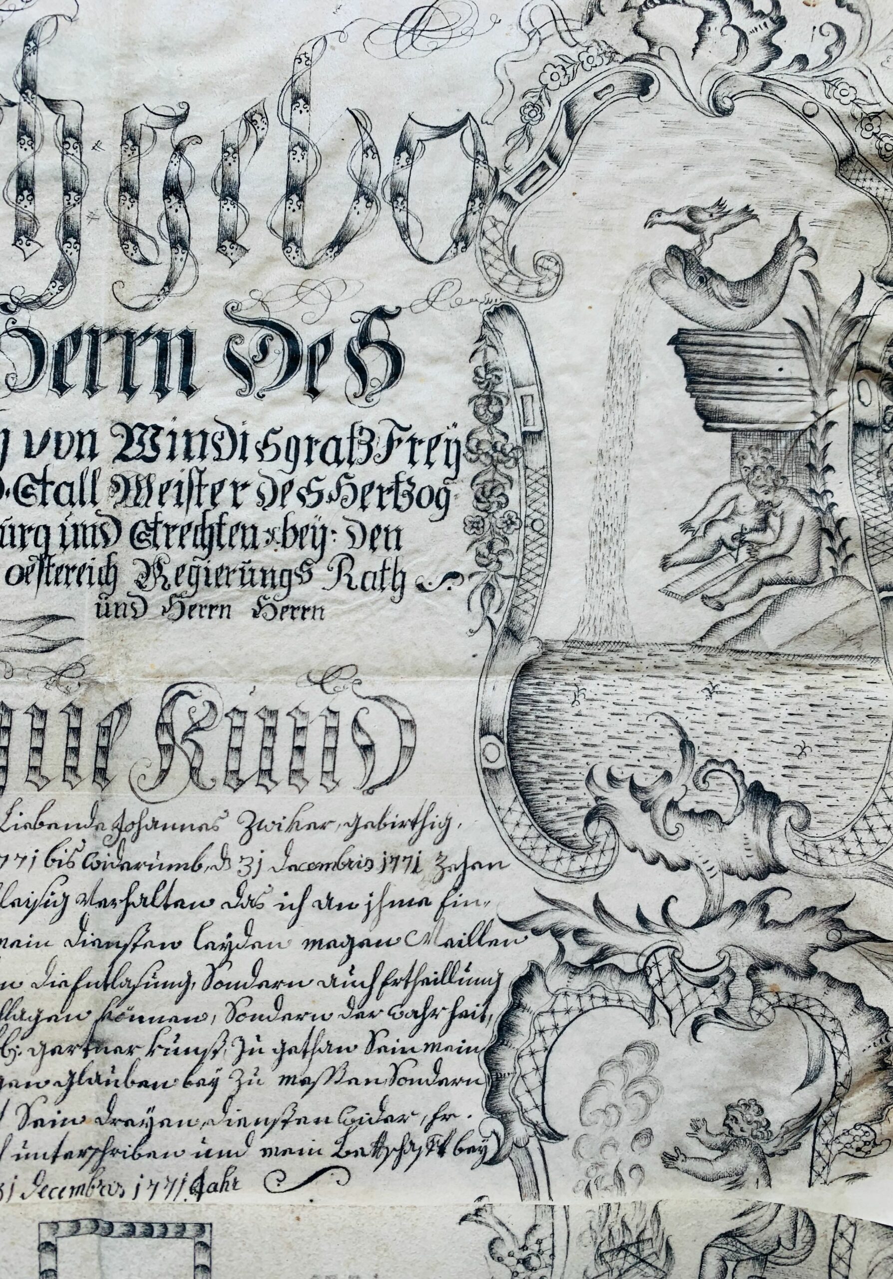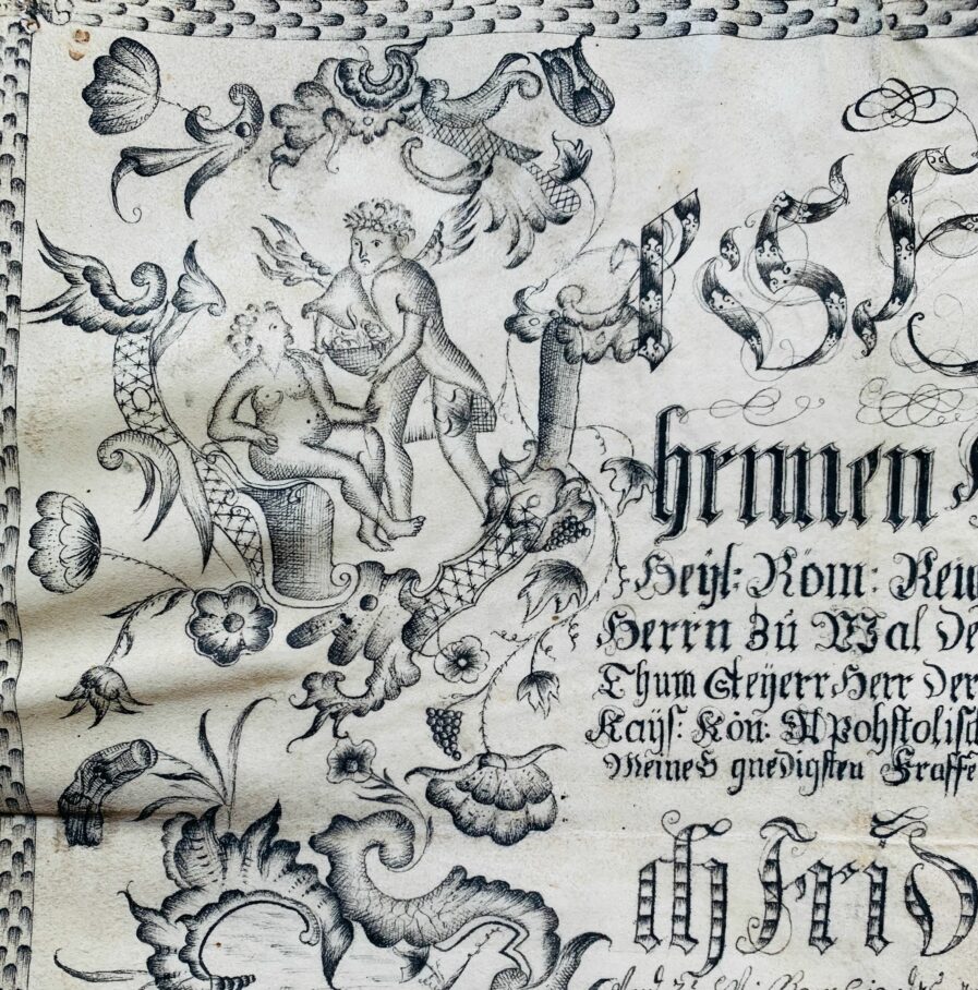 Superbe charte de mariage allemande calligraphiée, ornée, tout autour du texte de fins dessins allégoriques à la plume (cornes d'abondance, armoiries, symboles de fertilité et de fécondité, etc.) : femmes cueillant du raisin, femme enceinte, enfants jouant sous une fontaine, etc.