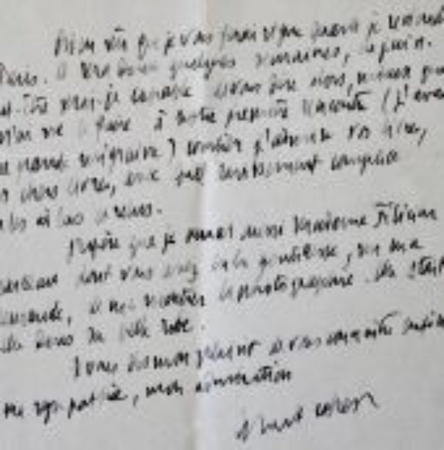 "Six heures du matin, tasse de thé chaud, cigarette, et votre lettre devant moi. Petit sentiment de bonheur. Vous avez donc pensé à moi. C'est bien. Je suis content aussi que vous aimiez le Livre de ma mère [...]. Vous avez deviné certaines choses que j'étais seul à connaître". Il est heureux d'apprendre que Félicien Marceau va publier un article sur son livre dans la Table Ronde. "Il y en a eu de bienveillants déjà. On m'en annonce d'autres. Mais le vôtre sera le plus beau, je le sais. Donc merci. Je viens de lire dans les Lettres Françaises un long feuilleton sur mon livre. Il est méchant et par endroits curieusement élogieux. L'auteur du feuilleton, M. André Wurmser, dit qu'il aime et n'aime pas mon livre. Il me reproche de n'avoir pas écrit un livre raisonnable ; ou peut-être, au fond, de n'être pas communiste. Bien sûr que je vous ferai signe quand je reviendrai à Paris. Ce sera dans quelques semaines, en juin. Peut-être serai-je capable de vous dire alors, mieux que je n'ai su le faire à notre première rencontre (j'avais une grande migraine) combien j'admire vos livres, vos chers livres, avec quel ravissement complice je les ai lus et relus [...]. Je vous dis mon plaisir de vous connaître enfin, ma sympathie, mon admiration".