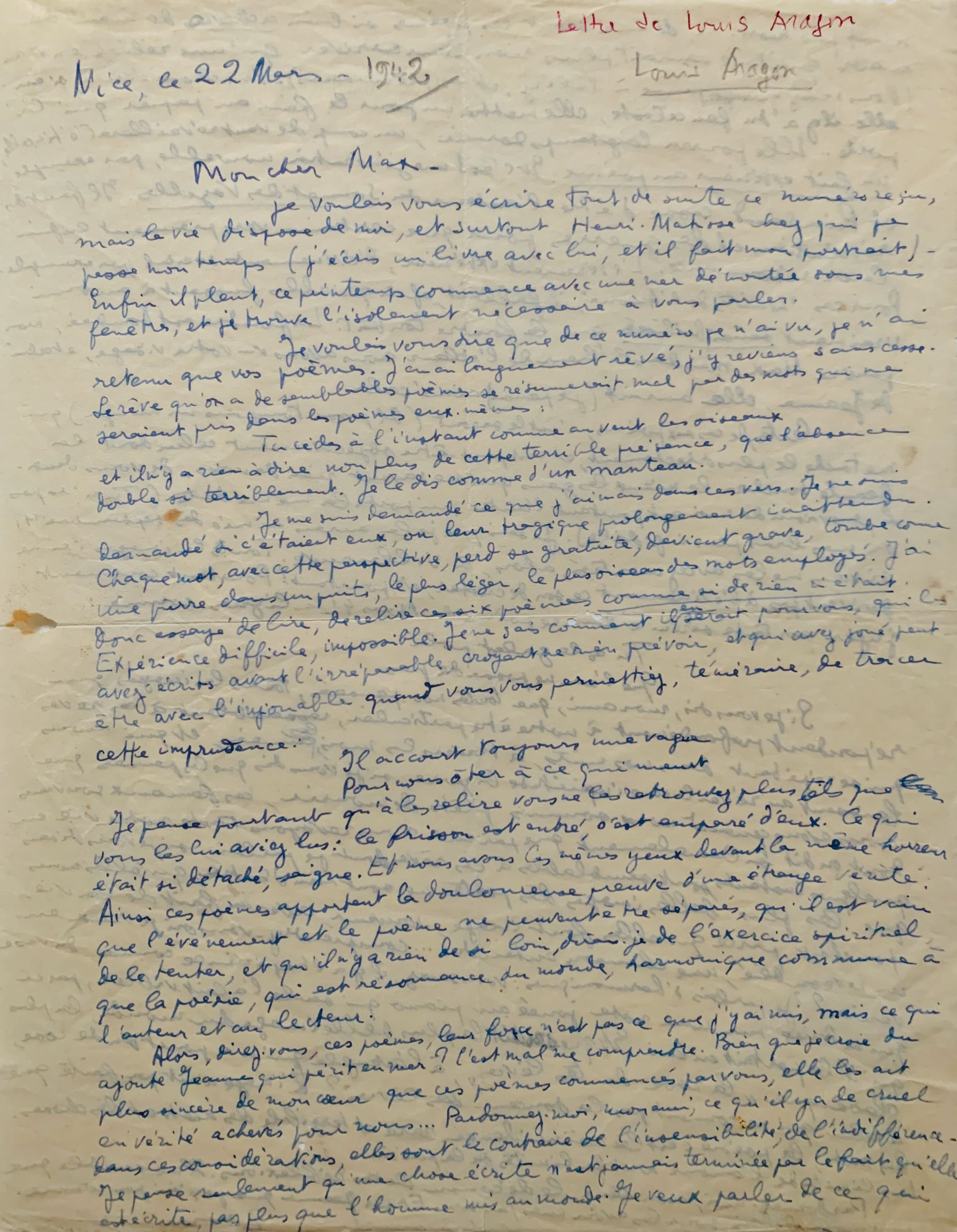 Magnifique lettre d’Aragon à Max-Pol Fouchet, véritable profession de foi du poète