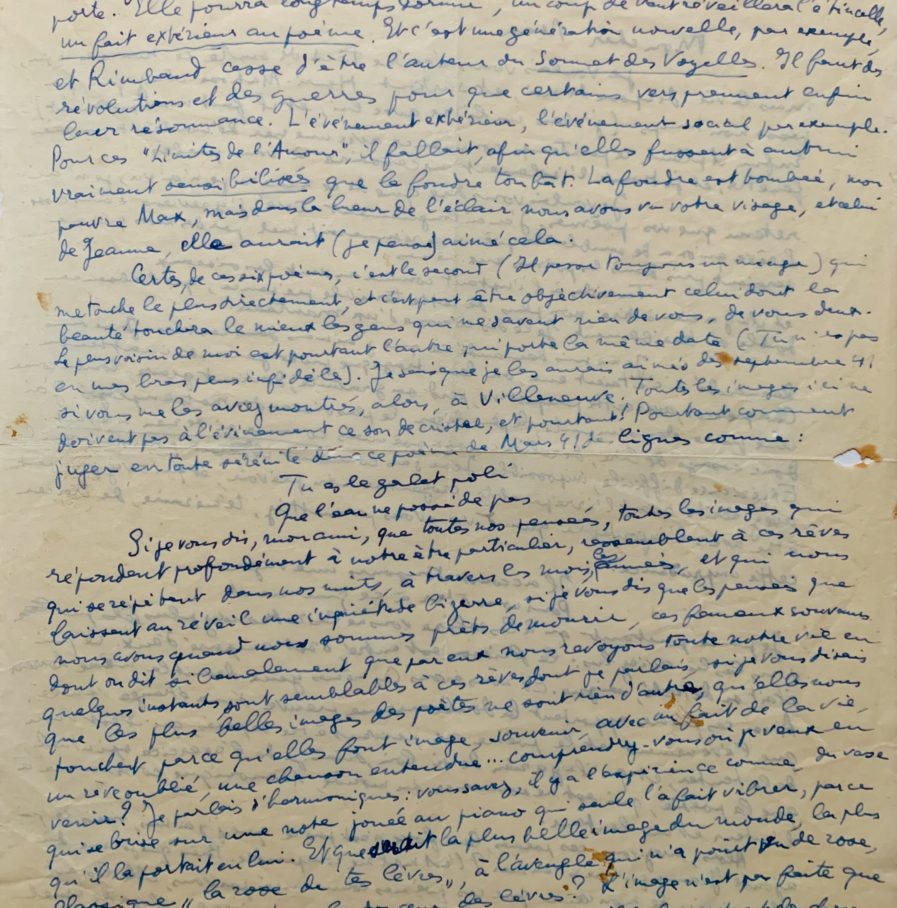 Je me suis demandé ce que j'aimais dans ces vers. Je me suis demandé si c'était eux, ou leur tragique prolongement inattendu. Chaque mot, avec cette perspective, perd sa gratuité, devient grave, tombe comme une pierre dans un puits, le plus léger, le plus oiseau des mots employés. J'ai donc essayé de lire, de relire ces six poèmes comme si de rien n'était [...]. Le frisson est entré, s'est emparé d'eux. Ce qui était si détaché, saigne. Et nous avons les mêmes yeux devant la même horreur. Ainsi ces poèmes apportent la douloureuse preuve d'une étrange vérité : que l'événement et le poème ne peuvent être séparés, qu'il est vain de le tenter, et qu'il n'y a rien de si loin, dirai-je de l'exercice spirituel, que la poésie, qui est résonance du monde, harmonique commune à l'auteur et au lecteur. Alors, direz-vous, ces poèmes, leur force n'est pas ce que j'y ai mis, mais ce qui ajoute Jeanne qui périt en mer? C'est mal me comprendre. Bien que je croie du plus sincère de mon coeur que ces poèmes commencés par vous, elle les ait en vérité achevés pour vous... Pardonnez-moi, mon ami, ce qu'il y a de cruel dans ces considérations, elles sont le contraire de l'insensibilité, de l'indifférence. Je pense seulement qu'une chose écrite n'est jamais terminée par le fait qu'elle est écrite, pas plus que l'homme mis au monde. Je veux parler de ce qui n'est pas mort-né, comme sont ces poèmes si bien achevés de main de maître [...] (vous savez que je pense à Valéry, et ses précurseurs). Une chose écrite, si en elle il y a du feu céleste, elle mettra un jour le feu au papier qui la porte. Elle pourra longtemps dormir, un coup de vent réveillera l'étincelle, un fait extérieur au poème. Et c'est une génération nouvelle, par exemple, et Rimbaud cesse d'être l'auteur du Sonnet des Voyelles. Il faut des révolutions et des guerres pour que certains vers prennent enfin leur résonance. L'événement extérieur, l'événement social par exemple. Pour ces "Limites de l'Amour", il fallait, afin qu'elles fussent à autrui vraiment sensibilisées que la foudre tombât. La foudre est tombée, mon pauvre Max, mais dans la lueur de l'éclair nous avons vu votre visage, et celui de Jeanne, elle aurait (je pense) aimé cela.