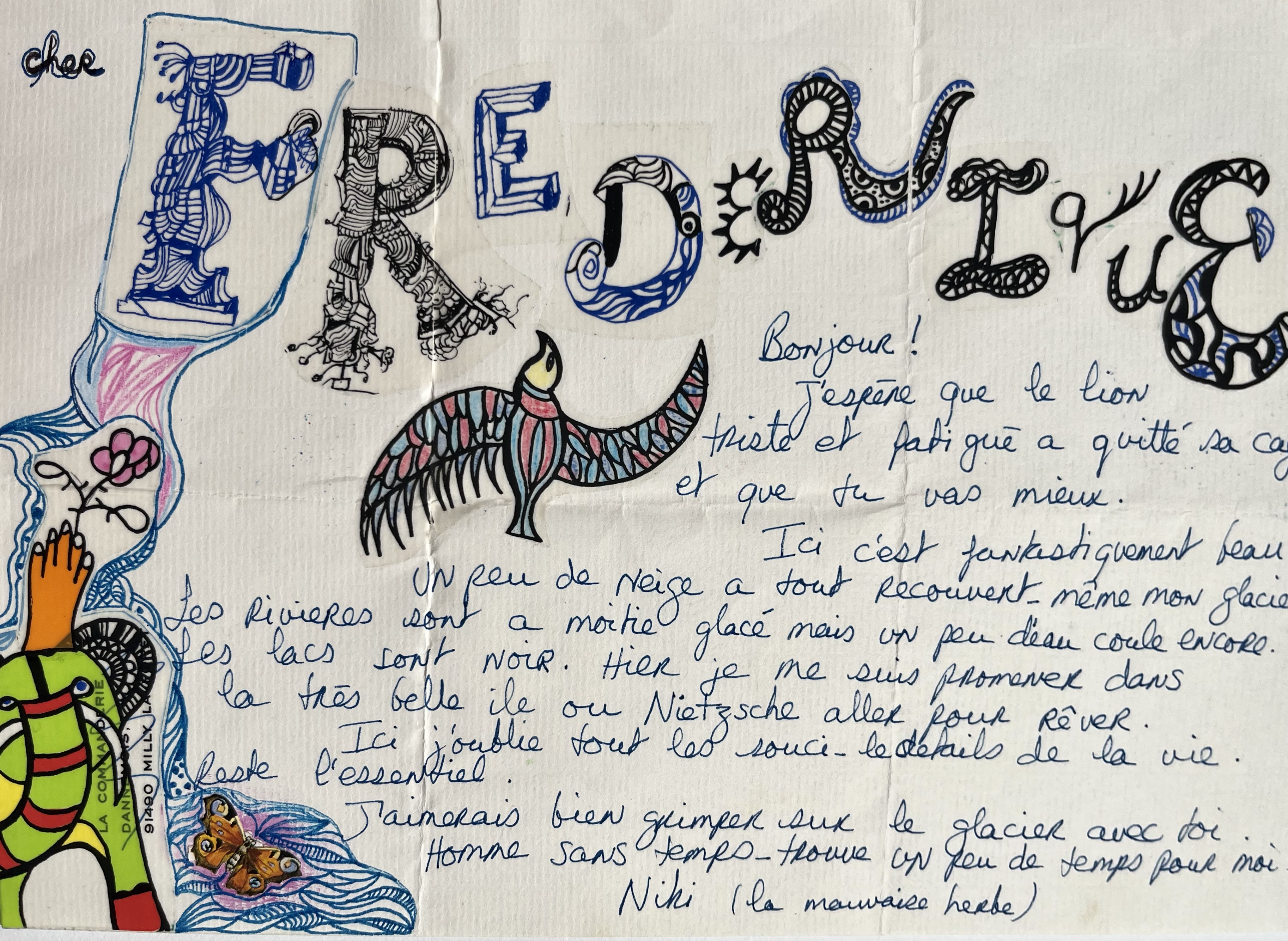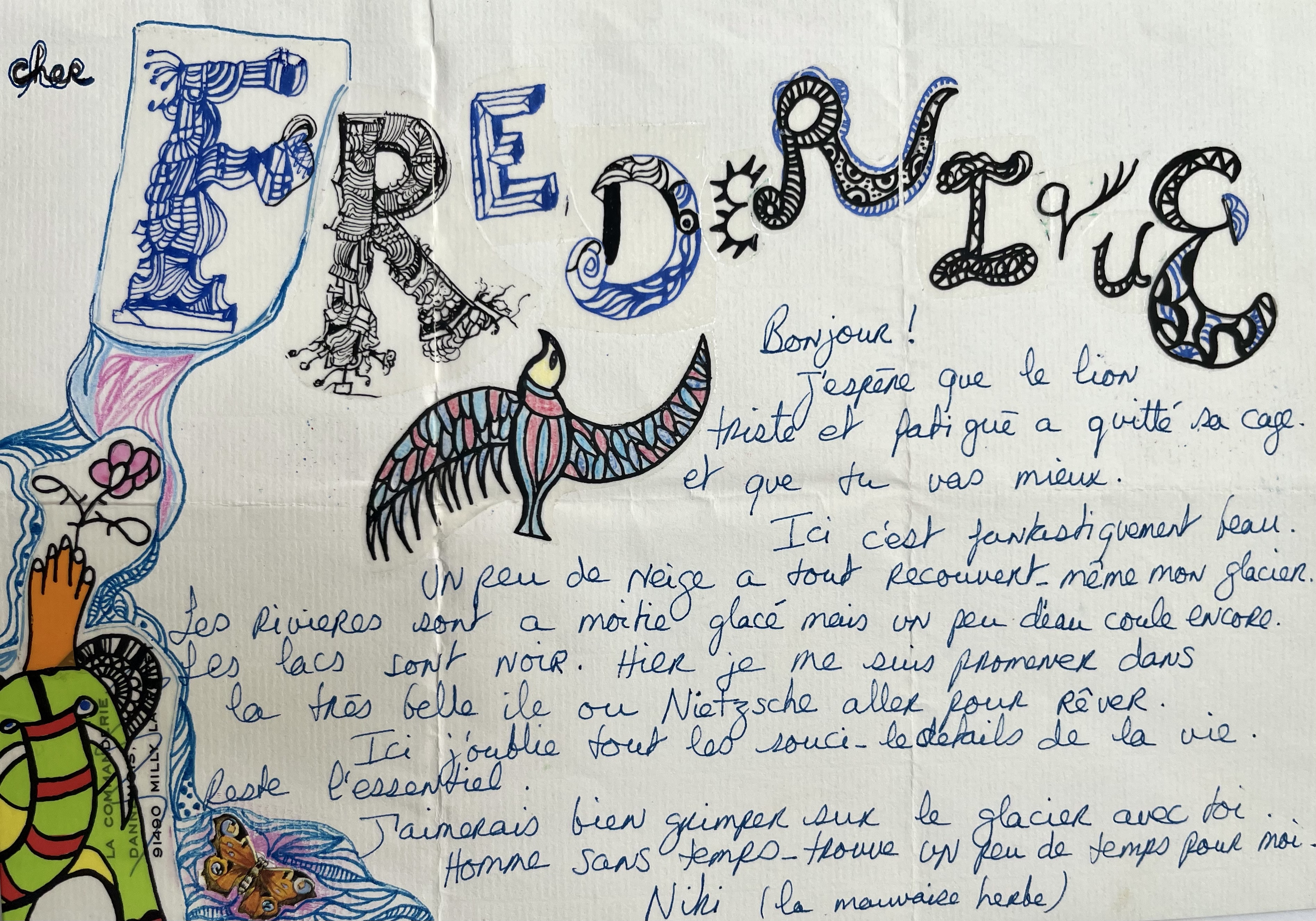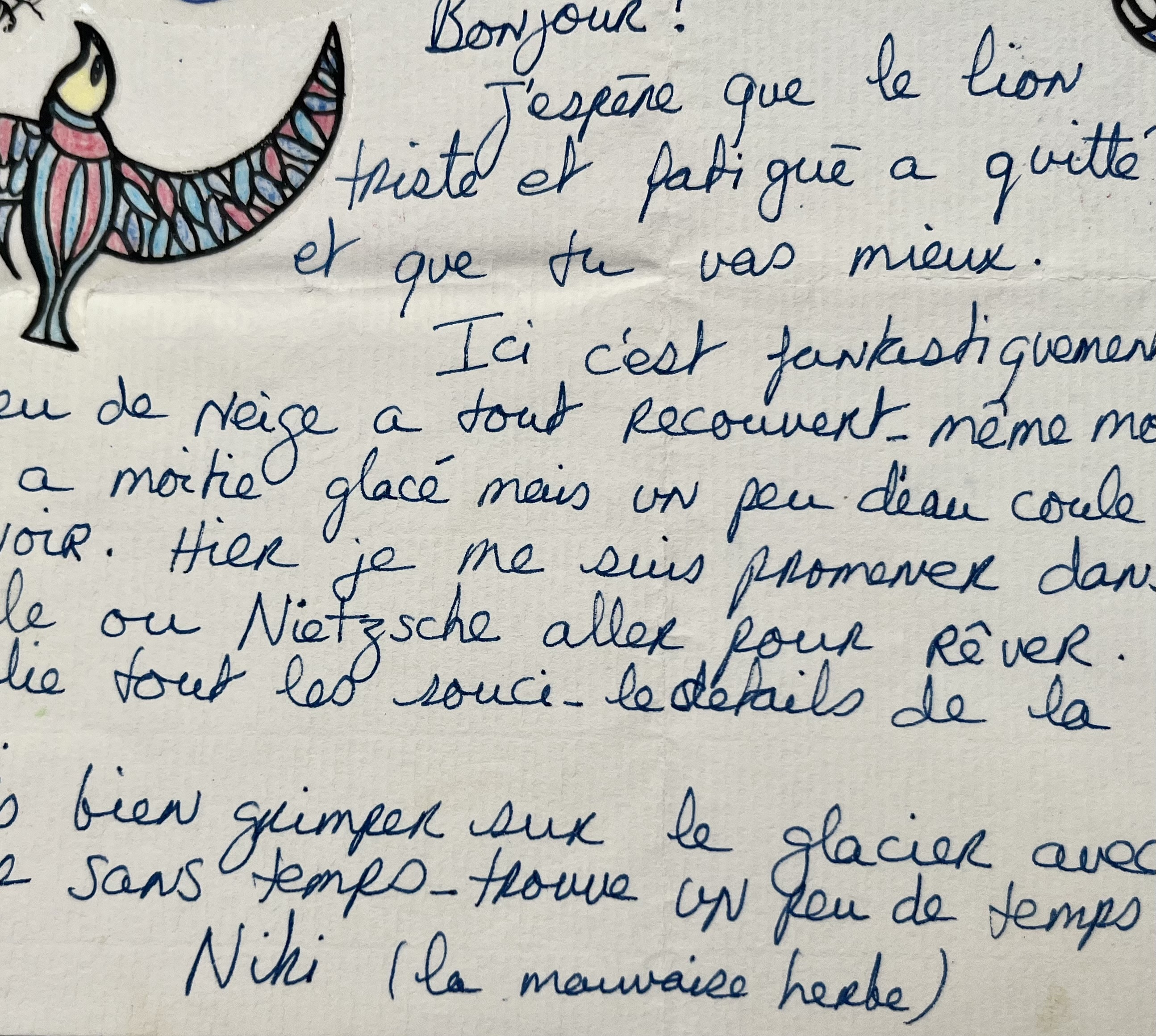 "Bonjour ! J'espère que le lion triste et fatigué a quitté sa cage et que tu vas mieux. Ici c'est fantastiquement beau. Un peu de neige a tout recouvert - même mon glacier. Les rivières sont à moitié glacé mais un peu d'eau coule encore. Les lacs sont noir. Hier je me suis promener dans la très belle île ou Nietzsche aller pour rêver. Ici j'oublie tout les souci - le détail de la vie. Reste l'essentiel. J'aimerais bien grimper sur le gracier avec toi. Homme sans temps - trouve un peu de temps pour moi. Niki (la mauvaise herbe)".